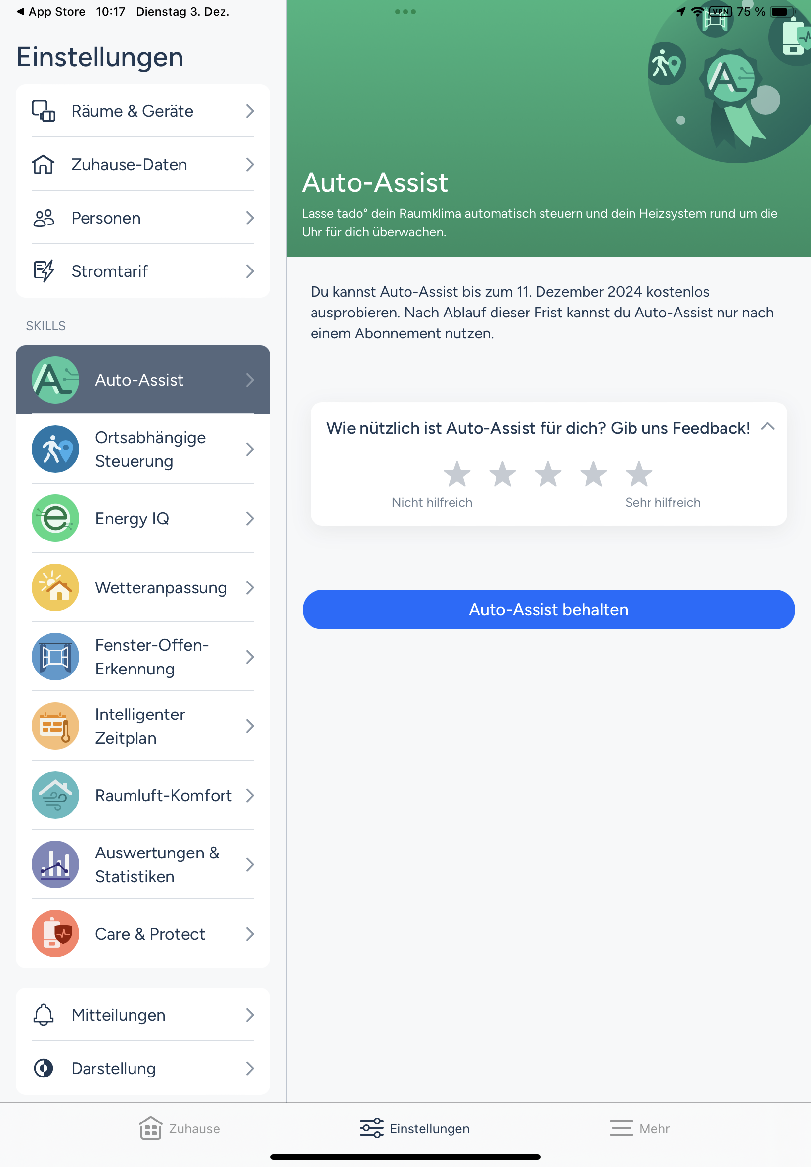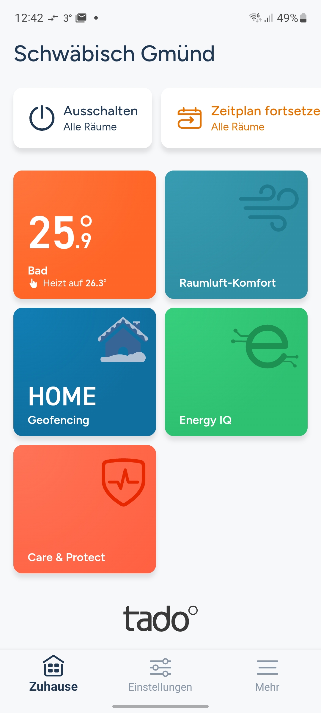 Mit der Tado-App stehen sämtliche Funktionen wie Heizpläne, Auswertungen und Statistiken zum Temperatur- und Heizverlauf zur Verfügung. Mit dem für 4 Euro monatlich oder 30 Euro jährlich kostenpflichtigen Abo stehen weitere Funktionen zur Verfügung. Sie umfassen ein automatisches Geofencing, womit je nach Standort das Thermostat an- oder ausgeschaltet wird, sowie eine automatisierte Fenster-Offen-Erkennung. Hat man kein Abo abgeschlossen, stehen diese Funktionen aber dennoch zur Verfügung. Allerdings erreichen dann nur Push-Meldungen den Anwender, und er muss manuell eingreifen. Mit Care Protect und Energy IQ stellt das Abo weitere Funktionen zur Verfügung. Erstere bietet eine vorzeitige Störungserkennung der Heizungsanlage und benachrichtigt bei ungewöhnlichem Verhalten, während letztere Daten zum Verbrauch liefert, Ersparnisse anzeigt und einen Kostensimulator bietet. Grundsätzlich bietet die Tado-App auch ohne Abo schon mehr als manche Mitbewerber. So muss man bei Bosch etwa auf Verlaufsgrafiken in puncto Heizleistung und Temperatur verzichten.