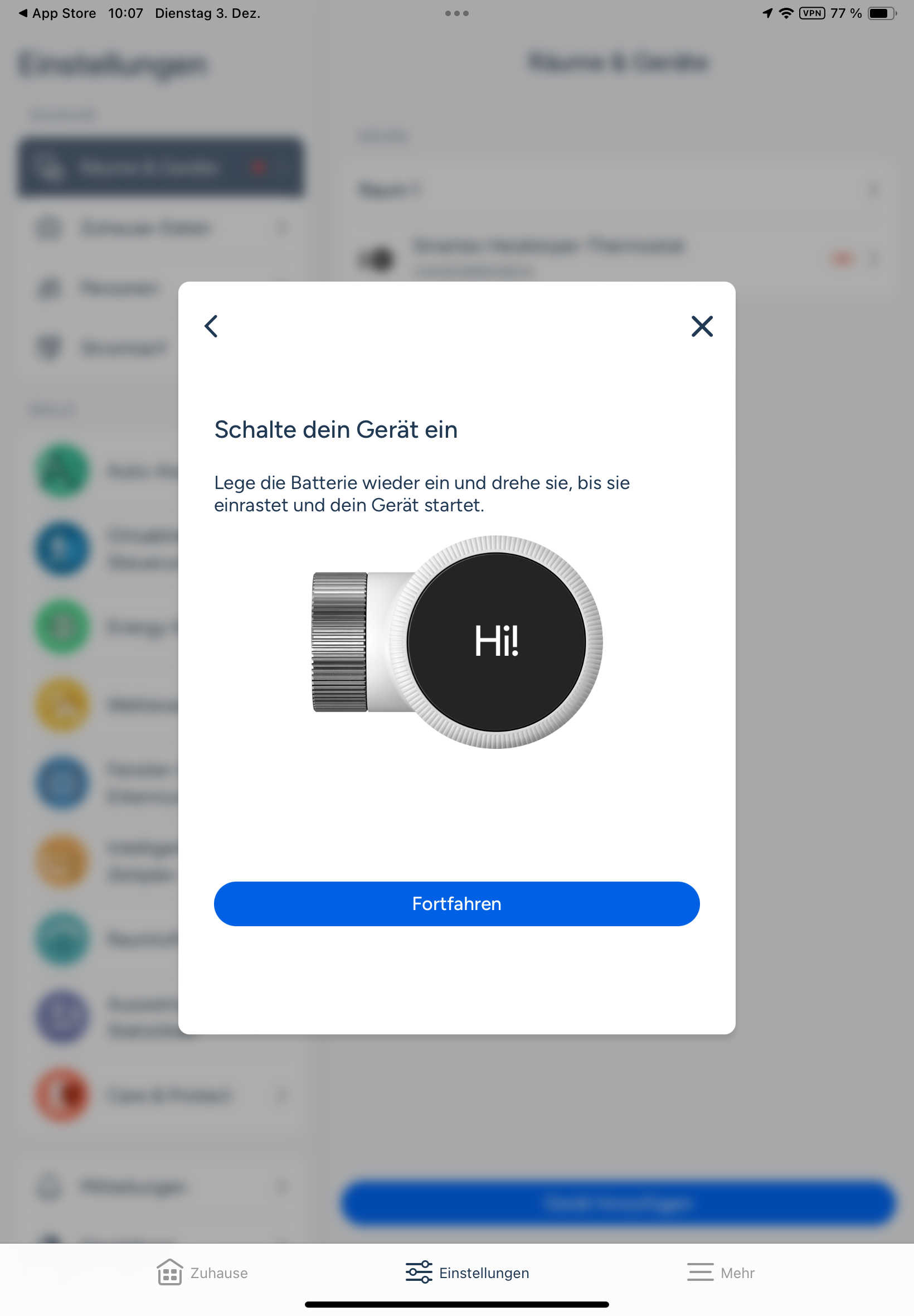 Bosch Heizkörper-Thermostat II: Mit der Smart-Home-App von Bosch wird das Thermostat in Betrieb genommen. Eine Registrierung ist erst nötig, wenn man die an die Bosch-Cloud gebundenen Partnerfunktionen wie Sprachsteuerung (Amazon, Google) oder Homekit nutzen möchte.