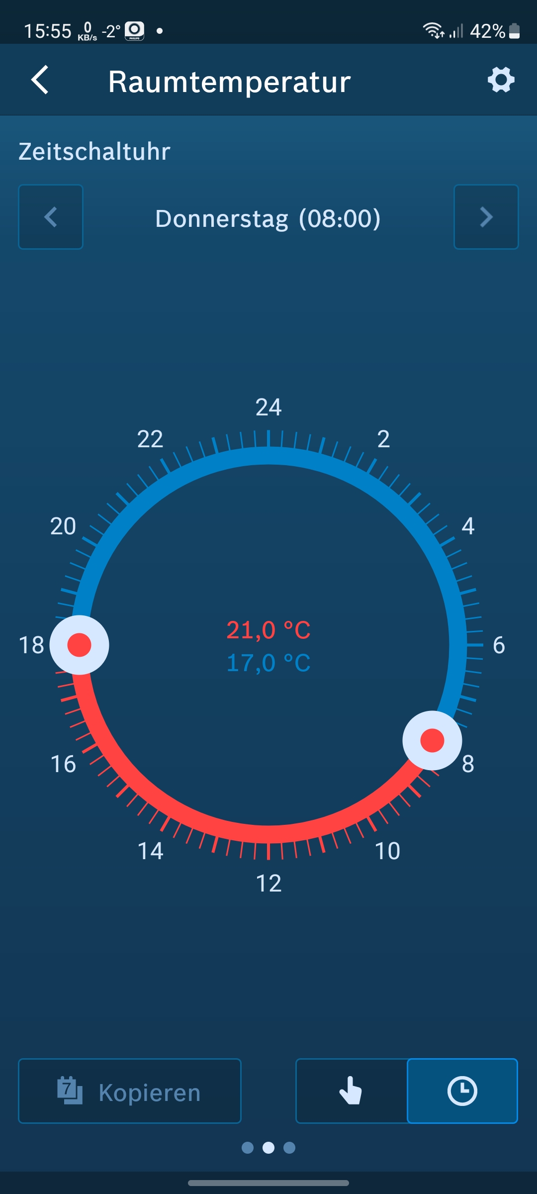 Nun geht es an die Erstellung der Heizpläne. Diese lassen sich komfortabel in der App über Touchregler im Abschnitt Raumtemperatur einstellen. Hier definiert man zunächst die Dauer der Heizperiode, die in der App mit Warmphase bezeichnet wird. Pro Tag lassen sich bis zu sechs Heizperioden konfigurieren. Fürs Büro reicht uns eine Warmphase, die wir für 8 und 18 Uhr festlegen. Wer einen Heizplan für einen Tag erstellt hat, kann die Einstellungen mit einem Tippen auf Kopieren auf andere Wochentage übertragen – sehr praktisch.
