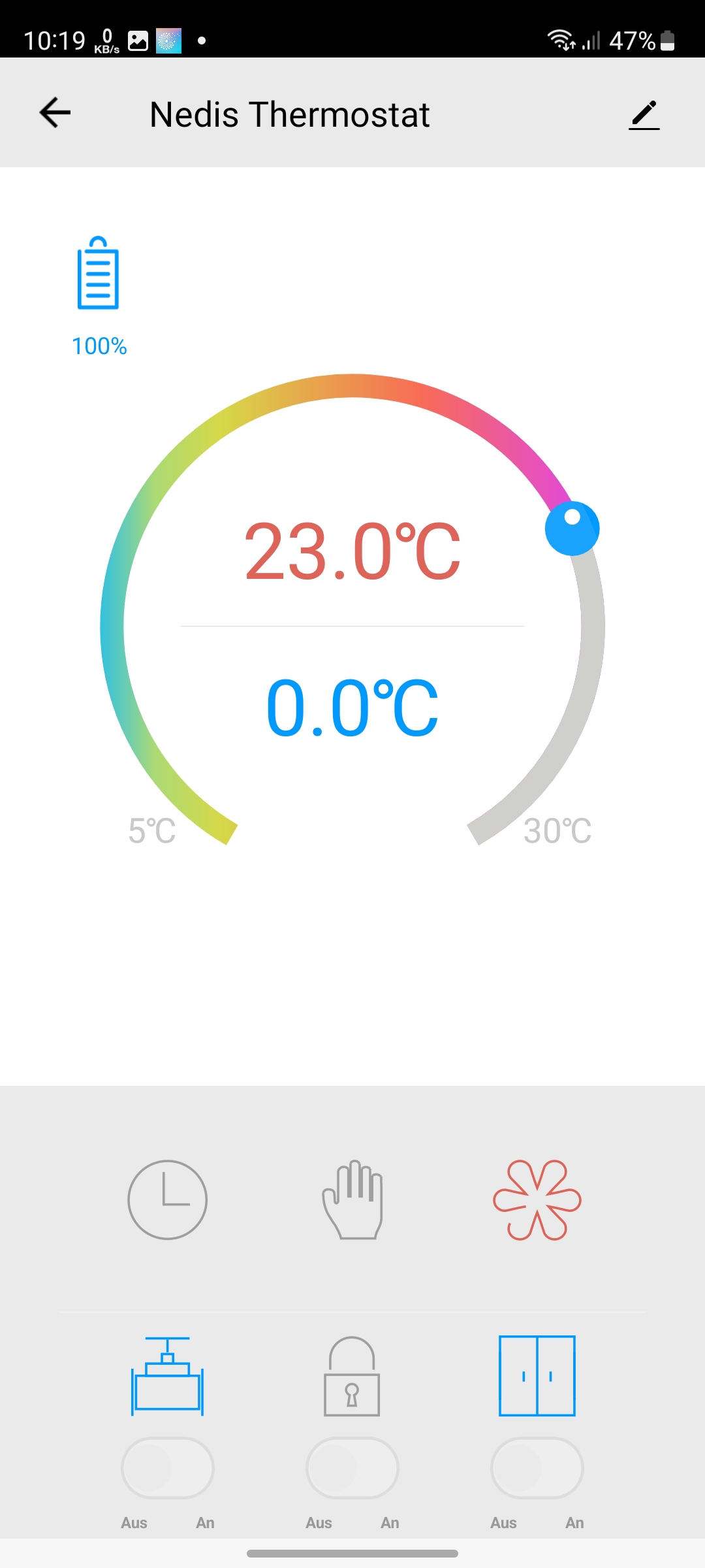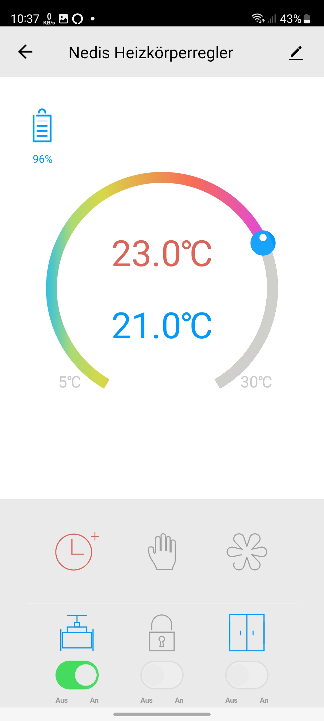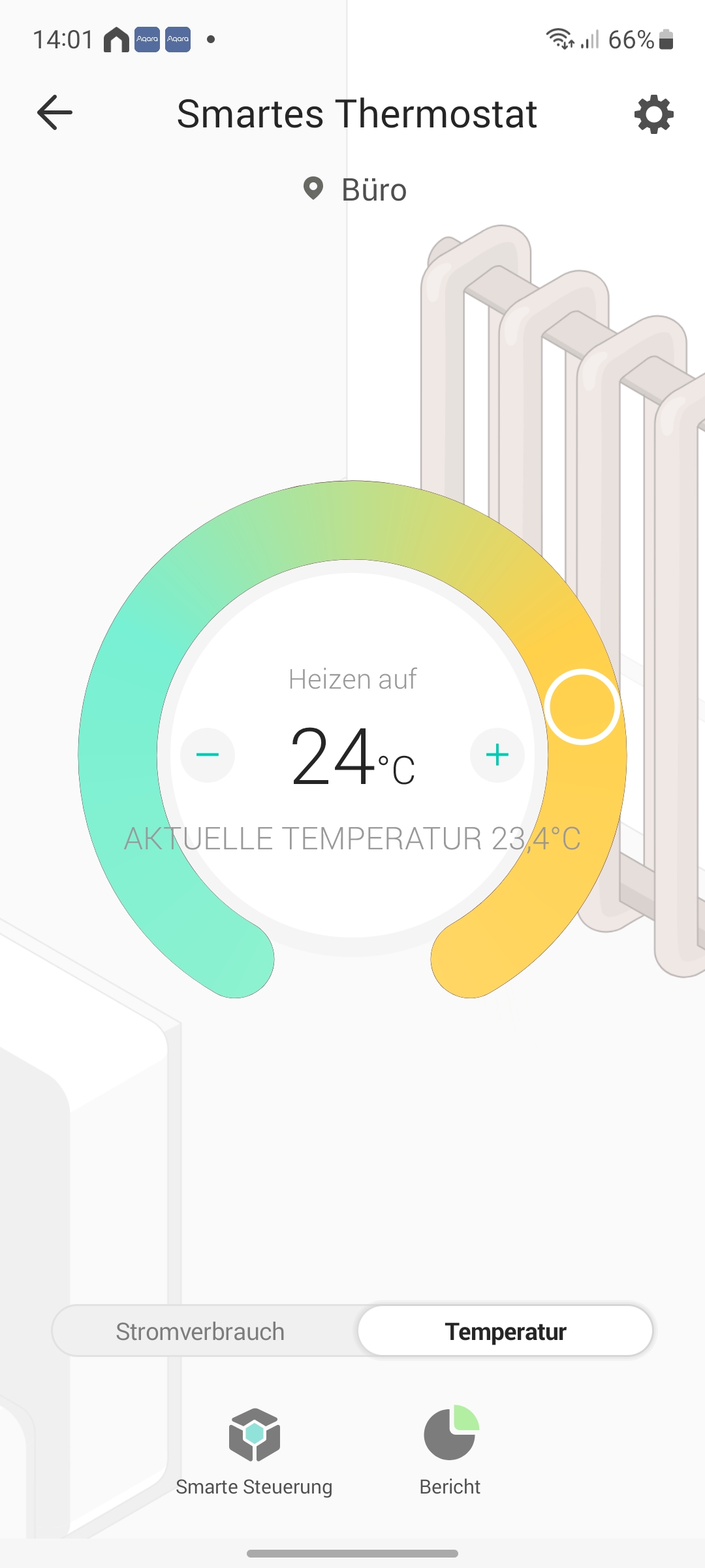 Im manuellen Modus bestimmt der Nutzer die Soll-Temperatur über eine Ringskala. Dafür muss das Smartphone nicht im WLAN sein, die App funktioniert auch ortsunabhängig vollumfänglich. Es dauert etwa 30 Sekunden, dann reguliert das Thermostat den Heizkörper. Der Motor, der das Ventil steuert, ist zwar nicht besonders laut, aber dennoch deutlich hörbar. Empfindliche Naturen könnten sich davon hauptsächlich im Schlafzimmer gestört fühlen.
