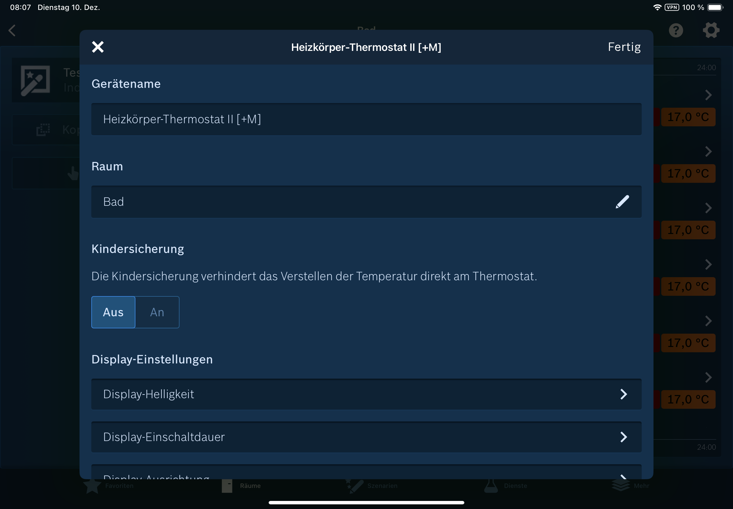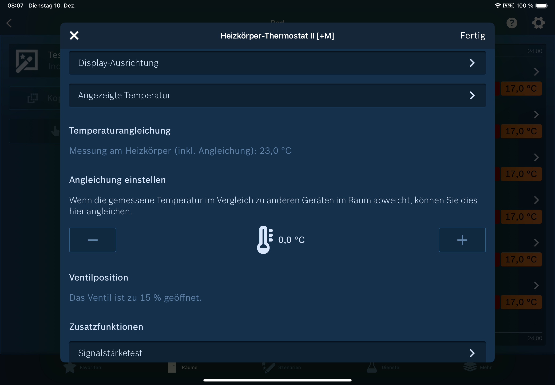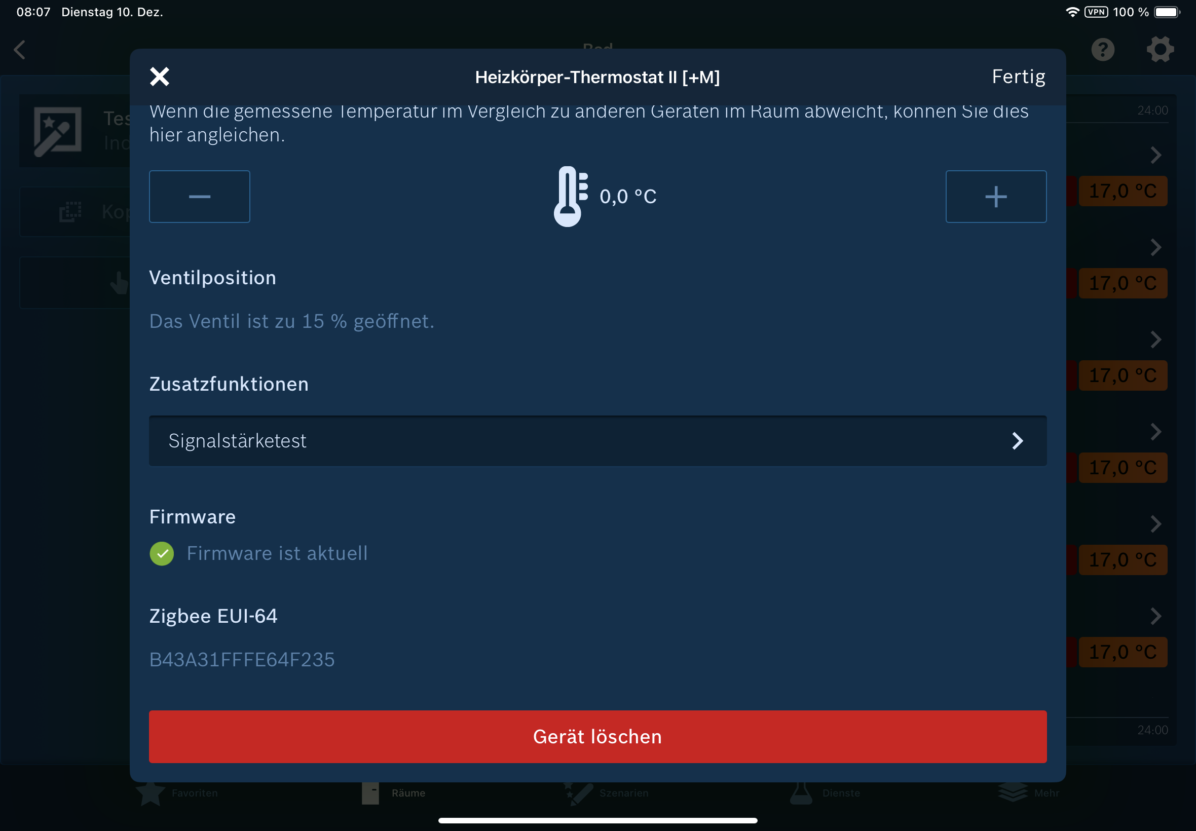 Über das Zahnradsymbol können Anwender auf die Einstellungen des Geräts und den Klimamanager (dazu später mehr) zugreifen. In den Geräteeinstellungen können sie Namen und Raum definieren, die Kindersicherung ein- und ausschalten sowie die Display-Parameter Ausrichtung, Helligkeit, Einschaltdauer sowie die angezeigte Temperatur (gemessen oder eingestellt) konfigurieren. In diesem Abschnitt lässt sich auch eine Temperaturangleichung des im Heizkörperthermostat befindlichen Temperatursensors vornehmen, falls dieser ungenau arbeitet. Außerdem verraten die Geräteeinstellungen noch die Zigbee-ID und die Ventilposition. Apropos Ventilposition: Das Heizkörperthermostat II bietet Schutz vor einer Verkalkung des Ventils, indem es jeden Samstag um 11 Uhr eine „Entkalkungsfahrt“ vornimmt.
