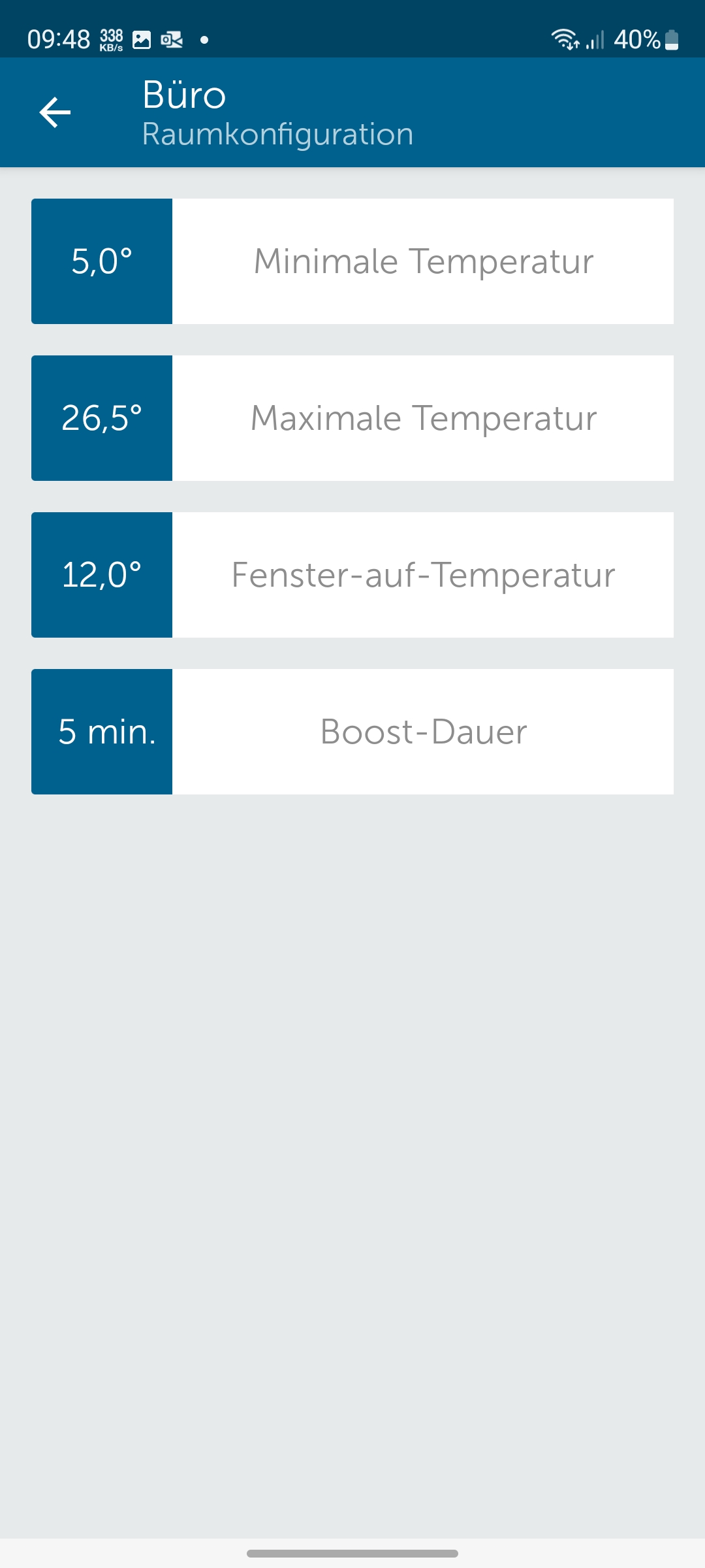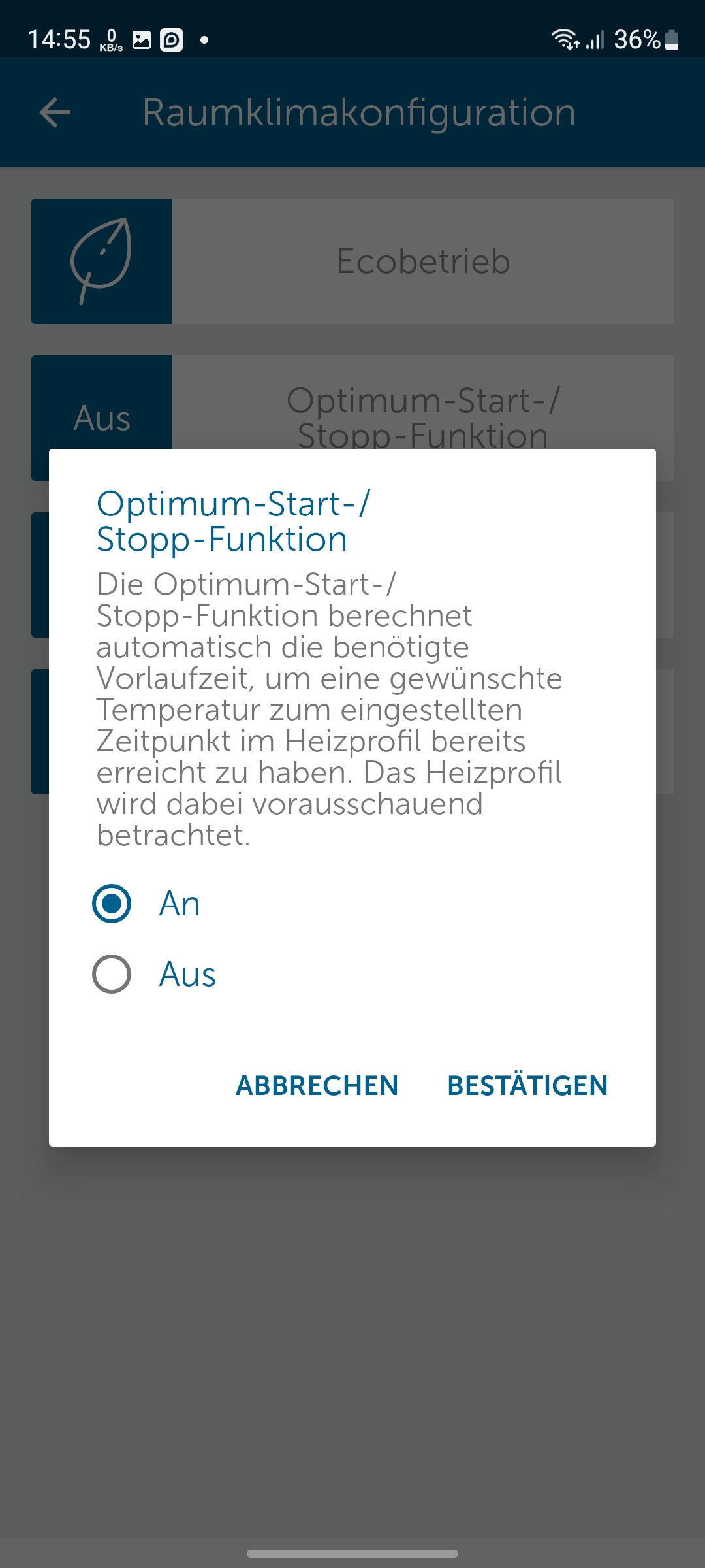 Unter Raumklimakonfiguration stehen noch weitere Anpassungsmöglichkeiten parat. Hier können Anwender etwa einen energiesparenden Eco-Betrieb festlegen. Interessant ist auch die Optimum-Start-/Stopp-Funktion, die automatisch die Vorlaufzeit für eine gewünschte Temperatur zum eingestellten Zeitpunkt berechnet. Die Funktion Heizungsausfallwarnung verschickt eine Push-Nachricht, sofern die gewünschte Temperatur innerhalb von 24 Stunden nicht erreicht wird. Unter Raumkonfiguration können Anwender die grundsätzlichen Heizparameter wie minimale und maximale Temperatur sowie die Fenster-auf-Temperatur definieren und die Boost-Dauer festlegen. Bei der Fenster-auf-Temperatur legt man fest, wie stark die Temperatur am Thermostat gedrosselt wird, wenn das Fenster, etwa fürs Lüften, geöffnet wird. Die Information erhält das Thermostat beispielsweise über einen entsprechenden Homematic-IP-Sensor.