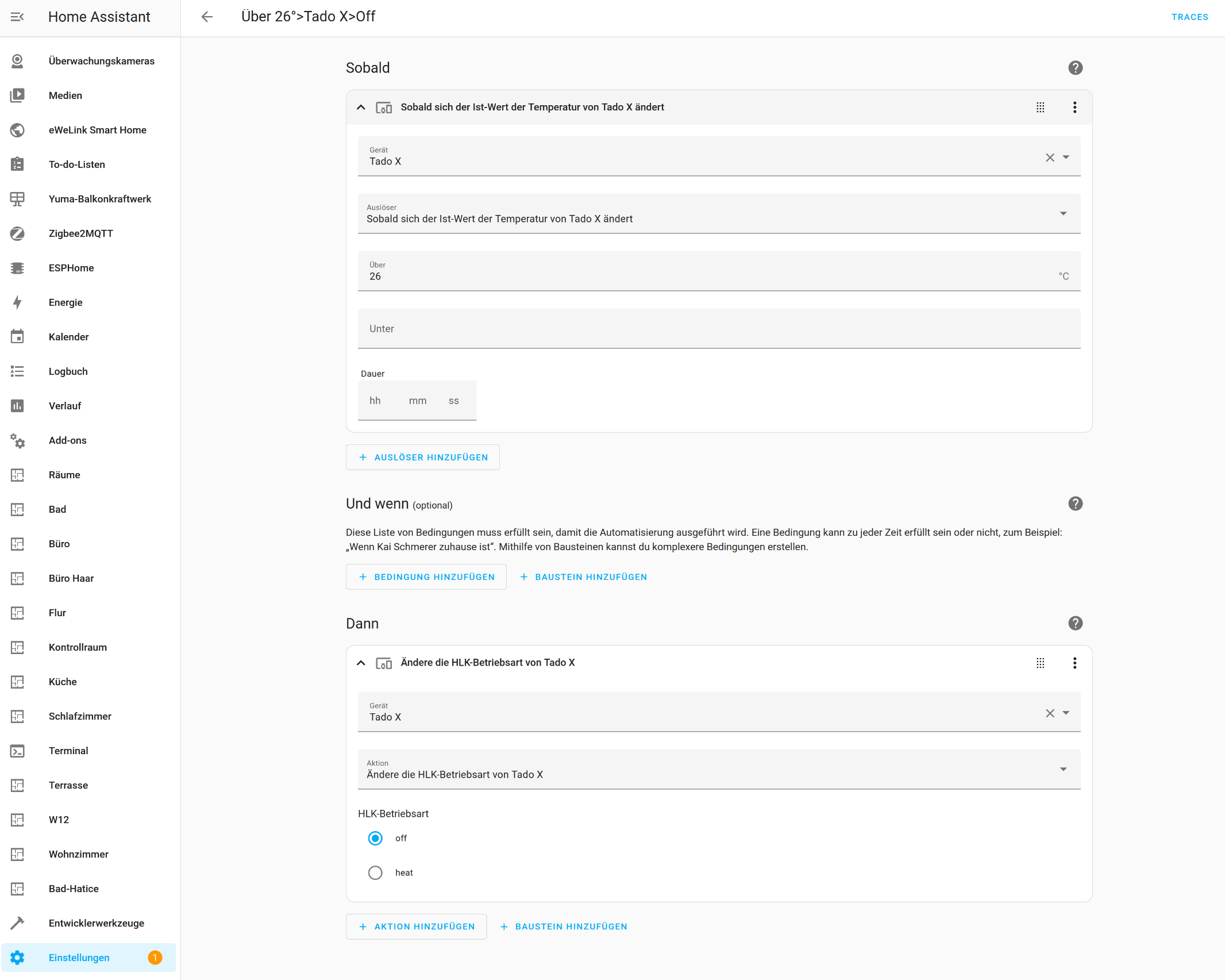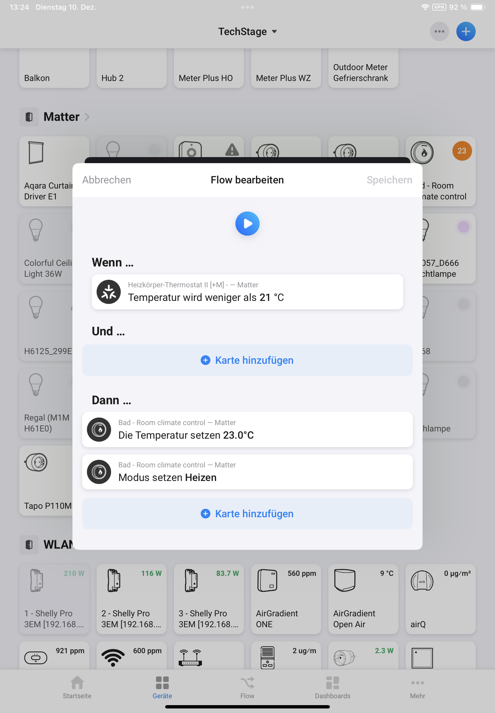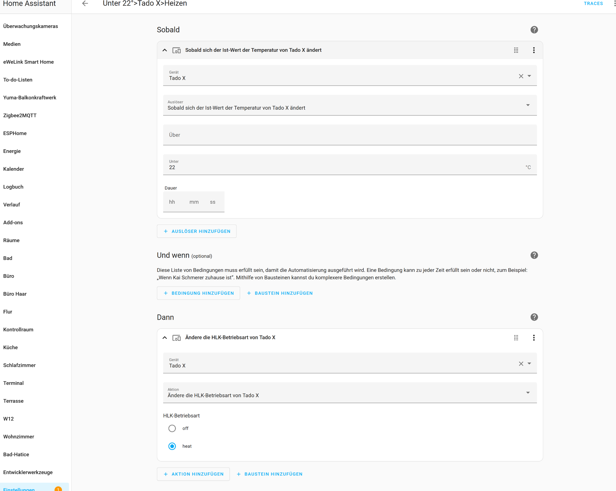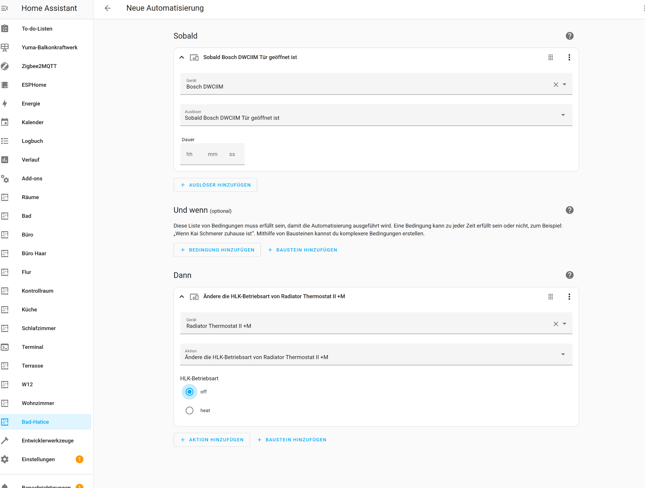 Mit einem Matter-System bietet Tado X allerdings weniger Funktionen als mit der App. So gibt es derzeit keinen Zugriff auf den Batteriestatus und auch Heizpläne, die mit der Tado-App angelegt wurden, stehen unter einer Matter-kompatiblen Smart-Home-Zentrale nicht zur Verfügung. Doch diese lassen sich durch einfache Automatisierungen abbilden. Das ist zwar etwas aufwendiger, doch in der Regel erstellt man Zeitpläne für ein Thermostat nur einmal. Auch andere relevanten Funktionen, wie die mit einem Tado-Abo zur Verfügung stehenden Fenster-Offen-Erkennung, lassen sich mit einer Matter-kompatiblen Smart-Home-Zentrale wesentlich besser umsetzen. Denn bei einem durch ein offenes Fenster verursachten Temperaturabfall ist die Wärme bereits entwichen, bevor das Thermostat den Betrieb stoppt. Schließlich dauert es sehr lange, bis ein Temperaturabfall registriert wird. Somit heizt das Thermostat unnötig bei einem geöffneten Fenster. Wesentlich besser ist daher eine Automatisierung auf Basis eines Tür-/Fenstersensors. Zwar hat Tado keinen eigenen Tür-/Fenstersensor zu bieten, doch mit einem Modell eines Drittherstellers kann man eine Automatisierung erstellen, die das Thermostat ausschaltet, respektive das Heizungsventil schließt, sobald ein geöffnetes Fenster erkannt wird.