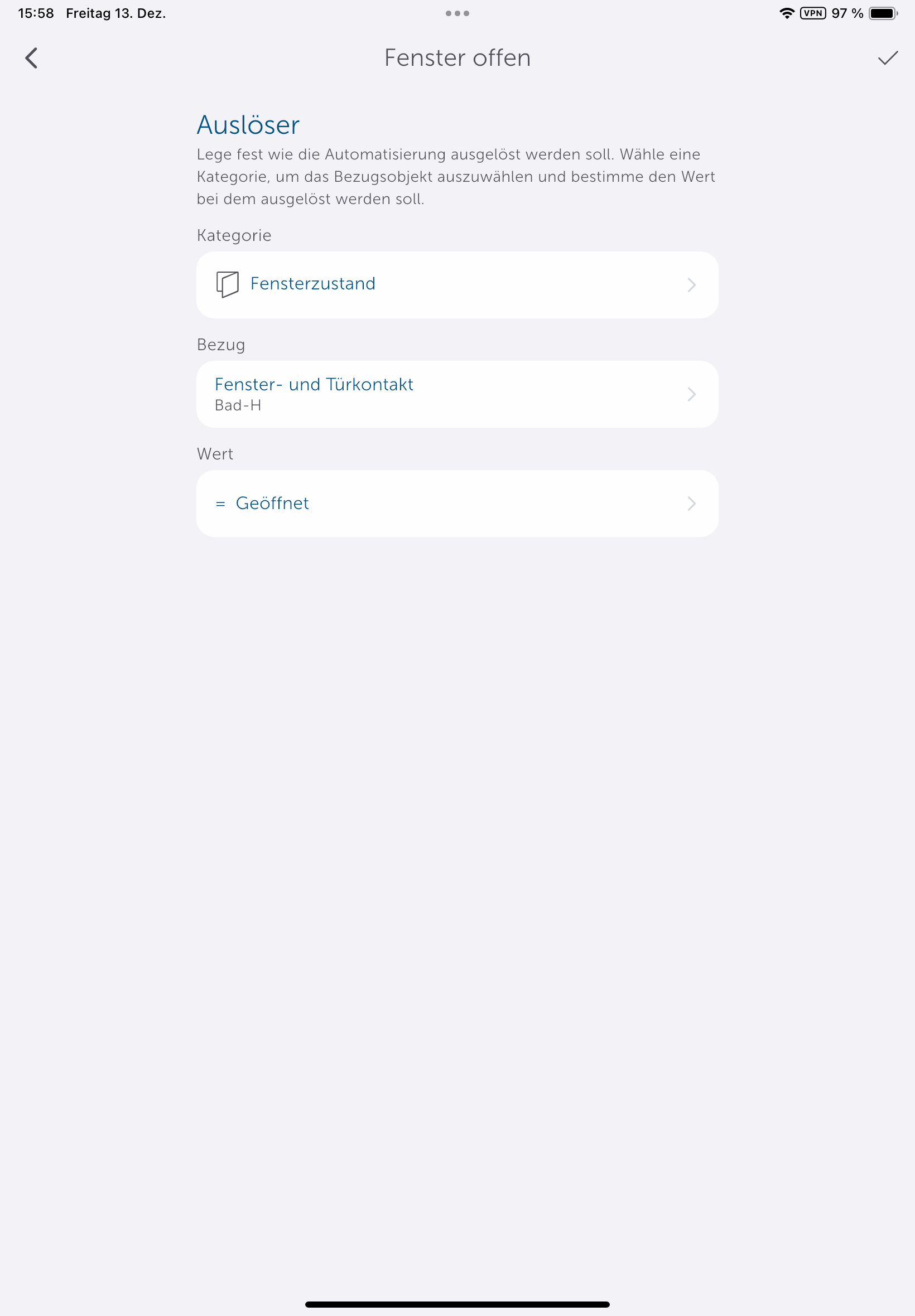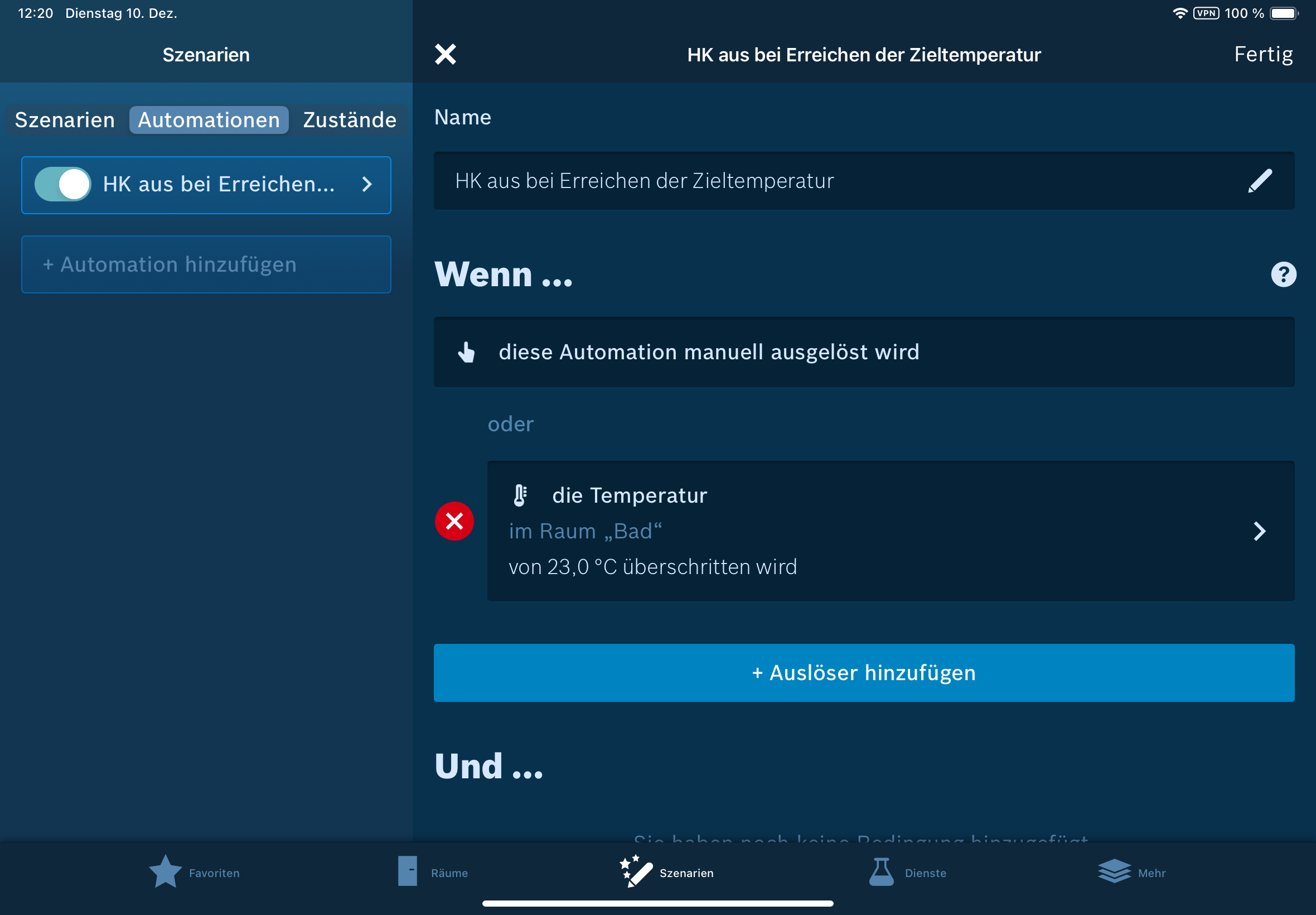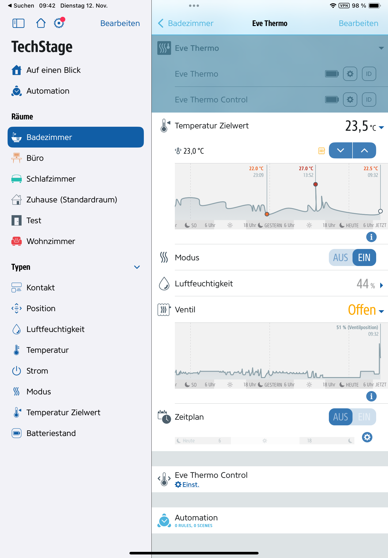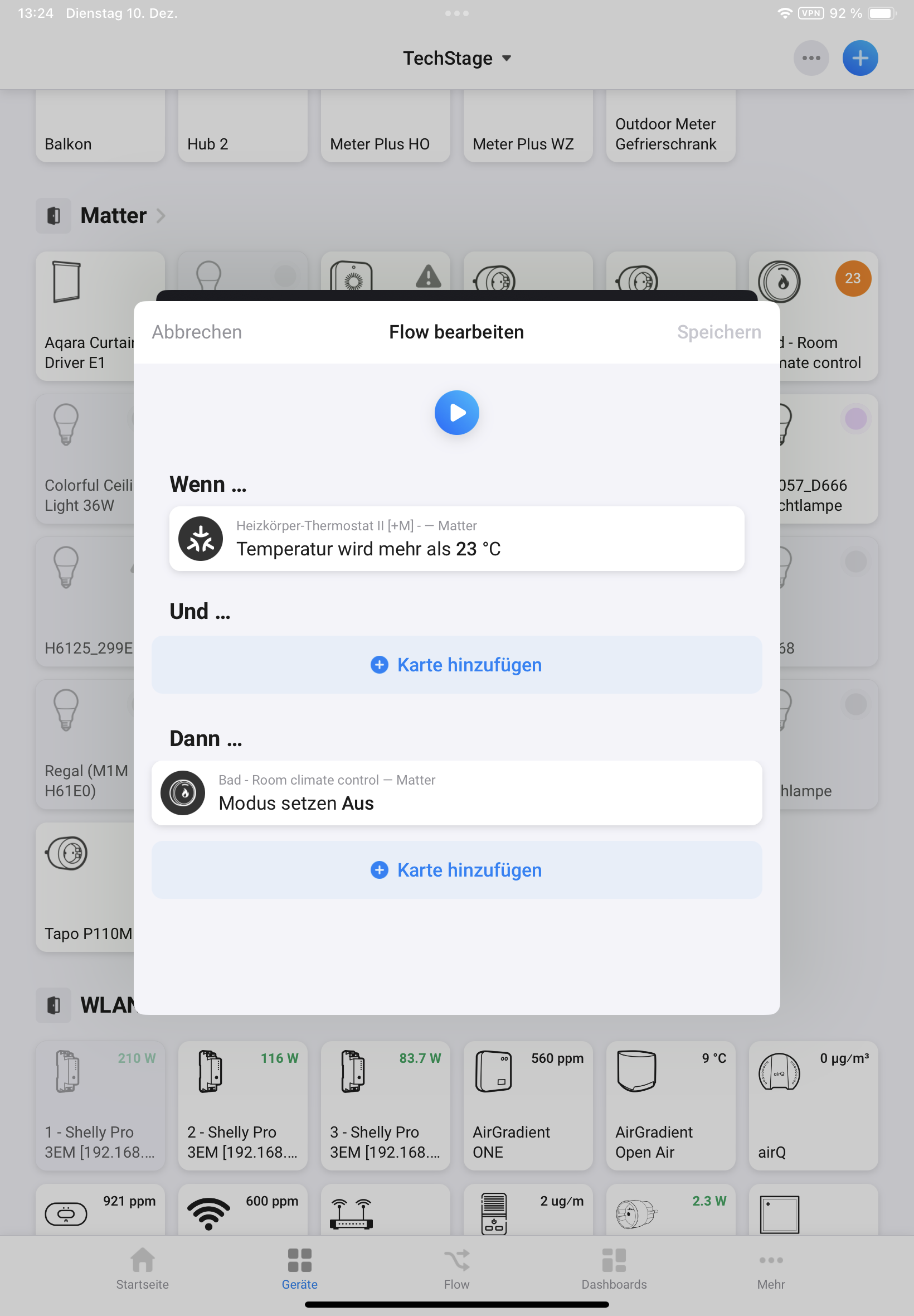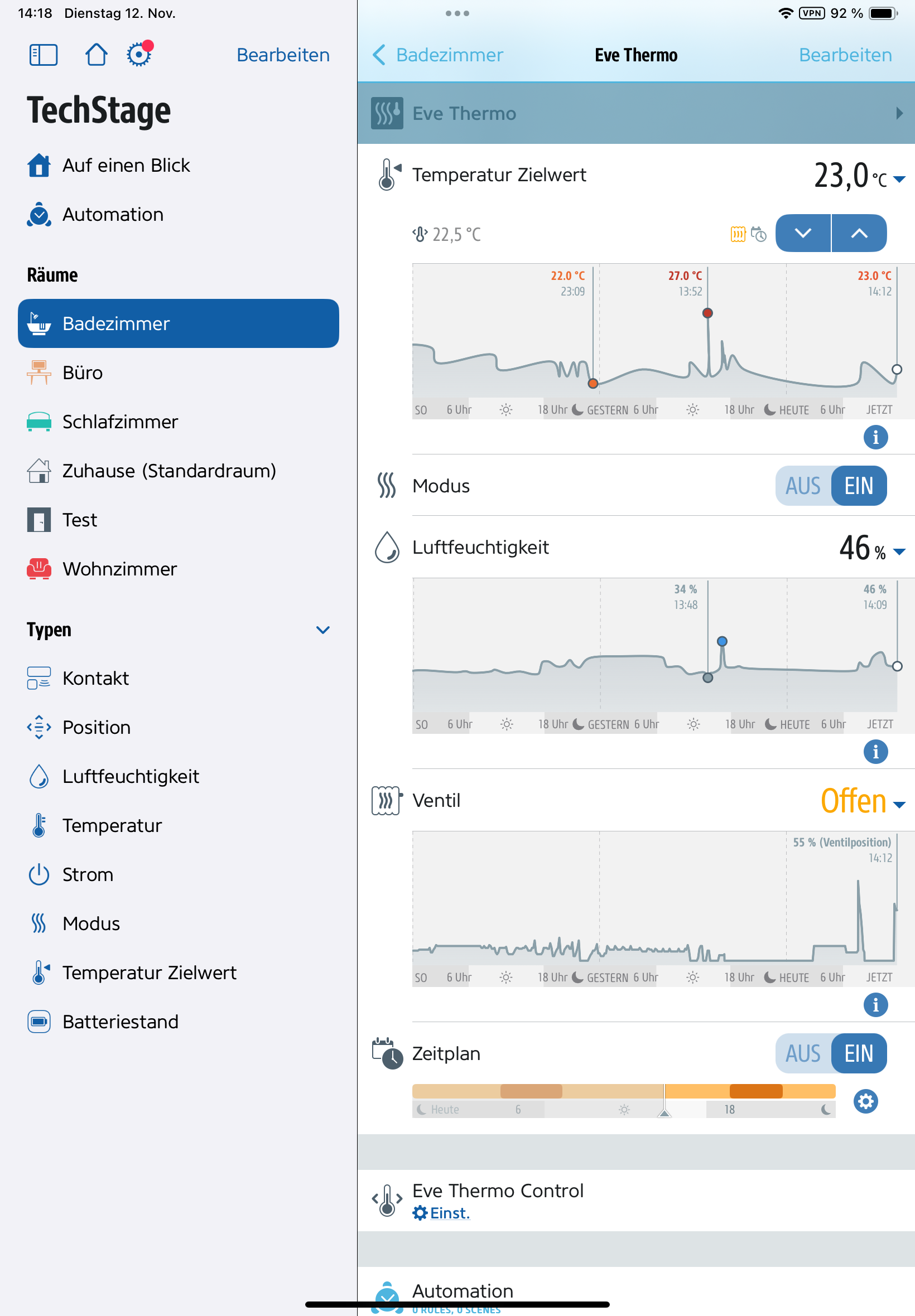 Mit einem Matter-System bietet Tado X allerdings weniger Funktionen als mit der App. So gibt es derzeit keinen Zugriff auf den Batteriestatus und auch Heizpläne, die mit der Tado-App angelegt wurden, stehen unter einer Matter-kompatiblen Smart-Home-Zentrale nicht zur Verfügung. Doch diese lassen sich durch einfache Automatisierungen abbilden. Das ist zwar etwas aufwendiger, doch in der Regel erstellt man Zeitpläne für ein Thermostat nur einmal. Auch andere relevanten Funktionen, wie die mit einem Tado-Abo zur Verfügung stehenden Fenster-Offen-Erkennung, lassen sich mit einer Matter-kompatiblen Smart-Home-Zentrale wesentlich besser umsetzen. Denn bei einem durch ein offenes Fenster verursachten Temperaturabfall ist die Wärme bereits entwichen, bevor das Thermostat den Betrieb stoppt. Schließlich dauert es sehr lange, bis ein Temperaturabfall registriert wird. Somit heizt das Thermostat unnötig bei einem geöffneten Fenster. Wesentlich besser ist daher eine Automatisierung auf Basis eines Tür-/Fenstersensors. Zwar hat Tado keinen eigenen Tür-/Fenstersensor zu bieten, doch mit einem Modell eines Drittherstellers kann man eine Automatisierung erstellen, die das Thermostat ausschaltet, respektive das Heizungsventil schließt, sobald ein geöffnetes Fenster erkannt wird.