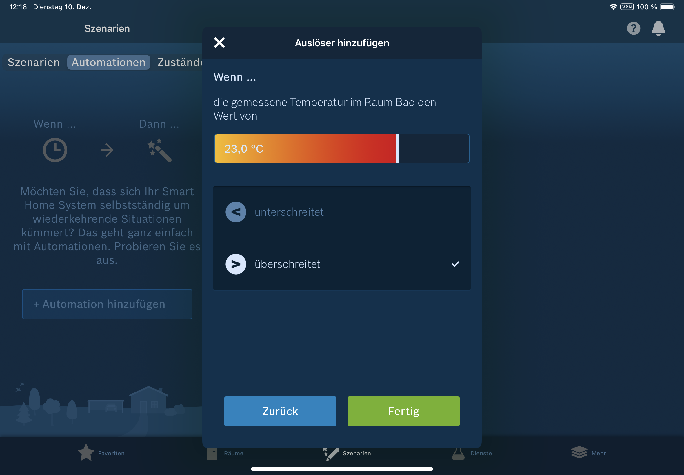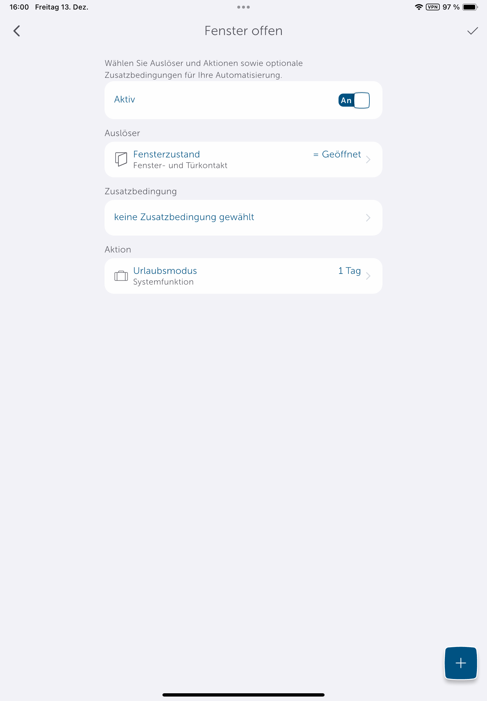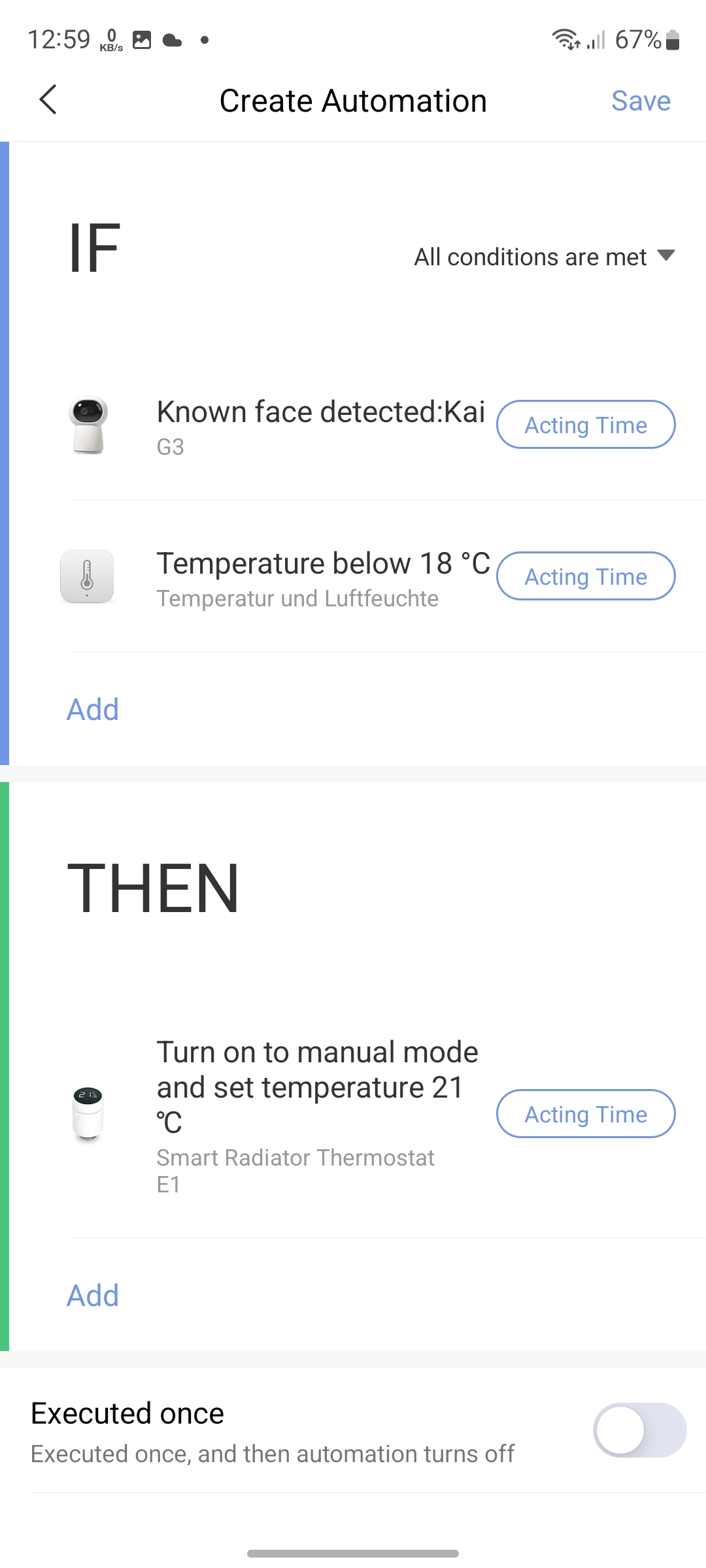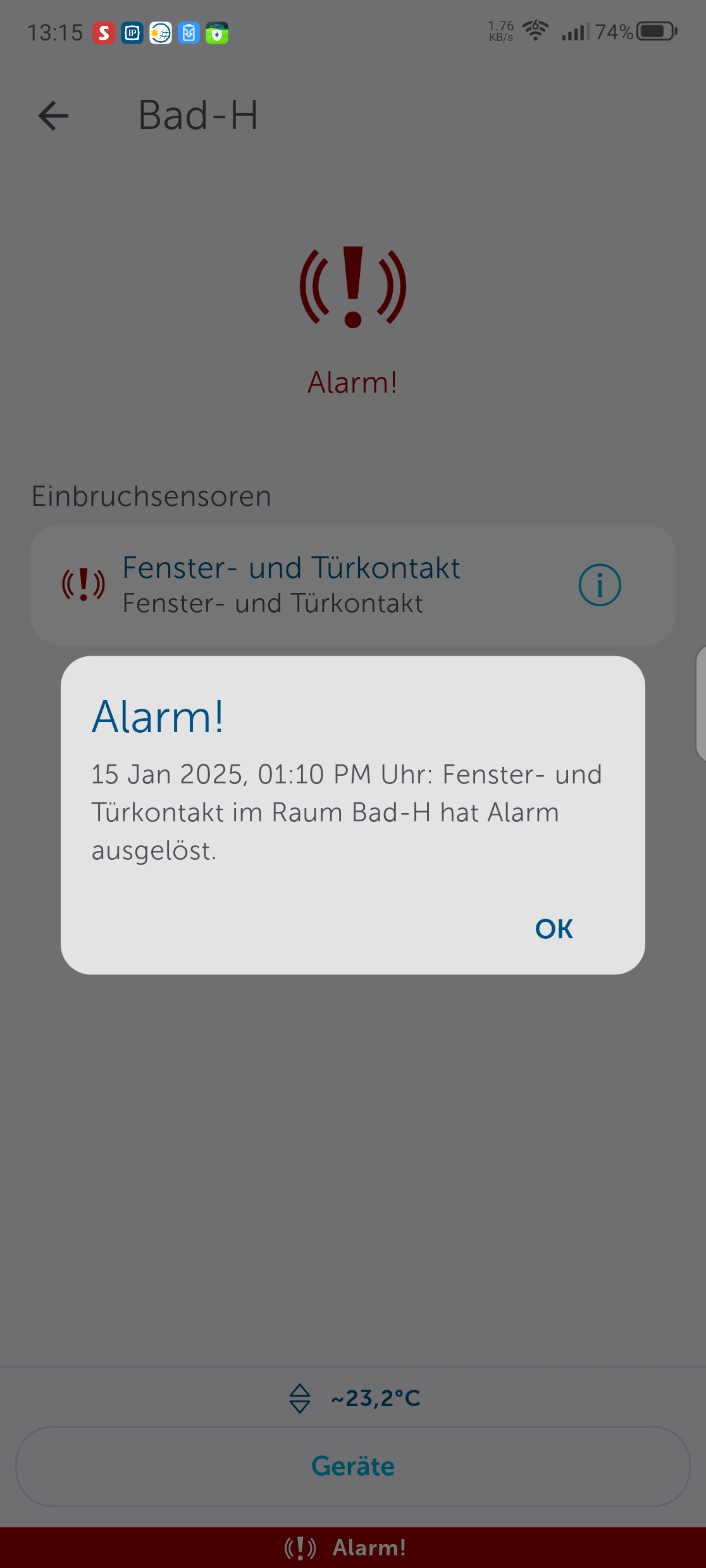 Individuelle Alarmmeldungen können Anwender ebenfalls konfigurieren. So kann man etwa eine Regel definieren, dass bei einem länger als 10 Minuten geöffneten Fenster oder beim Abfall der Temperatur unter einen bestimmten Wert Nutzer Alarmierungen erhalten. Geofencing unterstützt das Gerät hingegen nicht direkt. Damit entfällt die Möglichkeit, das Heizkörperthermostat über Standortdaten zu steuern.