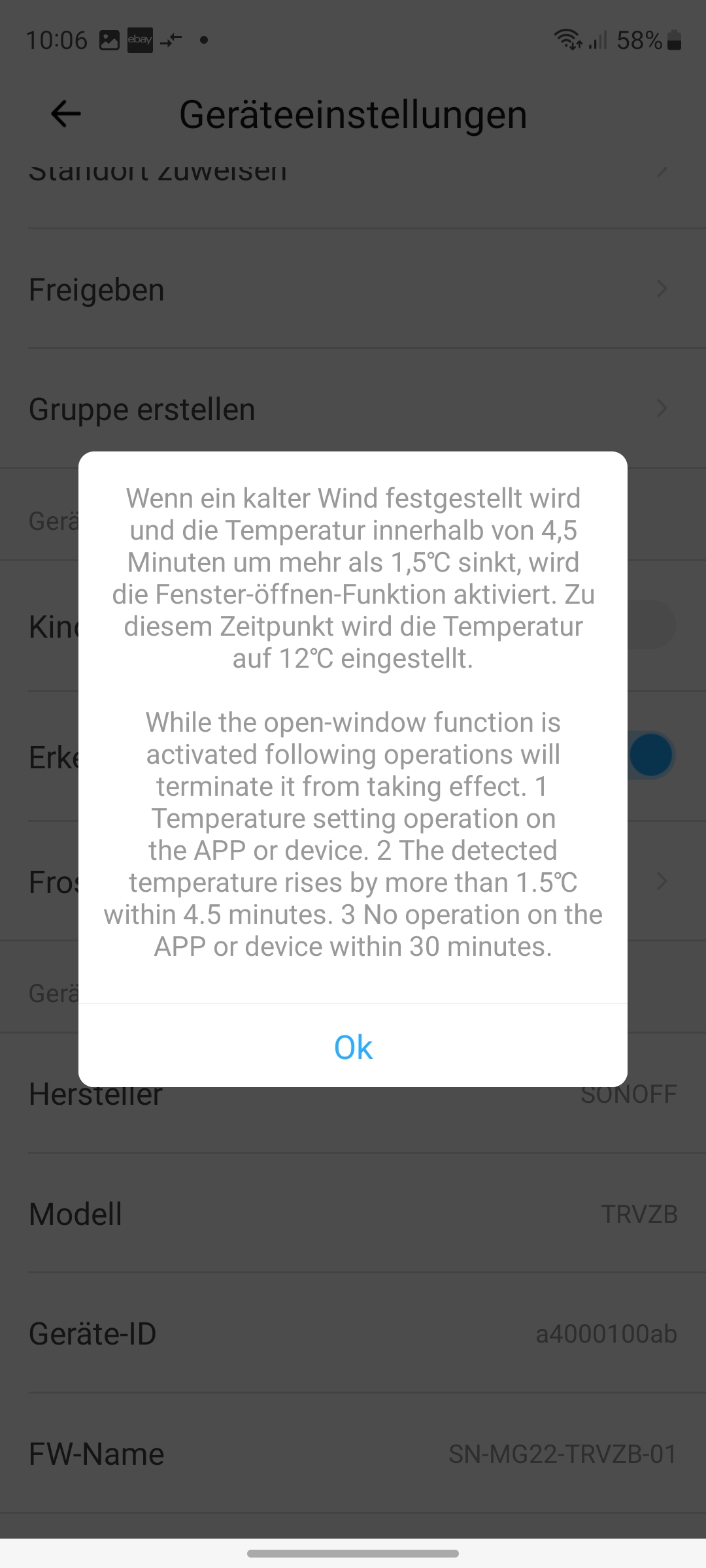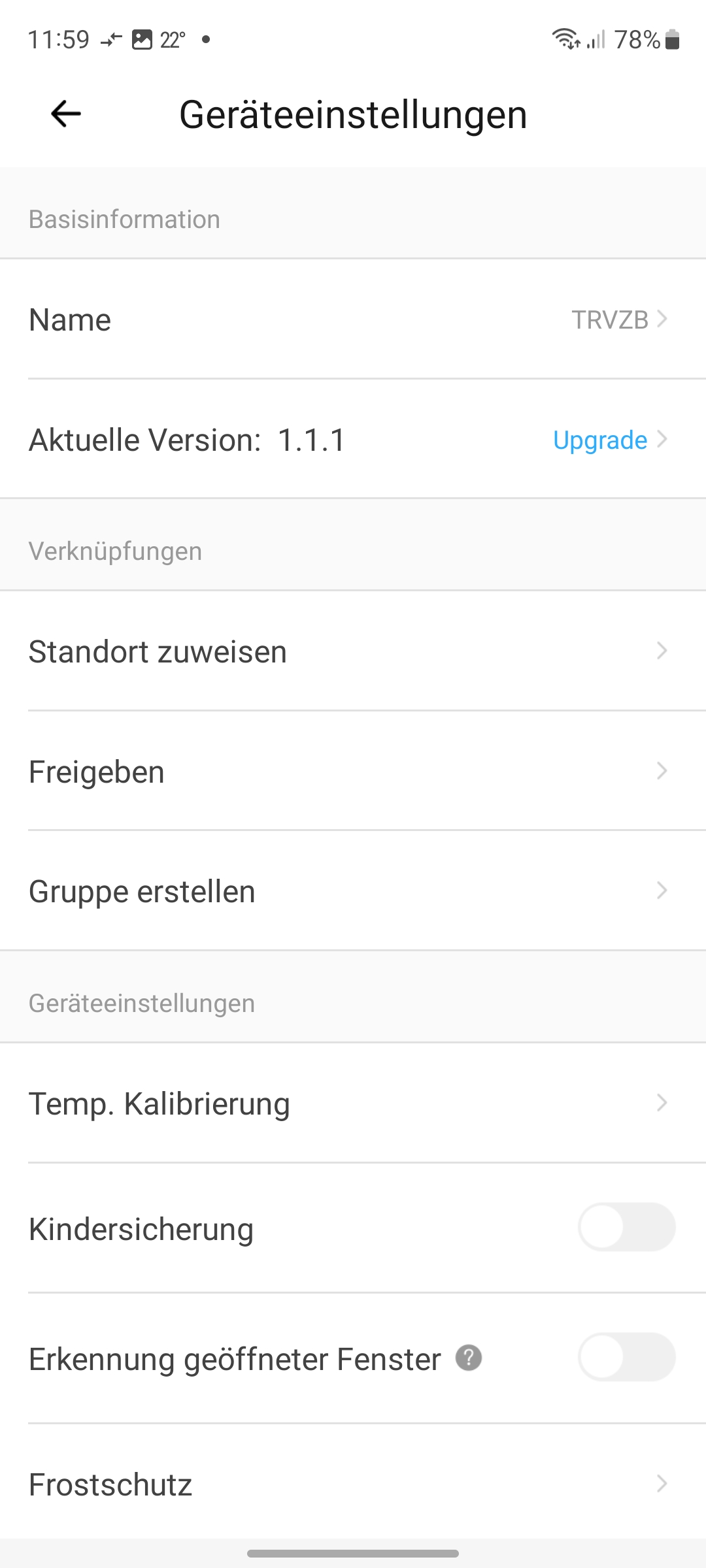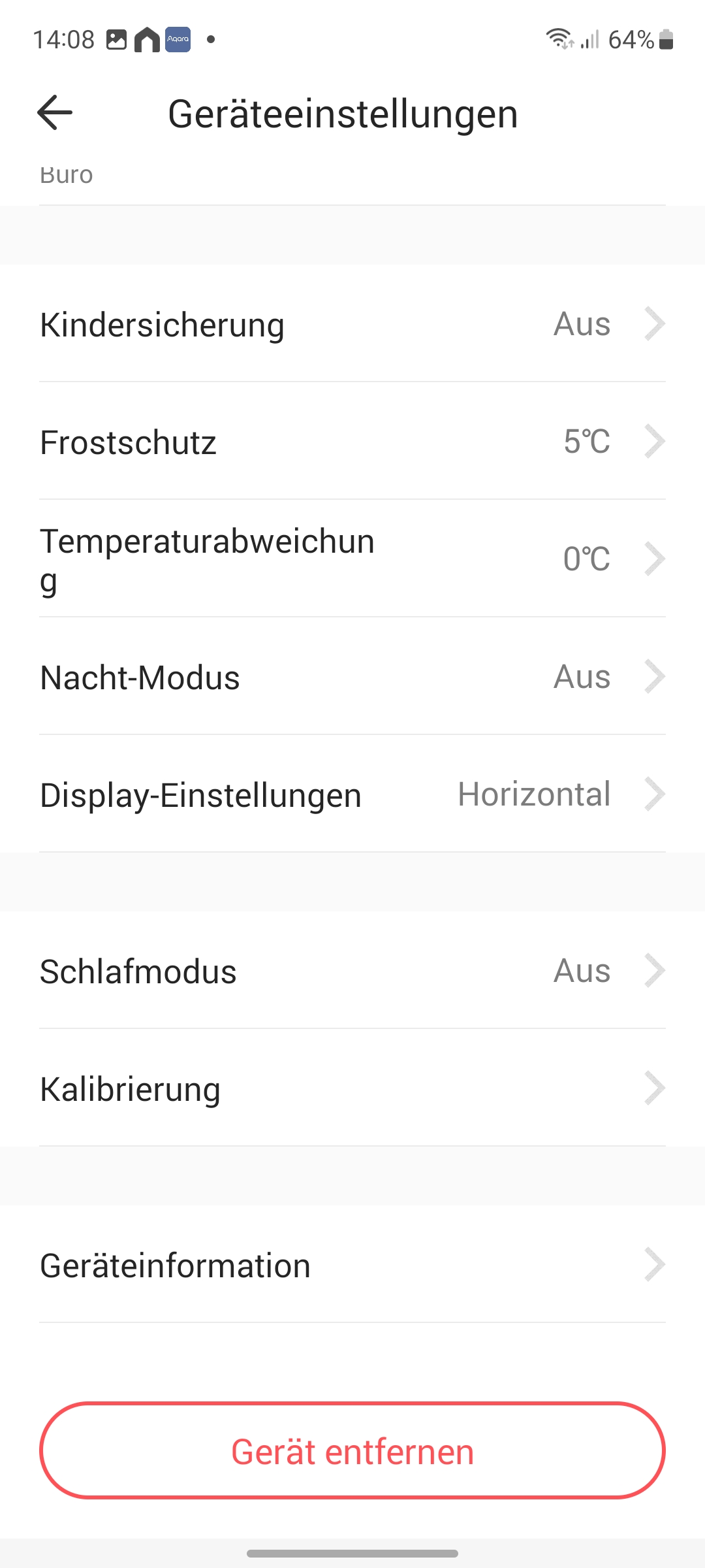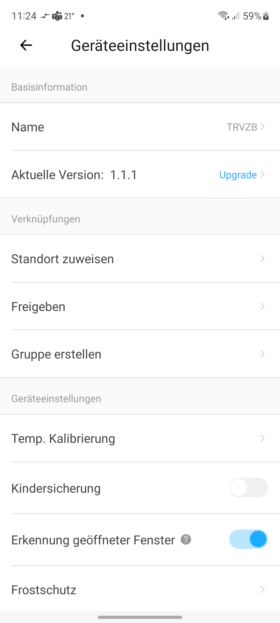 Die Geräteeinstellungen kennen eine Offset-Funktion. Sollte die vom Gerät gemessene Ist-Temperatur regelmäßig um eine bestimmte Gradzahl von der tatsächlichen Temperatur im Zimmer abweichen, kann das hier korrigiert werden. Außerdem kann die App festlegen, wie oft sich der Motor kalibriert. Es gibt zudem die Möglichkeit eine Fenster-offen-Erkennung zu aktivieren. Im Test funktioniert diese trotz direkt darüber liegendem Fenster und Minusgraden nicht. Wer den genauen Standort bestimmt, bekommt in der App zusätzlich die aktuelle Außentemperatur angezeigt.