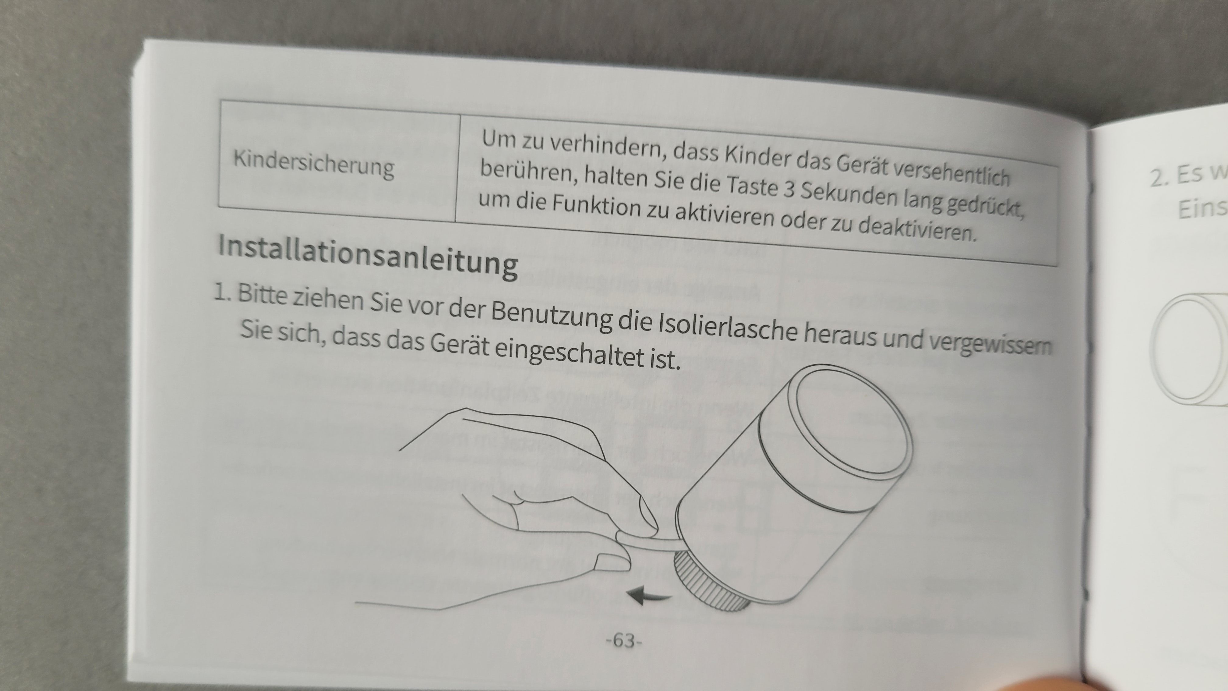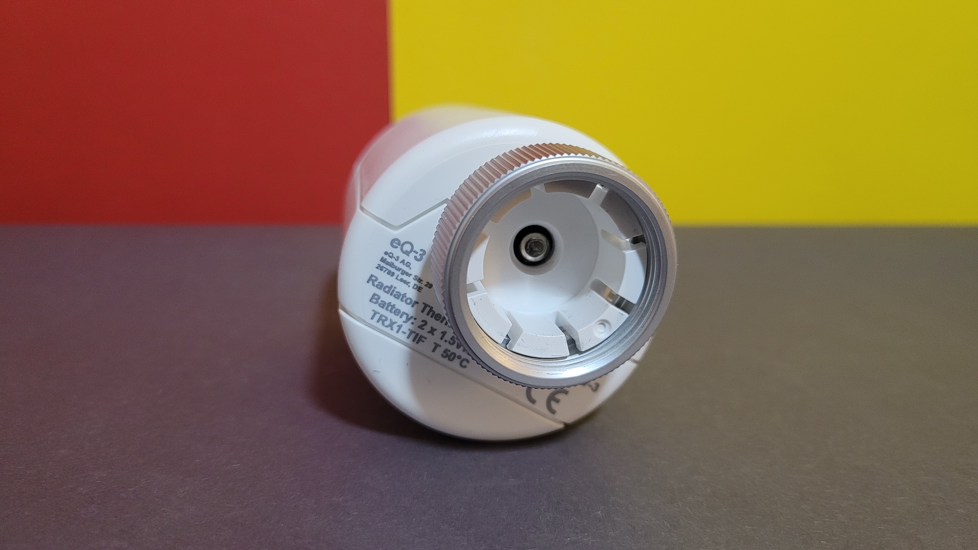 Unterhalb des Namens informiert links oben eine Batterieanzeige über den aktuellen Status der Energieversorgung. Die zwei AA-Batterien sollen etwa ein Jahr halten. Ein Batterieaustausch ist möglich, ohne dass man das Thermostat vom Ventil abschrauben muss. Stattdessen dreht man die Gehäuseabdeckung etwas nach links und zieht sie nach vorn ab. Jetzt können die Batterien getauscht werden.