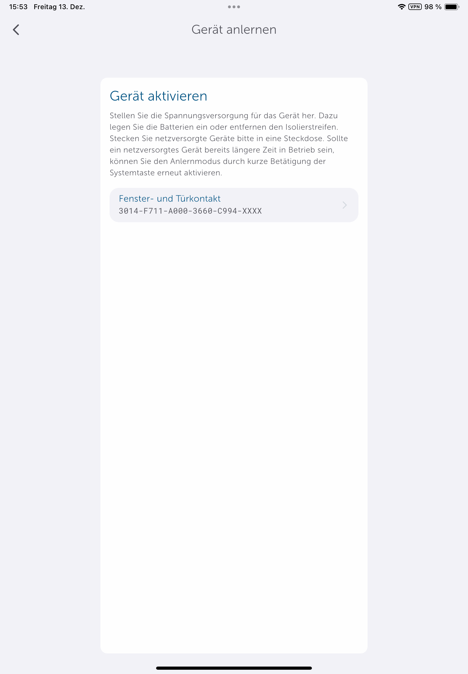 Jetzt kann ihn mit der App verbinden. Hierfür scannt man den an der Unterseite des Geräts befindlichen QR-Code ein. Die App schafft das aber nicht, vermutlich, weil die QR-Code-Grafik zu klein ausfällt. Bei uns lag im Karton allerdings noch ein Aufkleber mit einer größeren QR-Code-Grafik, die die App problemlos eingelesen hat. Alternativ gibt es noch die Möglichkeit, die Koppelung über die manuelle Eingabe von Mac-Adresse und Key, die beide an der Unterseite des Geräts neben der QR-Code-Grafik aufgedruckt sind, durchzuführen. Nachdem der Smart Home Controller eingerichtet ist (siehe auch Bildergalerie) erfolgt die Koppelung mit Tür-/Fenster-Kontakt und Heizkörper-Thermostat II. Hierfür muss man den Tür-/Fenster-Kontakt öffnen und die Schutzfolie zwischen Batterie und Stromkontakt herausziehen und anschließend den QR-Code im Inneren des Sensors scannen. Für die Koppelung des Heizkörperthermostats scannt man den QR-Code im Batteriefach und setzt anschließend die mitgelieferten zwei AA-Batterien ins Heizkörperthermostat ein. Die Batterien sollen eine Betriebszeit von bis zu zwei Jahren ermöglichen, was sicher aber abhängig davon ist, wie häufig das Thermostat das Ventil steuert. In jedem Fall werden Anwender rechtzeitig informiert, wann ein Batteriewechsel erforderlich ist.