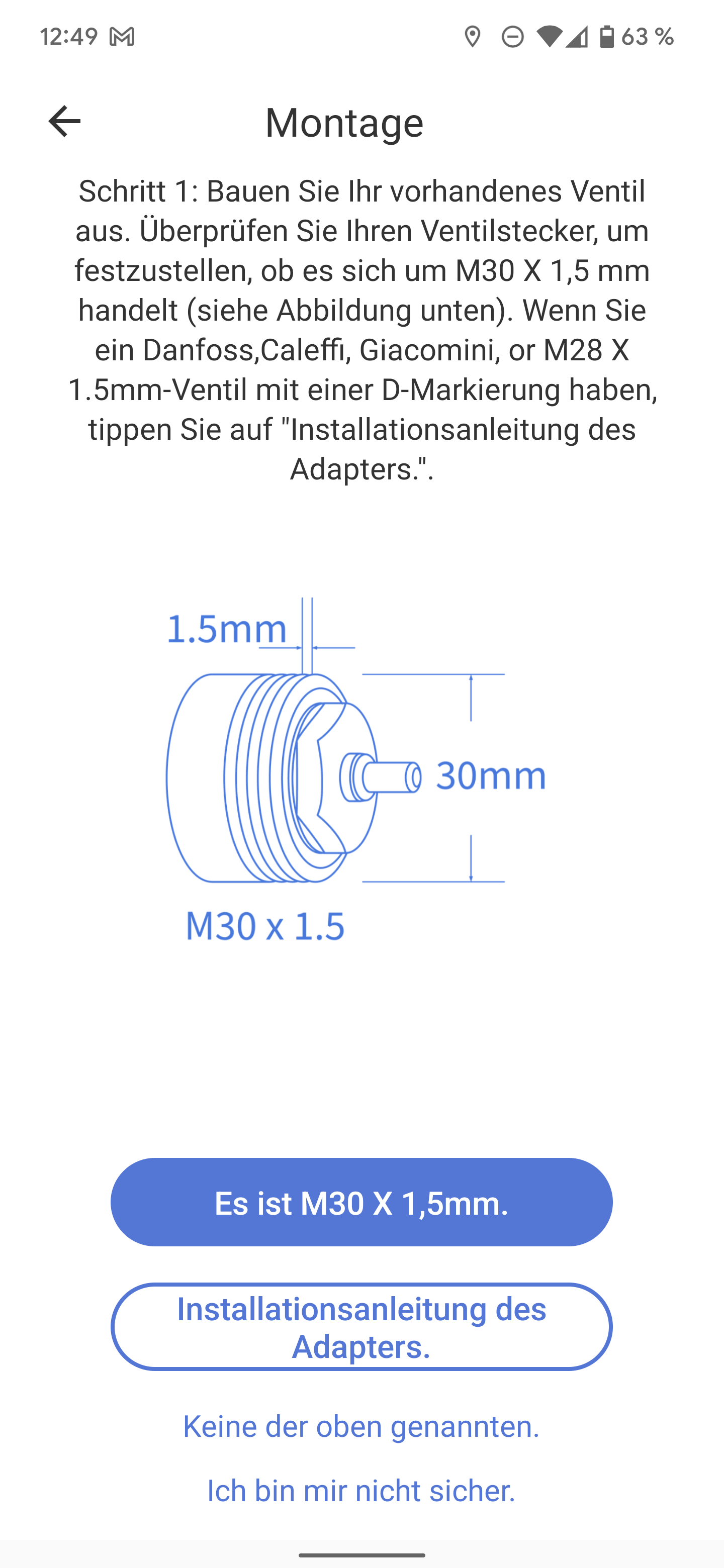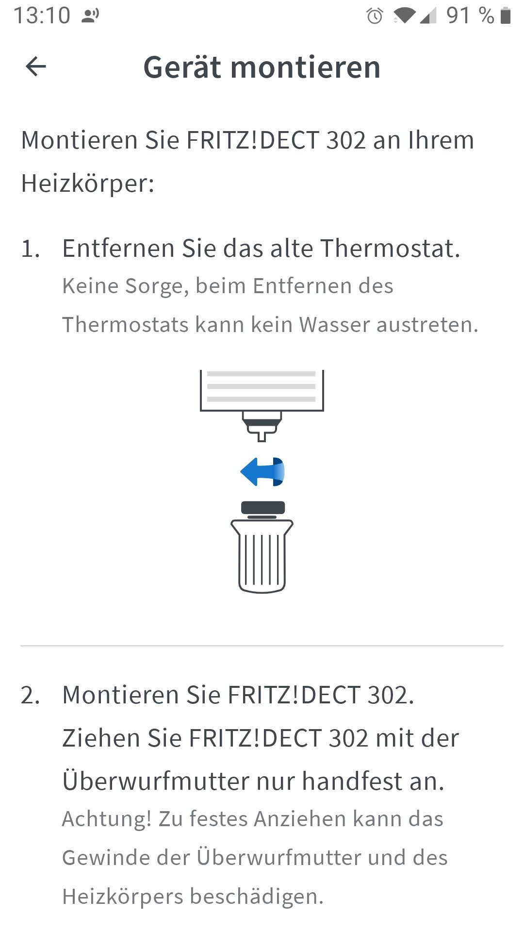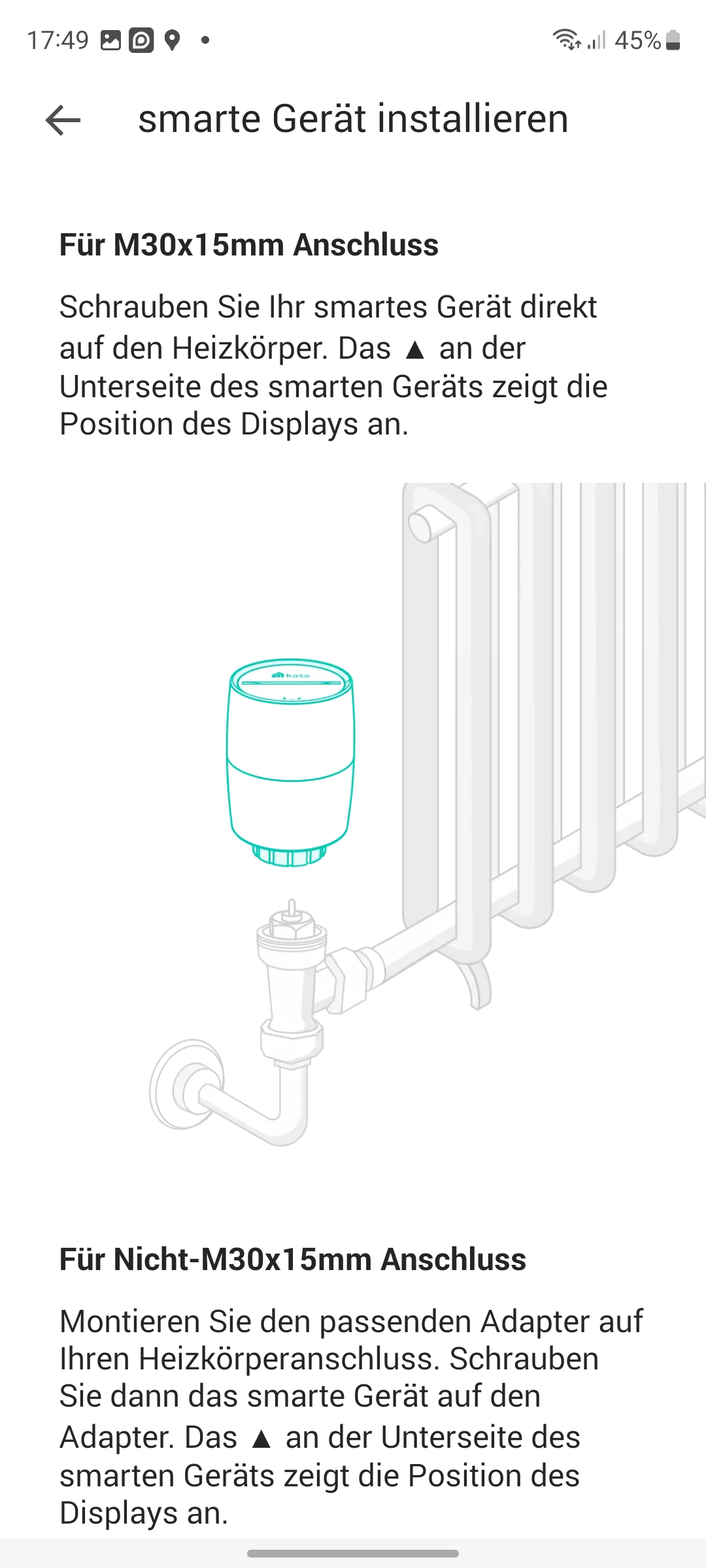 Die einzelnen Installationsschritte werden durch einen Installationsassistenten detailliert erklärt und sollten keine Probleme bereiten. Jetzt wird das Thermostat an den Heizkörper montiert. Standardmäßig passt es auf herkömmliche Schraubgewinde mit M30 x 1,5 mm (Passende Adapter für Danfoss RA und Danfoss RAVL liegen bei). Die App fordert dann eine Kalibrierung des Thermostats. Nach dieser ist das smarte Heizkörperthermostat einsatzbereit.