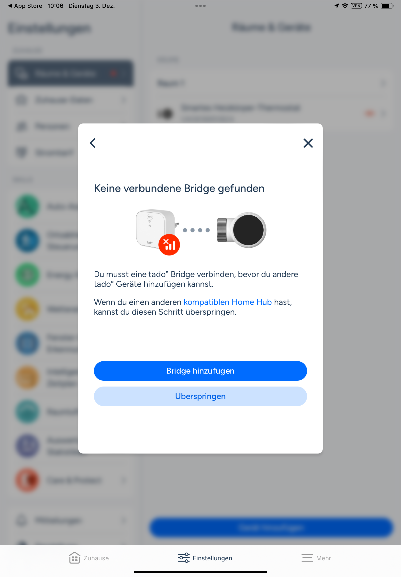 Die Inbetriebnahme des Tado-Heizkörperthermostats ist einfach und nach wenigen Minuten abgeschlossen (siehe auch Bildergalerie). Wer keinen Thread-Border-Router wie Apple TV 4K, Homey Pro oder Home Assistant verwendet, benötigt die Tado-Bridge, die das Thermostat mit dem WLAN-koppelt.