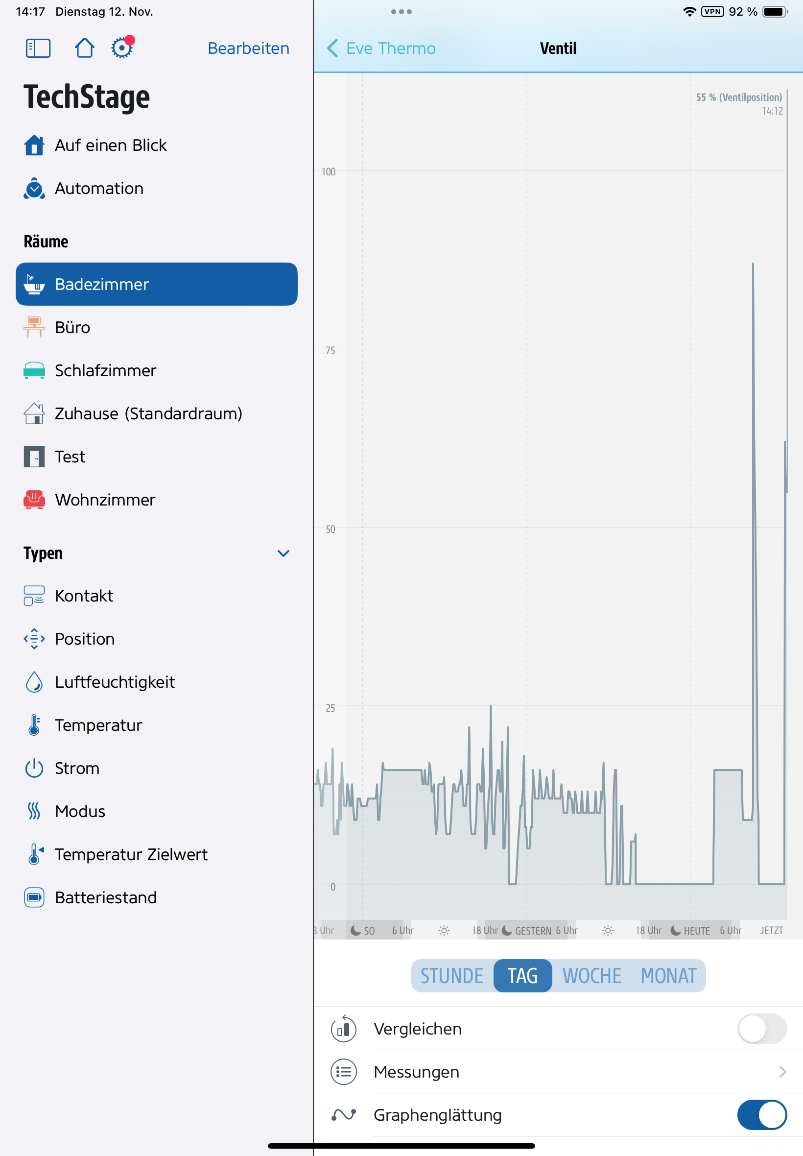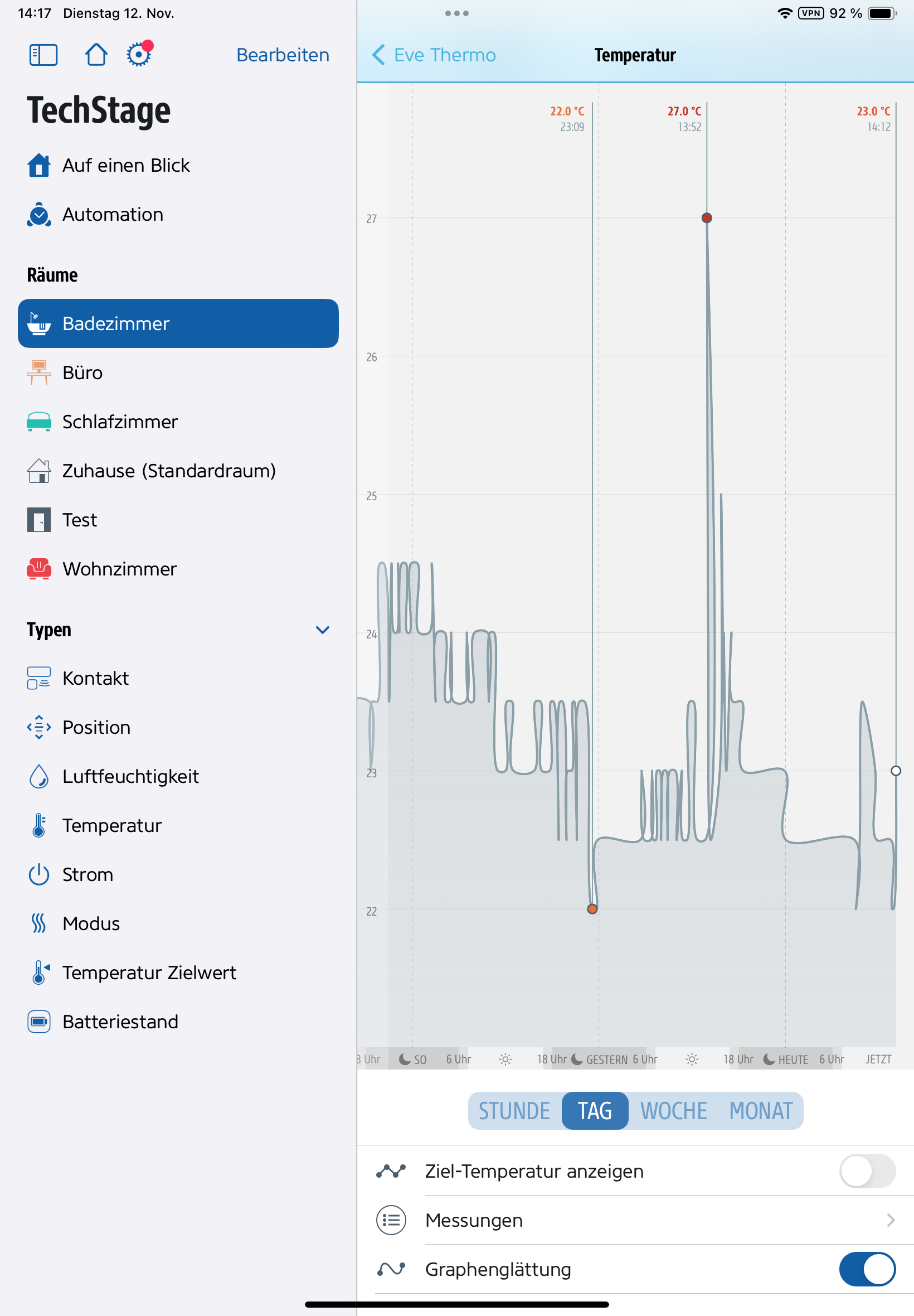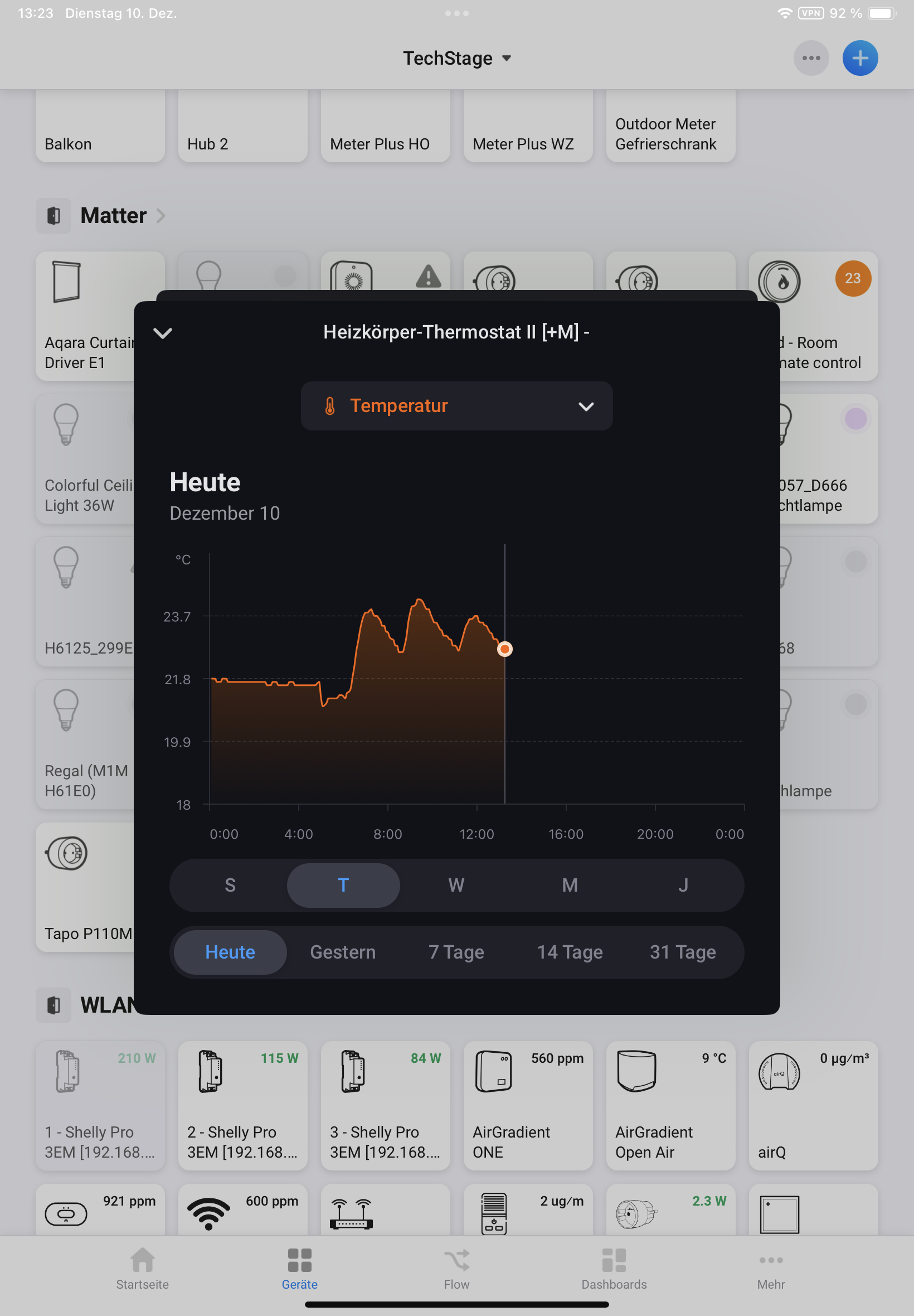 Die Tado-App sieht nicht nur schön aus, sondern bietet auch Verlaufsgrafiken für Temperatur und Heizperiode. Außerdem lässt sie sich einfach bedienen. Heizpläne sind im Handumdrehen erstellt. Tado X hält die eingestellte Temperatur relativ konstant. Der Peak am Morgen wurde durch heiße Dusche verursacht. TechStage.de