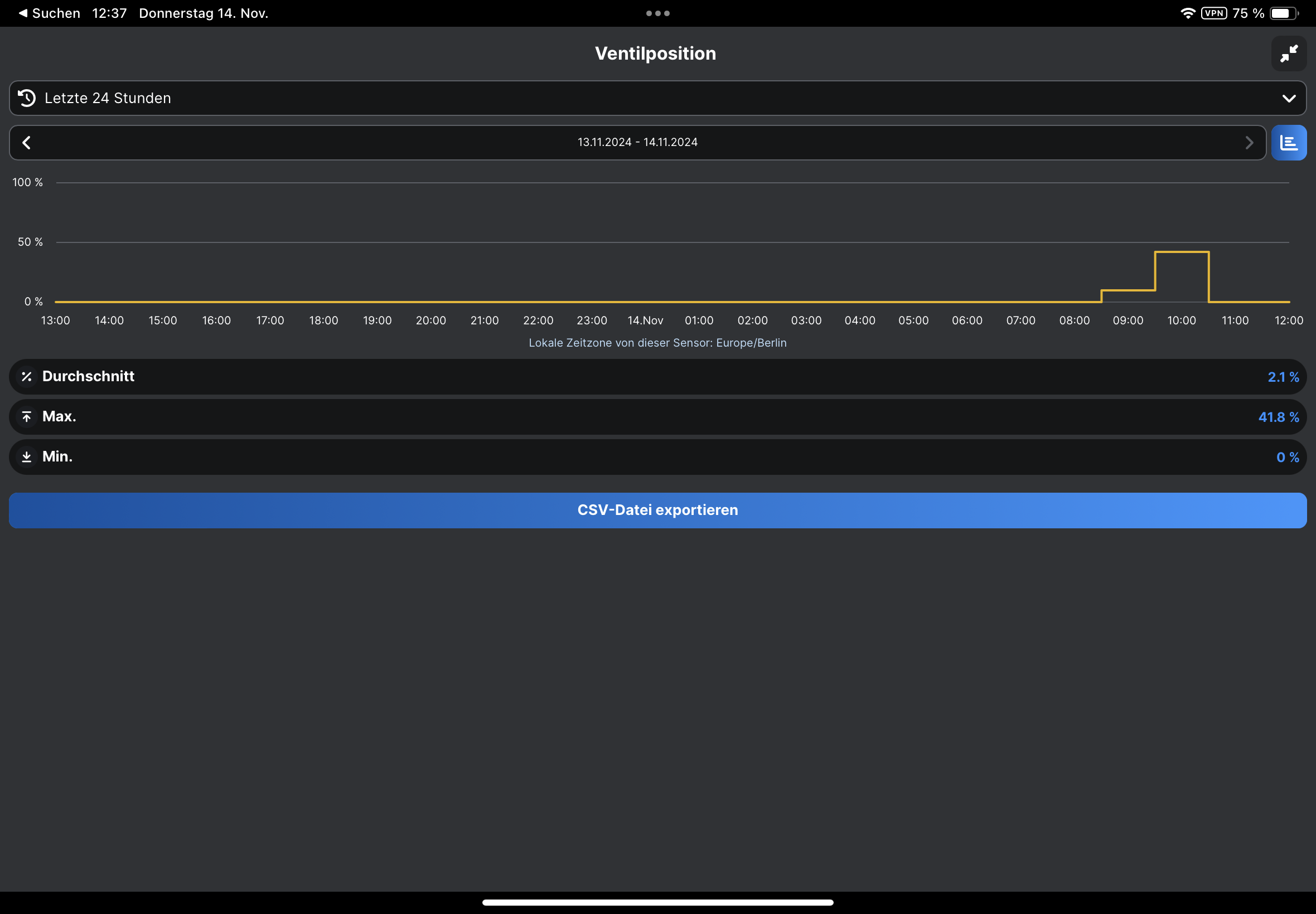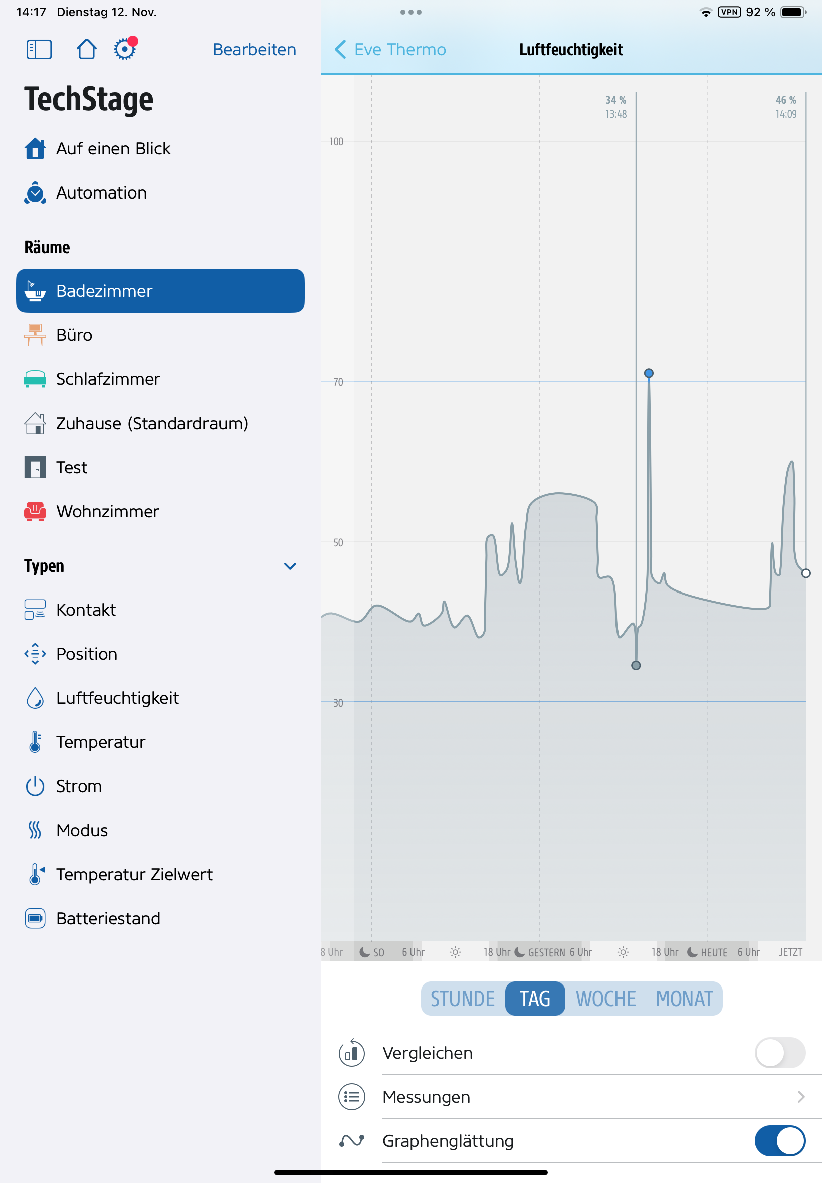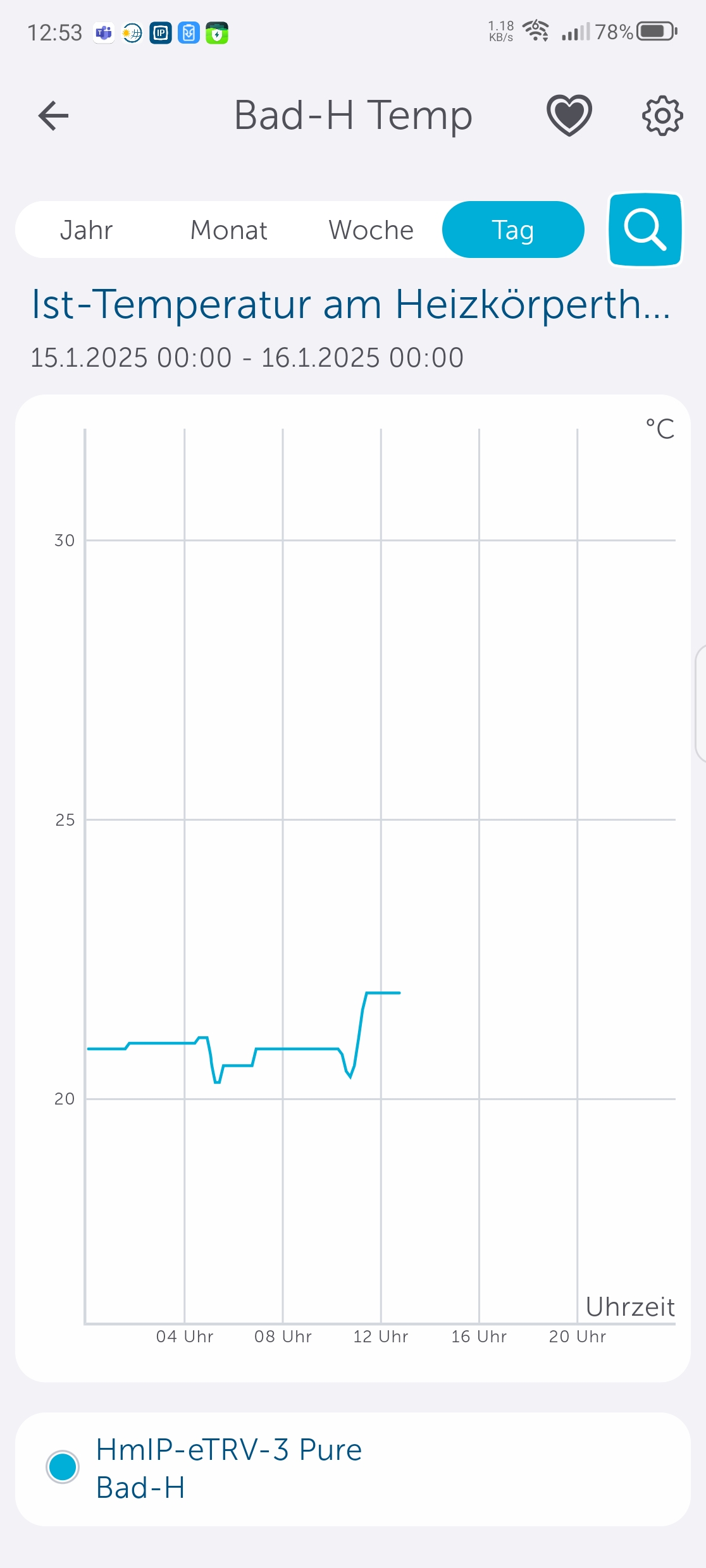 Die Tado-App sieht nicht nur schön aus, sondern bietet auch Verlaufsgrafiken für Temperatur und Heizperiode. Außerdem lässt sie sich einfach bedienen. Heizpläne sind im Handumdrehen erstellt. Tado X hält die eingestellte Temperatur relativ konstant. Der Peak am Morgen wurde durch heiße Dusche verursacht. TechStage.de