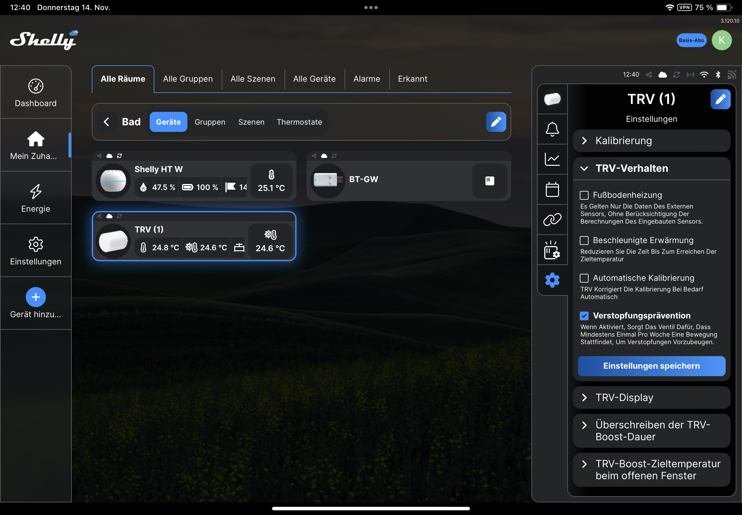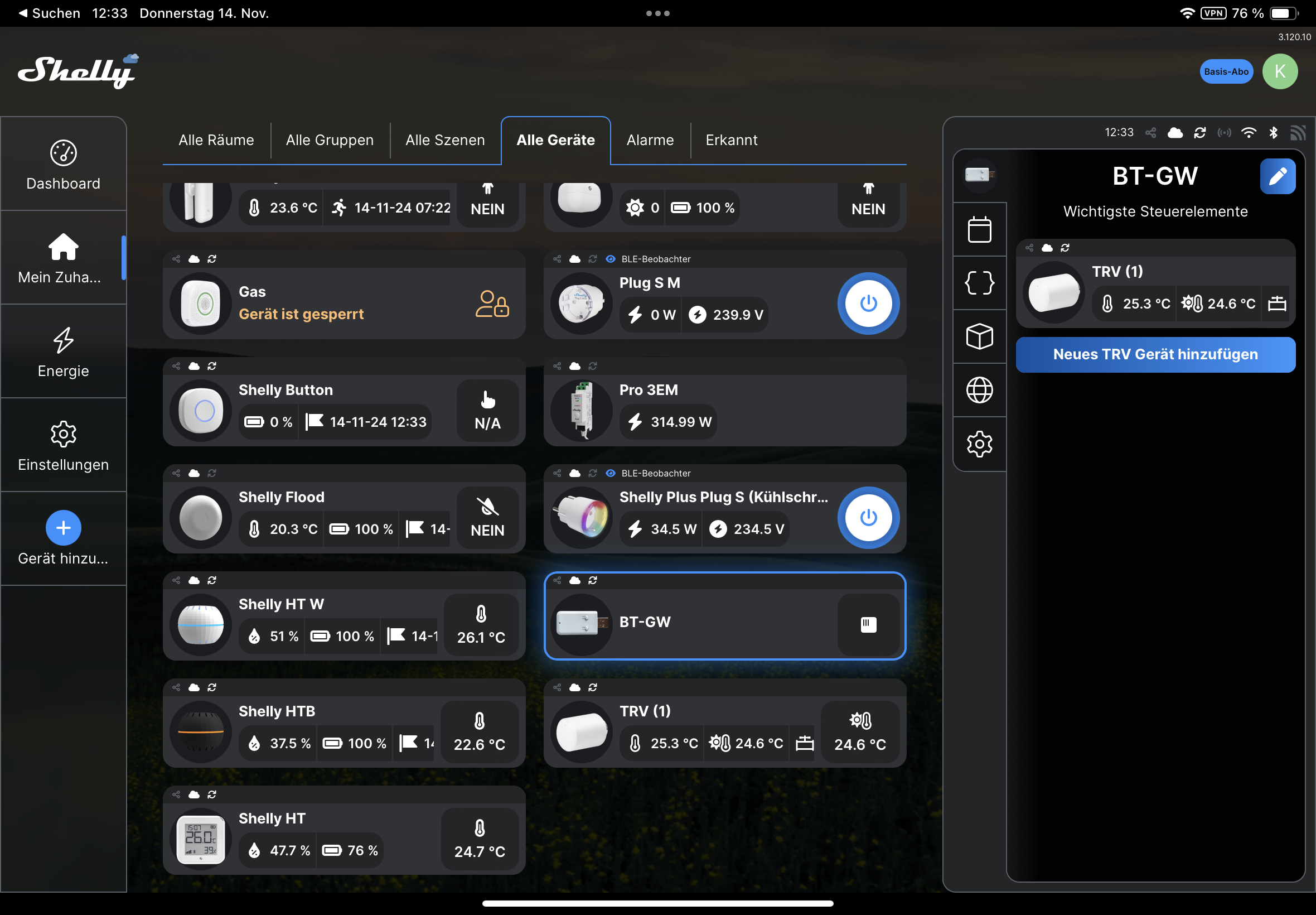 Anders als das auf WLAN basierende Vorgängermodell lässt sich Shelly BLU TRV derzeit nicht ohne Weiteres sinnvoll in Smart-Home-Systeme (Bestenliste) wie Home Assistant (Testbericht) einbinden. Die Open-Source-Lösung bietet zwar eine Integration, doch bietet diese derzeit noch keine Steuerungsmöglichkeit. Erst mithilfe eines MQTT-Brokers und ein wenig YAML-Code für die betreffende Konfigurationsdatei gelingt die Integration in Home Assistant. Mit Homey Pro (Testbericht) und Samsung Smartthings (Testbericht), die prinzipiell Unterstützung für Shelly-Produkte bieten, konnten wir Shelly BLU TRV nicht einbinden. Auch zu Homekit ist das Shelly-Thermostat inkompatibel.