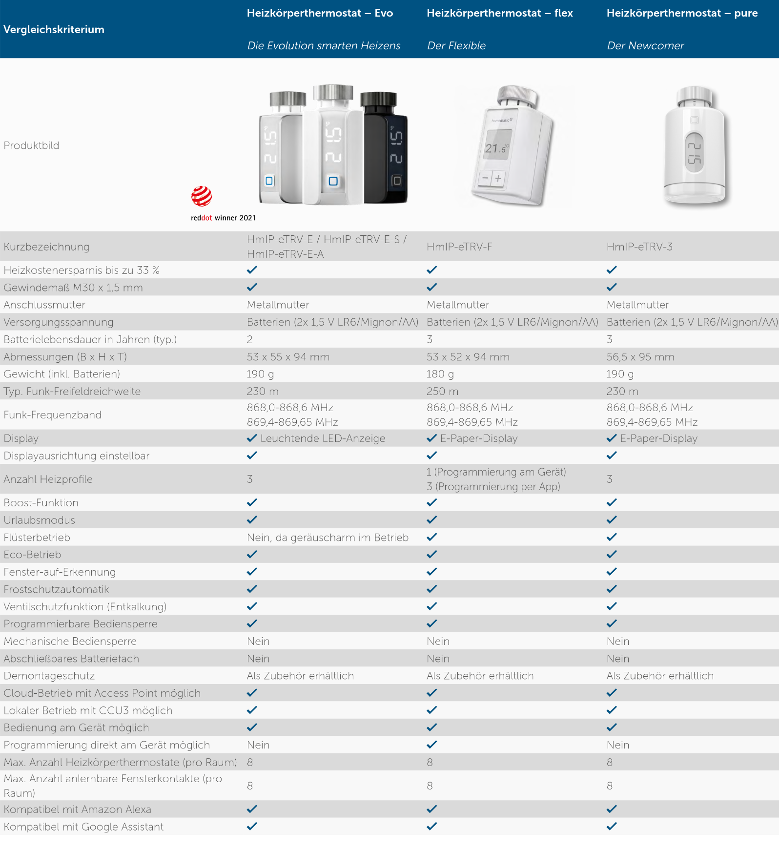 Das Homematic IP Evo bietet tolle Funktionen wie einen dynamischen hydraulischen Abgleich, ist förderfähig und lässt sich mit zahlreichen Smart-Home-Komponenten von EQ-3 kombinieren. Letzteres gilt auch für die neuen, etwas preiswerteren Modelle, Flex und Pure.