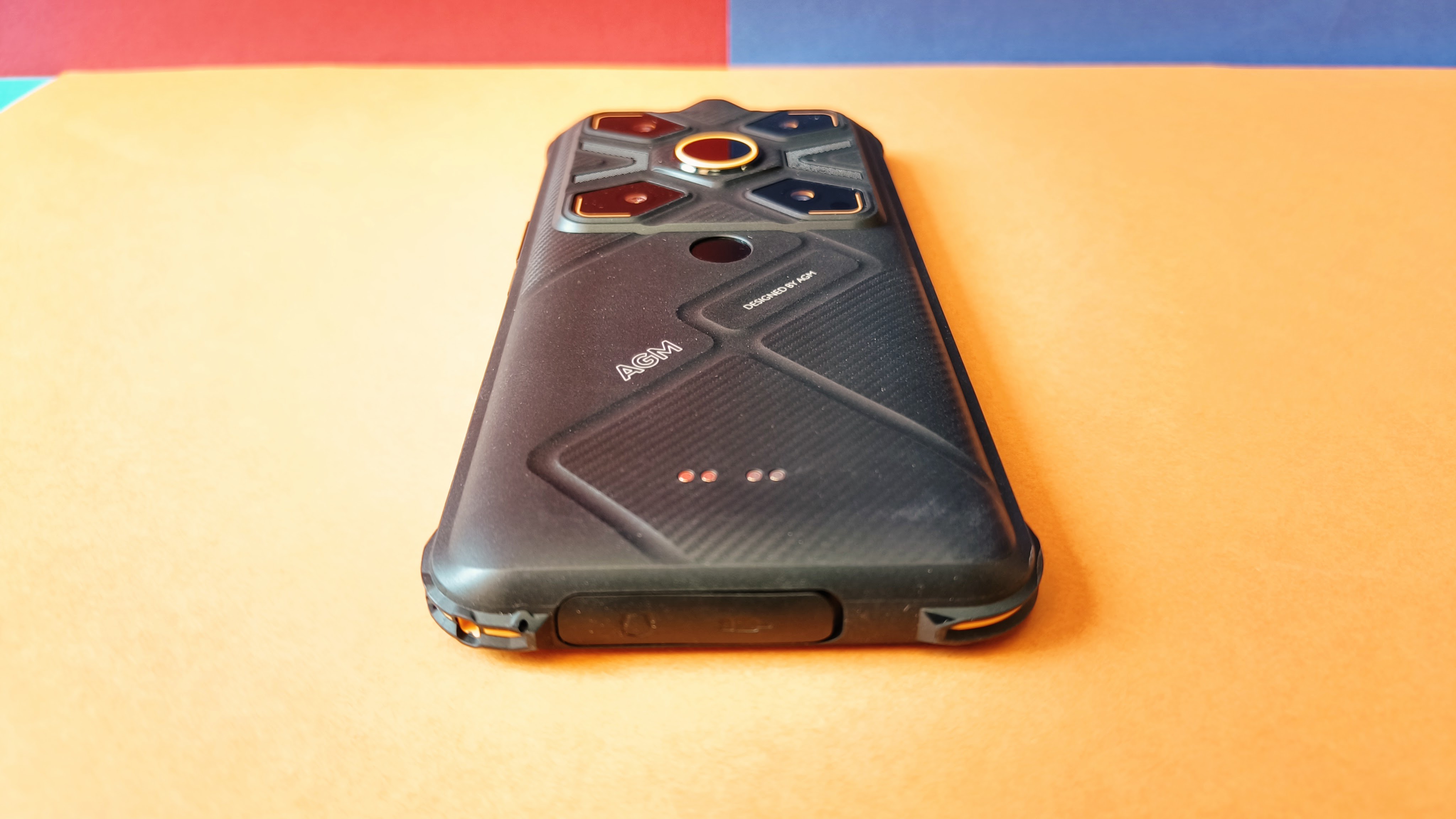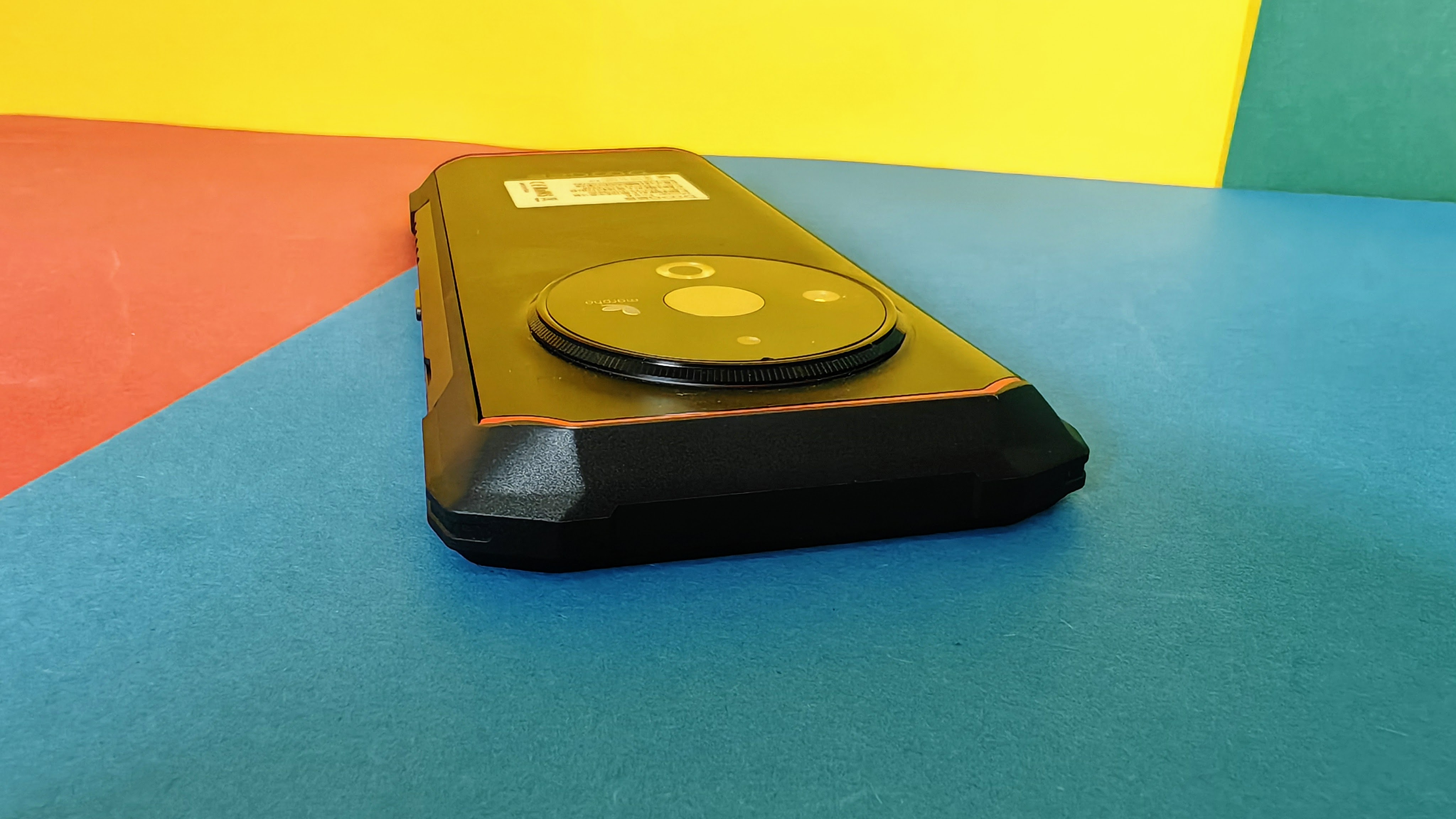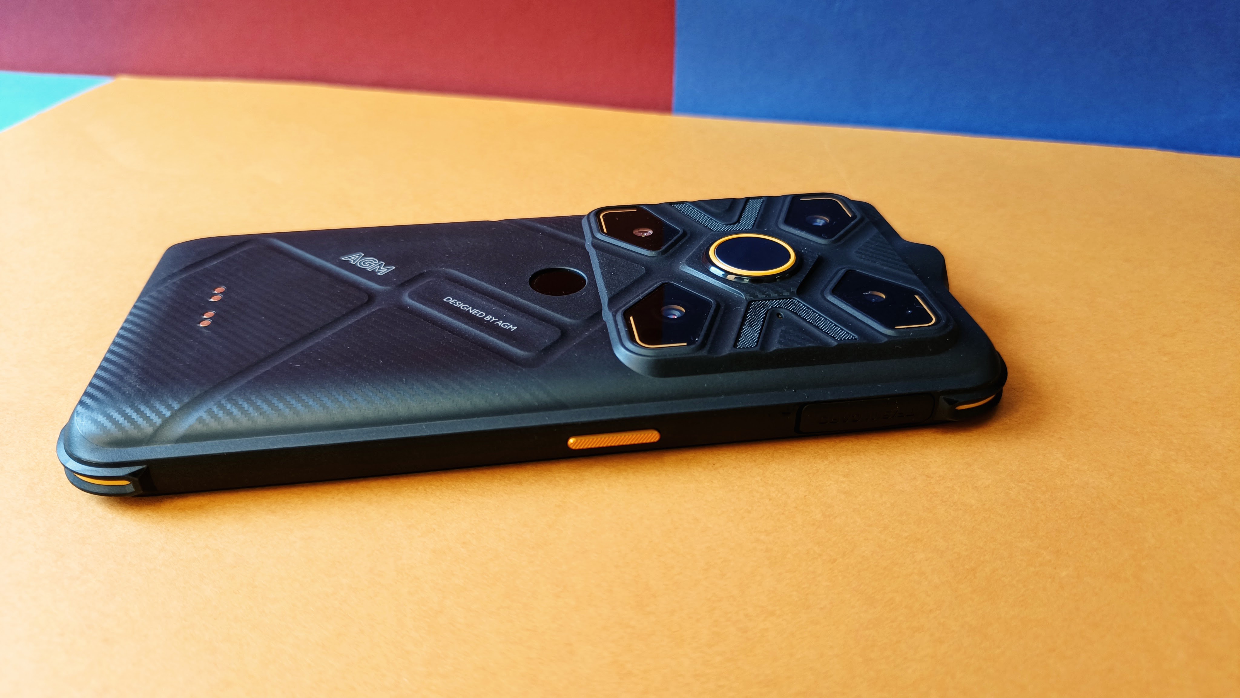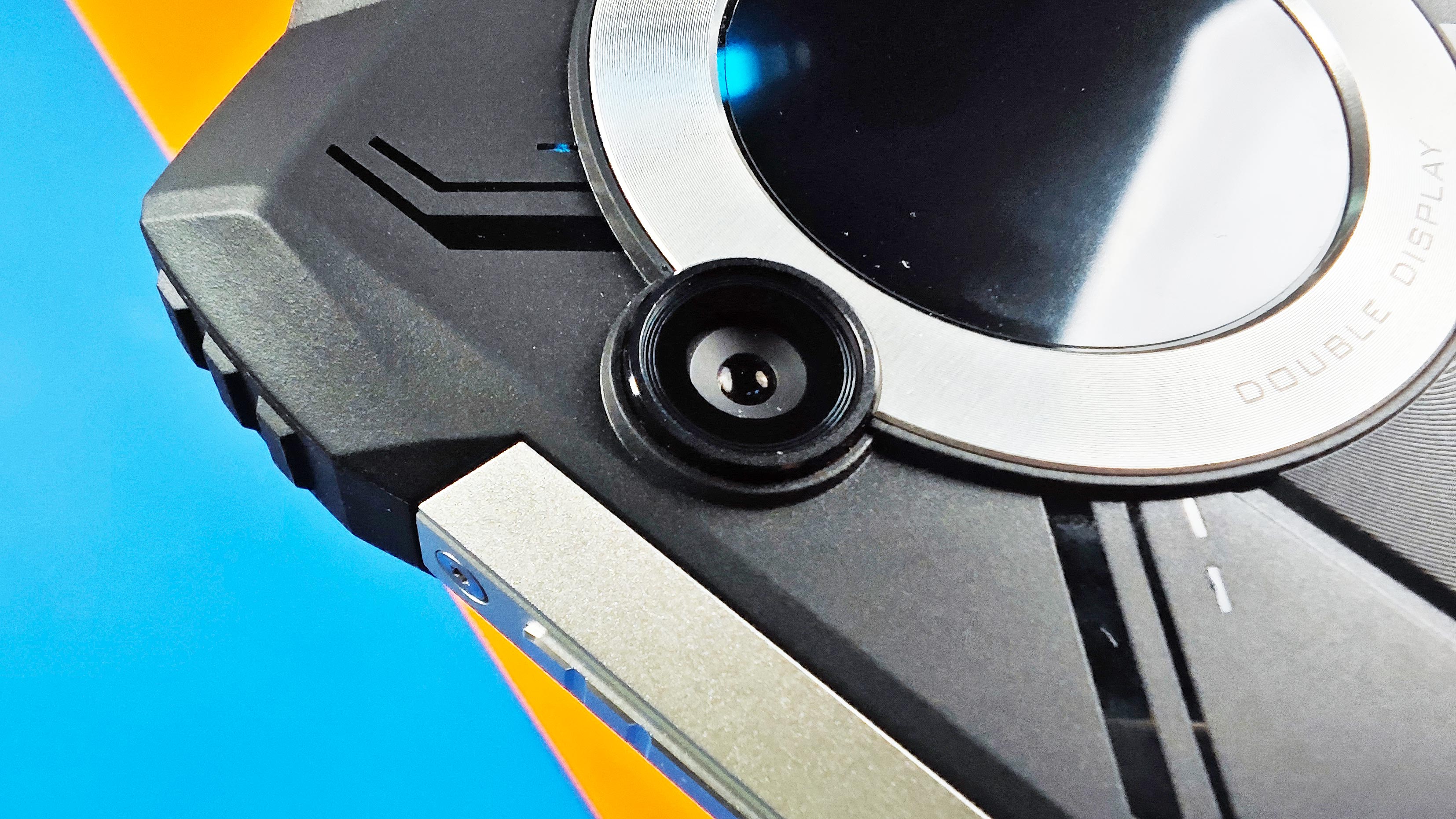 Das Design ist typisch für die Kategorie: achteckige Form, gummierte Kanten und ein verstärkter Metallrahmen. Auffällig ist das große Kameramodul auf der Rückseite. In der Mitte sitzt zusätzlich ein kleines Zweit-Display. Weitere Besonderheiten: Ein orangefarbener Kamera-Button auf der rechten Seite, eine frei belegbare Taste auf der linken und ein seitlich integrierter Fingerabdrucksensor im Power-Button. Die Anschlüsse – USB-C und 3,5-mm-Klinke – sind durch Gummilaschen geschützt.
