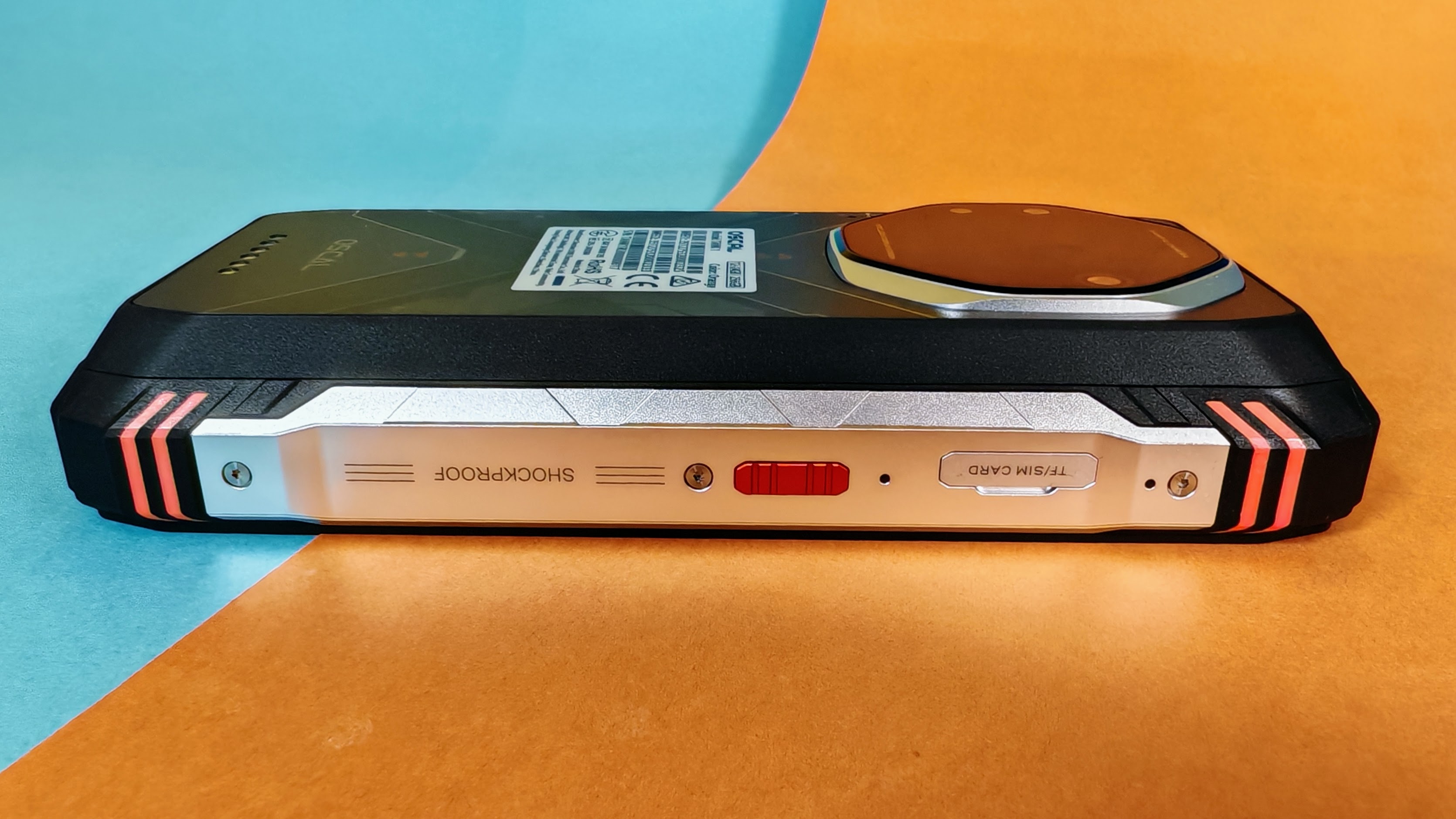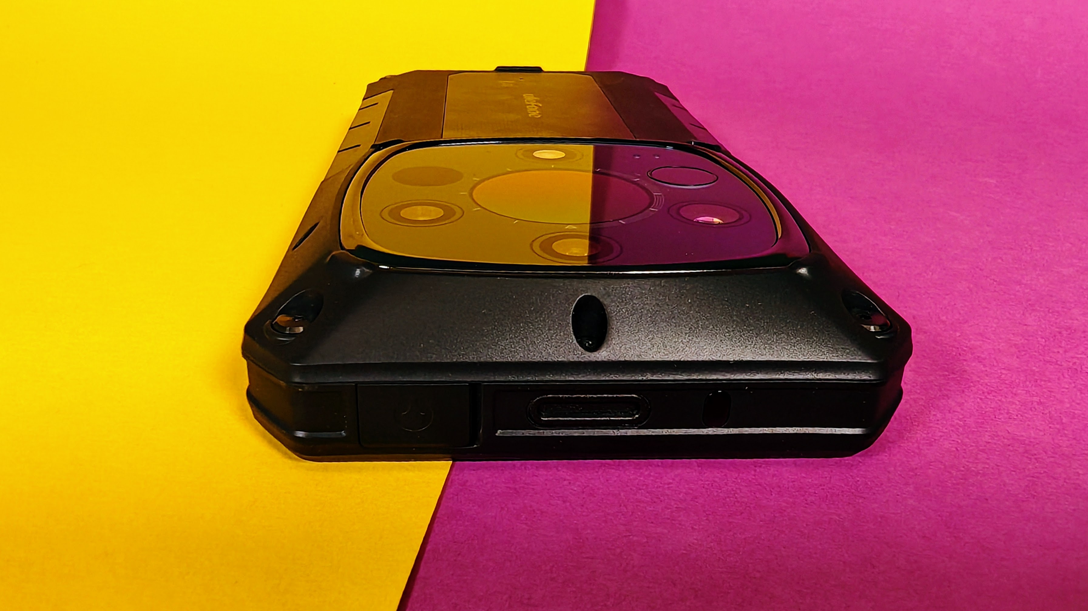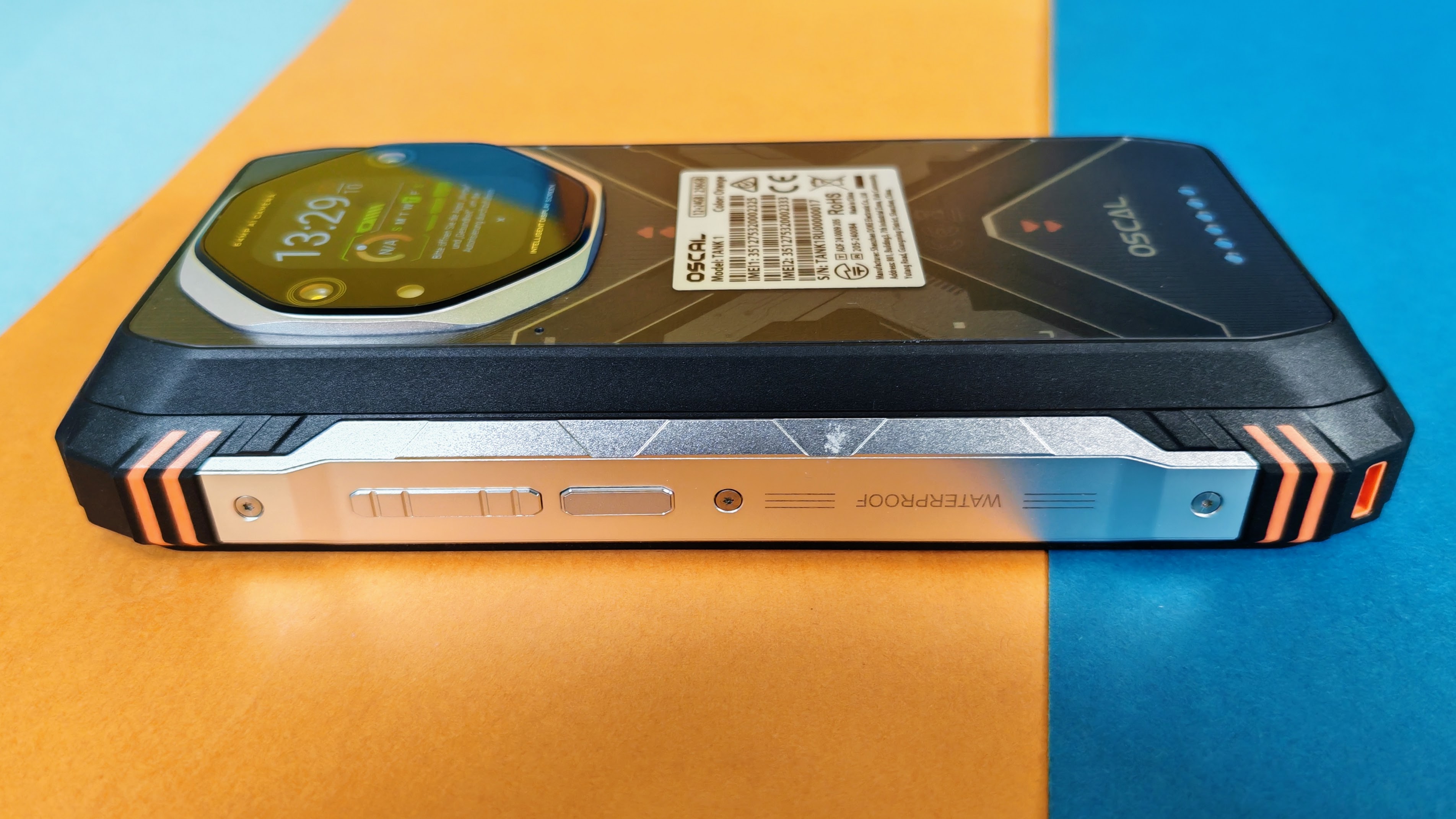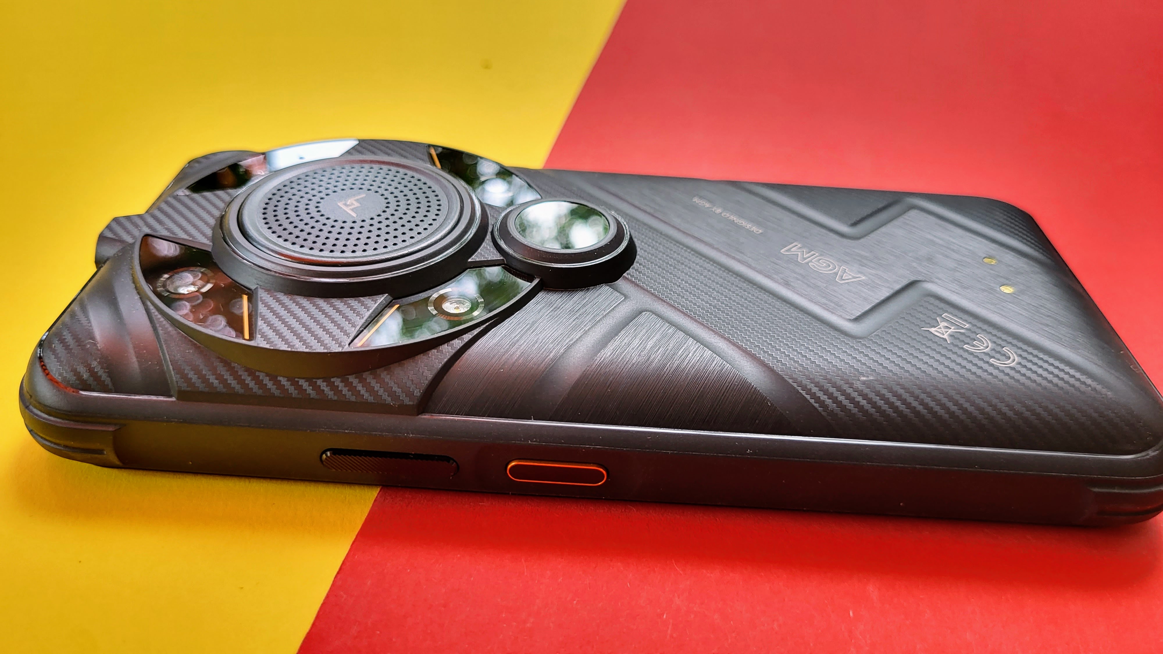 Das Design ist typisch für die Kategorie: achteckige Form, gummierte Kanten und ein verstärkter Metallrahmen. Auffällig ist das große Kameramodul auf der Rückseite. In der Mitte sitzt zusätzlich ein kleines Zweit-Display. Weitere Besonderheiten: Ein orangefarbener Kamera-Button auf der rechten Seite, eine frei belegbare Taste auf der linken und ein seitlich integrierter Fingerabdrucksensor im Power-Button. Die Anschlüsse – USB-C und 3,5-mm-Klinke – sind durch Gummilaschen geschützt.