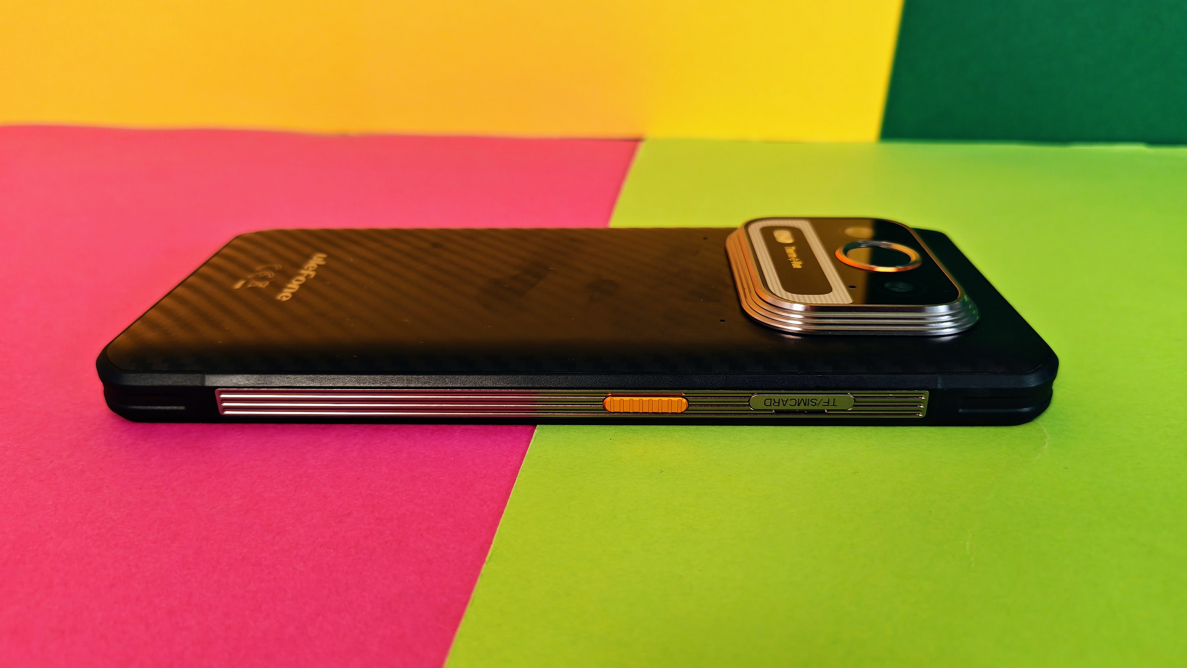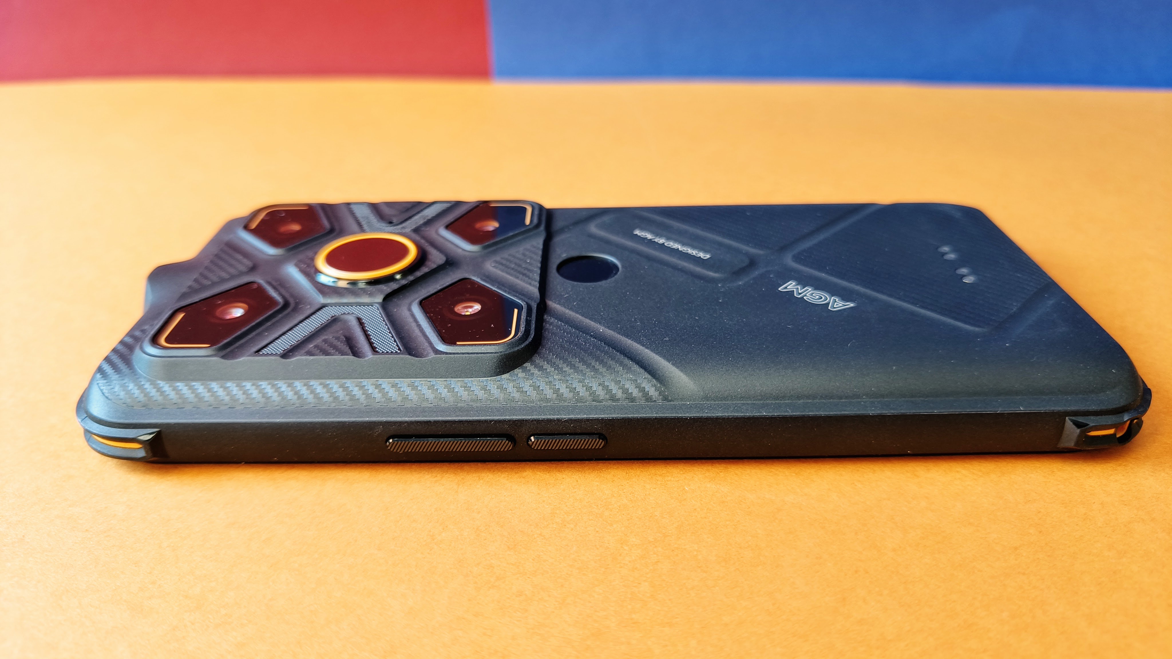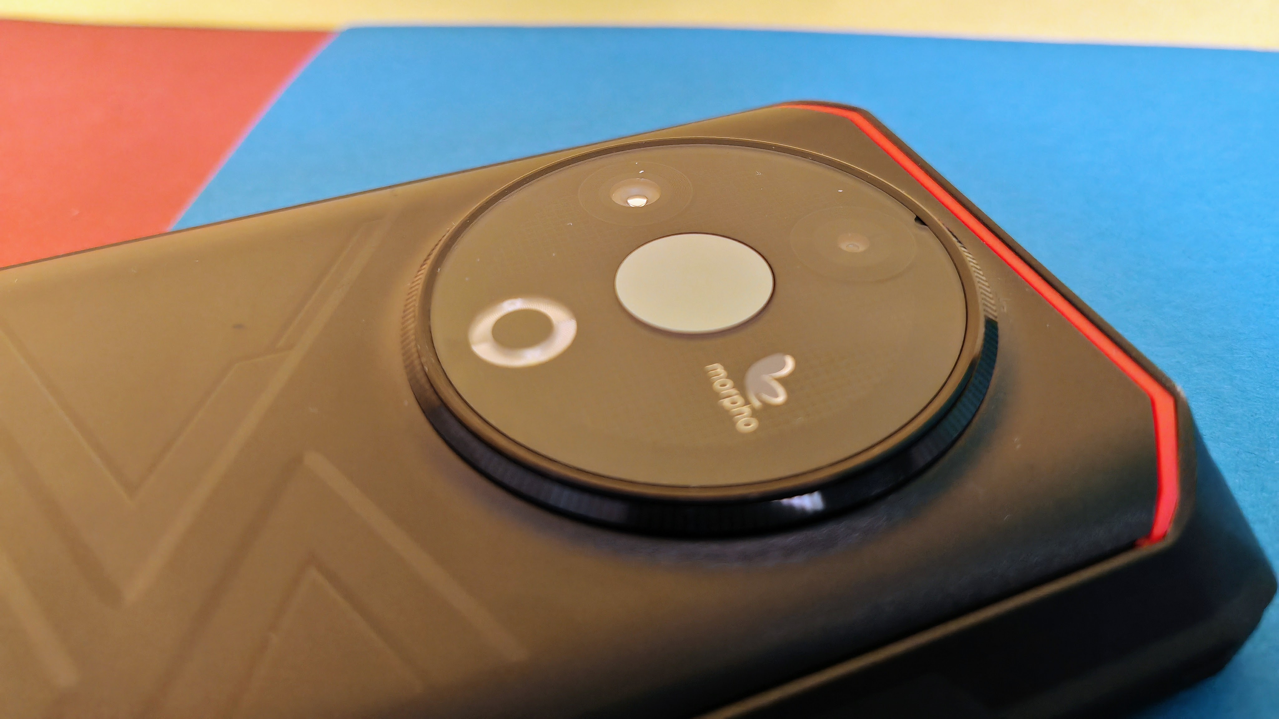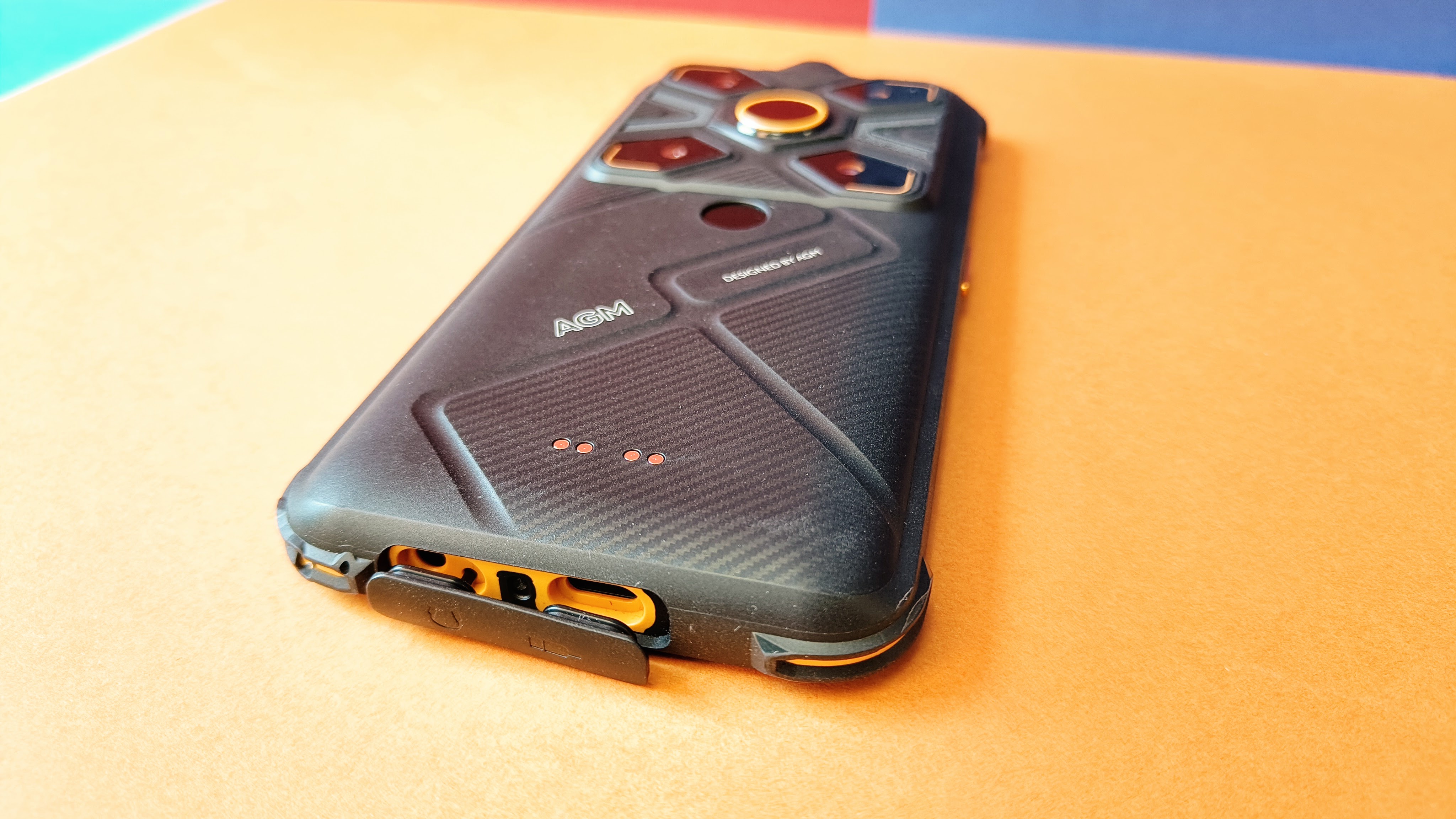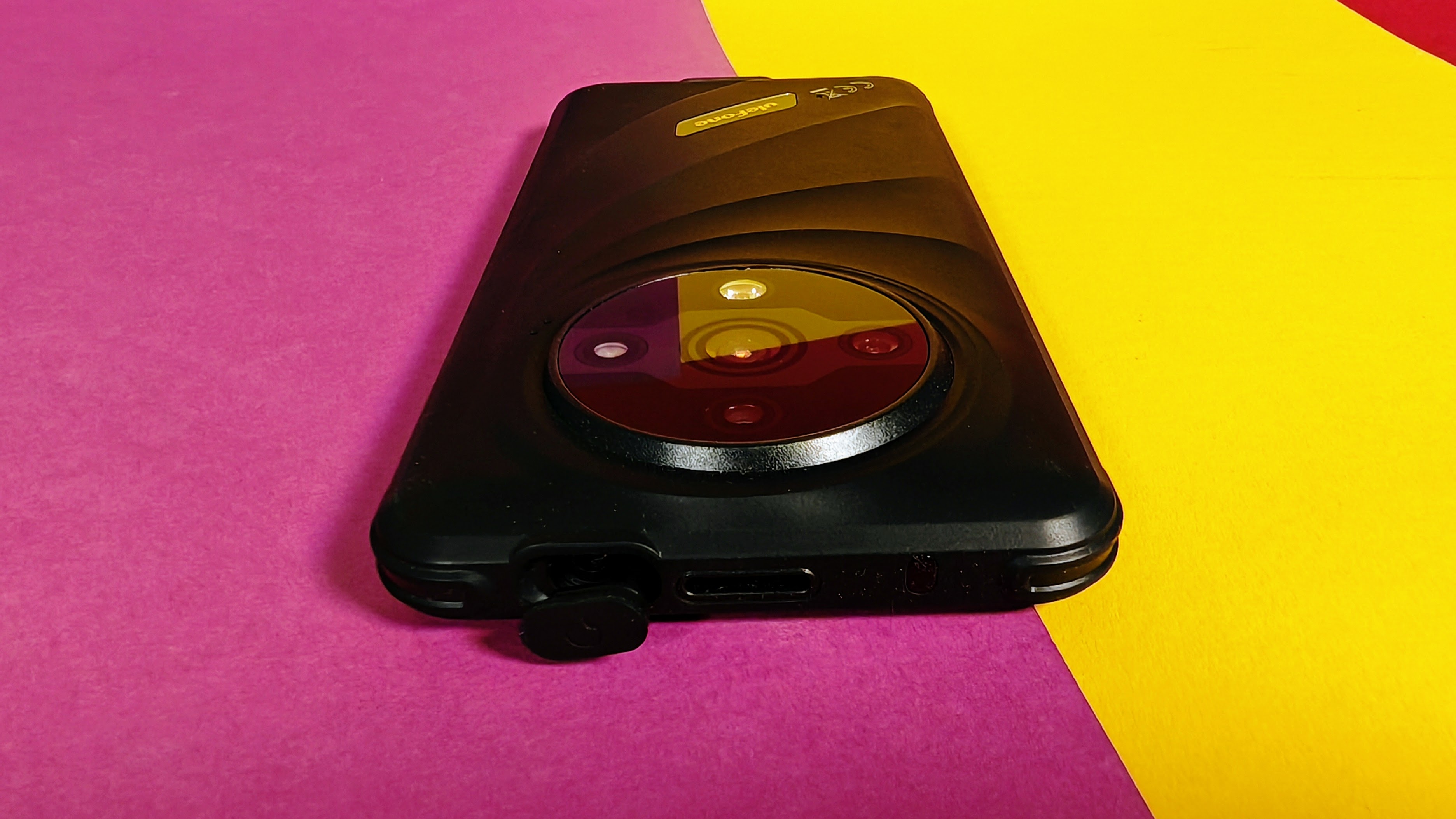 Das Design ist typisch für die Kategorie: achteckige Form, gummierte Kanten und ein verstärkter Metallrahmen. Auffällig ist das große Kameramodul auf der Rückseite. In der Mitte sitzt zusätzlich ein kleines Zweit-Display. Weitere Besonderheiten: Ein orangefarbener Kamera-Button auf der rechten Seite, eine frei belegbare Taste auf der linken und ein seitlich integrierter Fingerabdrucksensor im Power-Button. Die Anschlüsse – USB-C und 3,5-mm-Klinke – sind durch Gummilaschen geschützt.