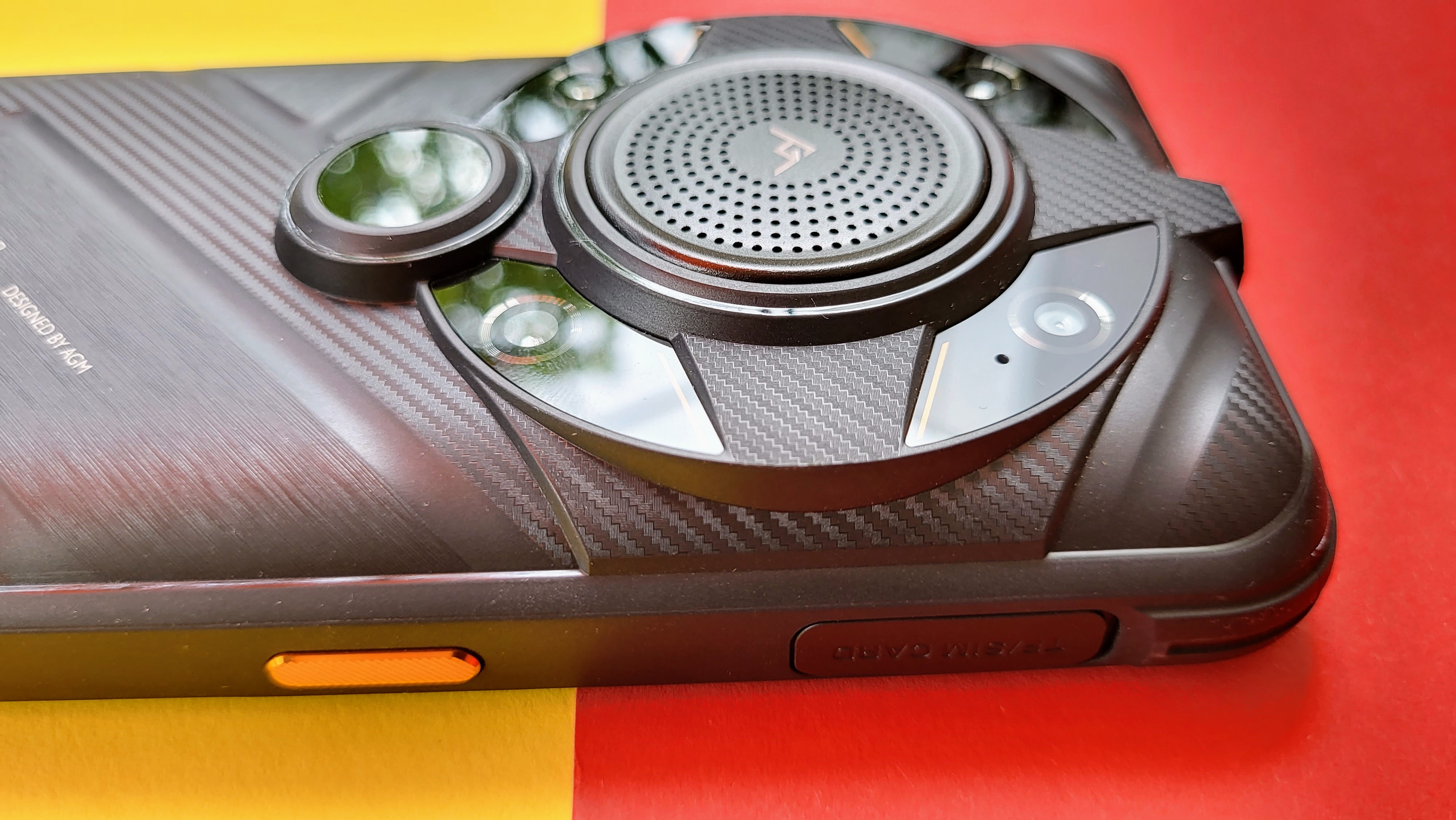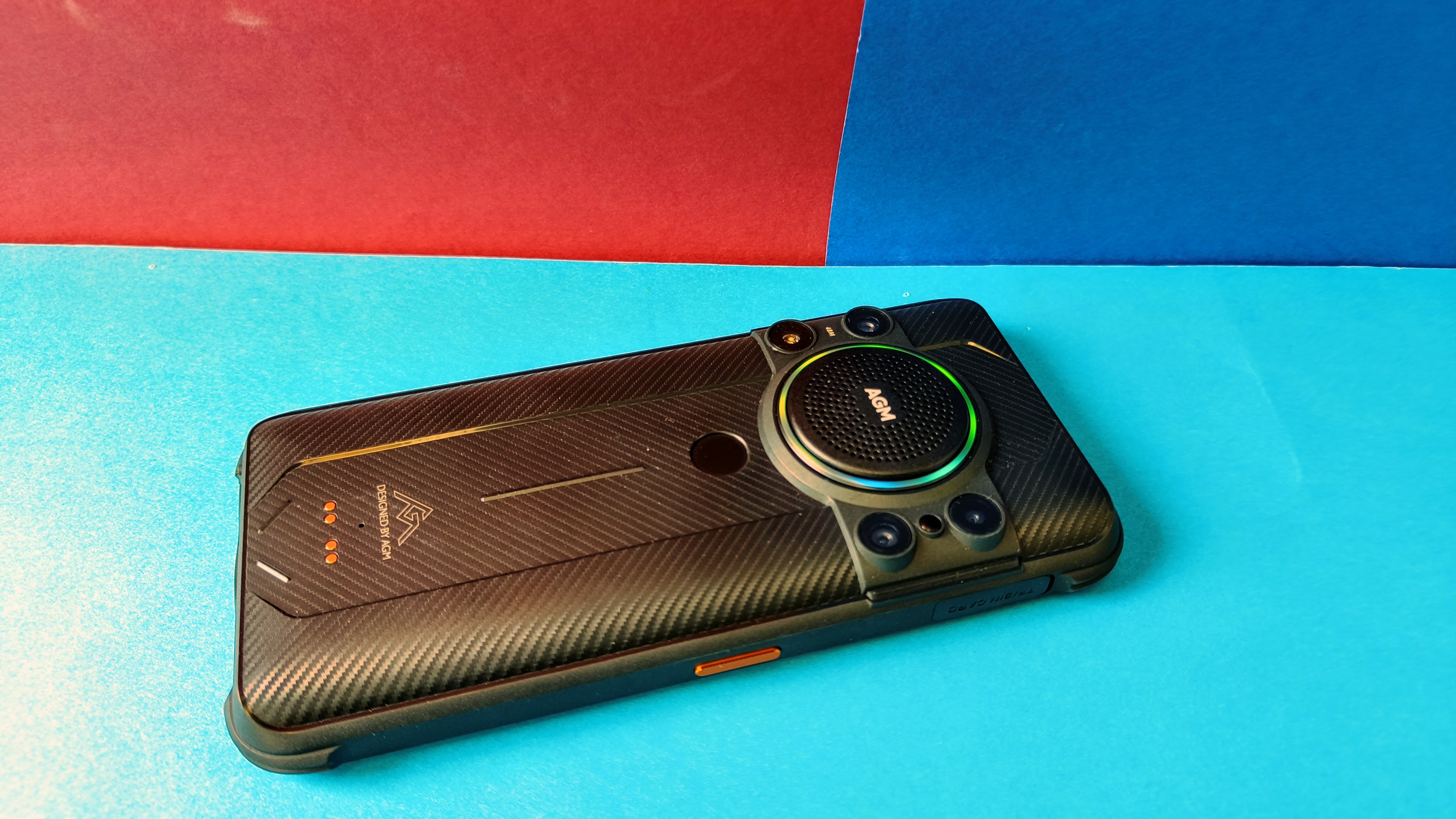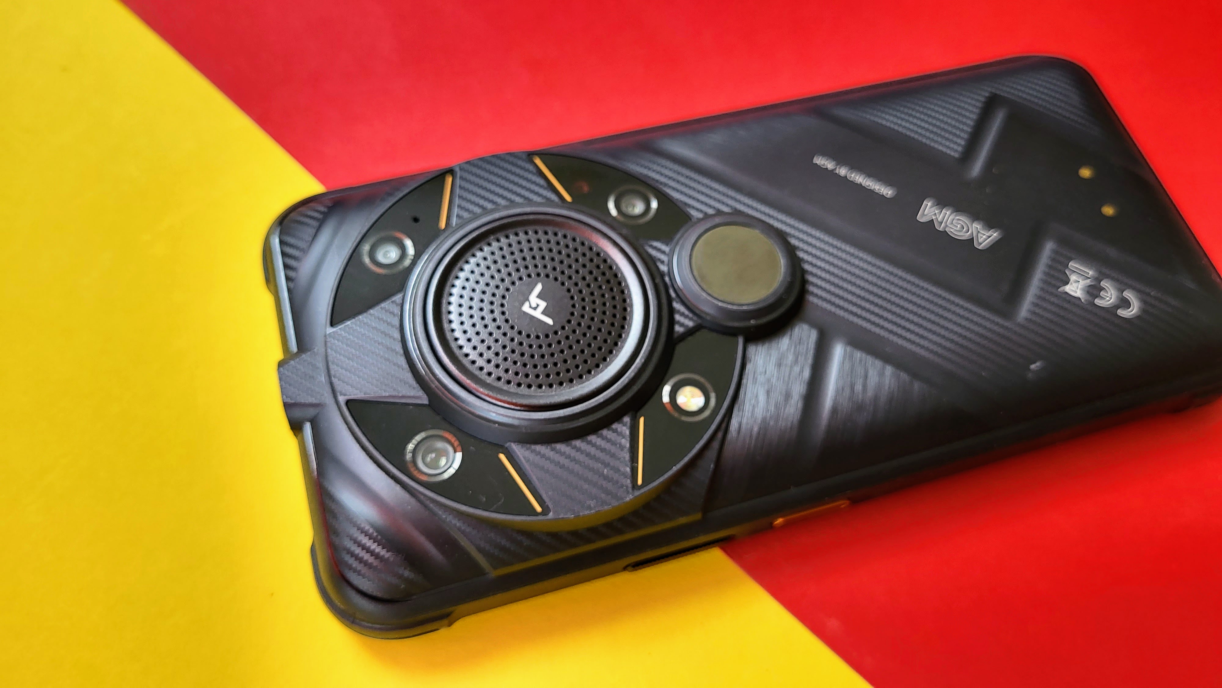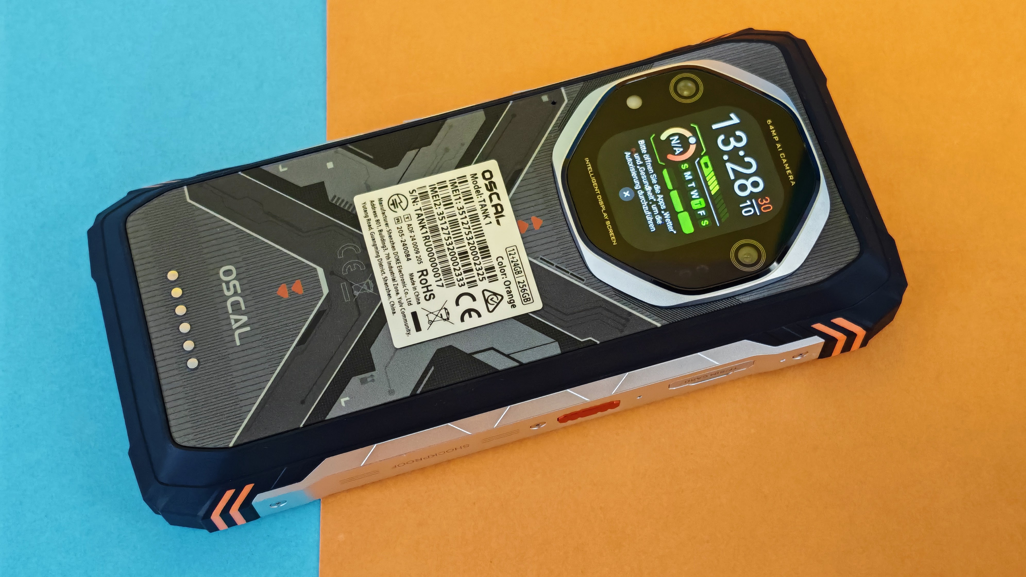 Das Design ist typisch für die Kategorie: achteckige Form, gummierte Kanten und ein verstärkter Metallrahmen. Auffällig ist das große Kameramodul auf der Rückseite. In der Mitte sitzt zusätzlich ein kleines Zweit-Display. Weitere Besonderheiten: Ein orangefarbener Kamera-Button auf der rechten Seite, eine frei belegbare Taste auf der linken und ein seitlich integrierter Fingerabdrucksensor im Power-Button. Die Anschlüsse – USB-C und 3,5-mm-Klinke – sind durch Gummilaschen geschützt.