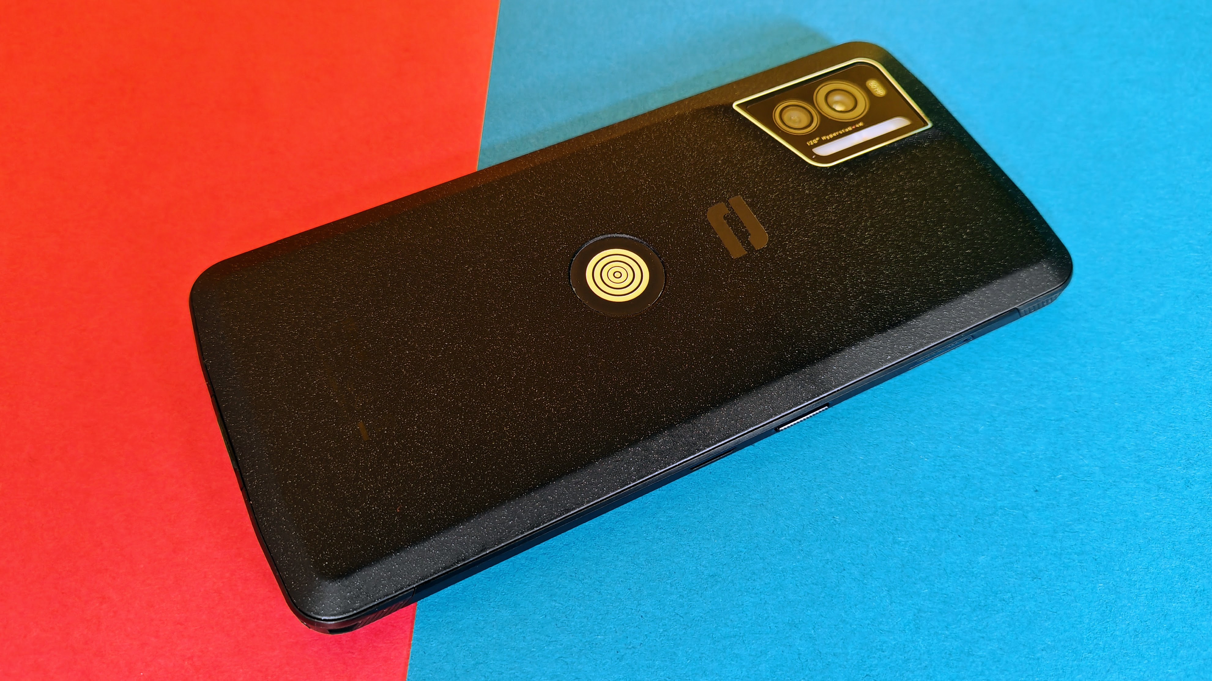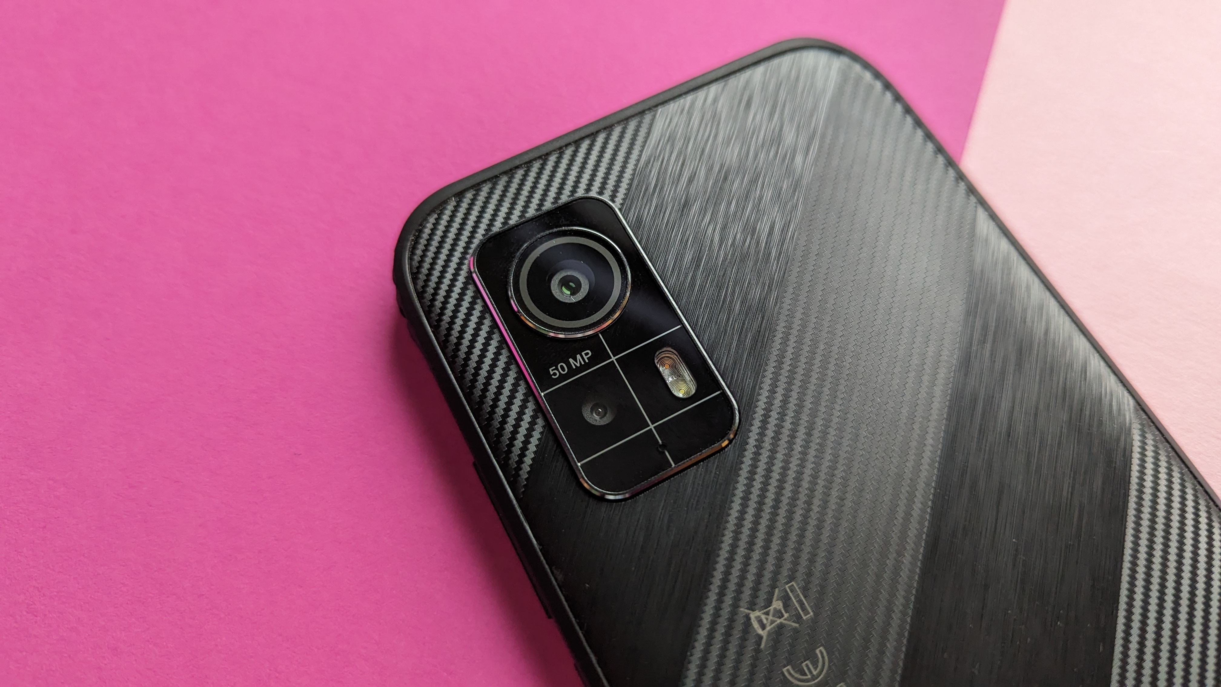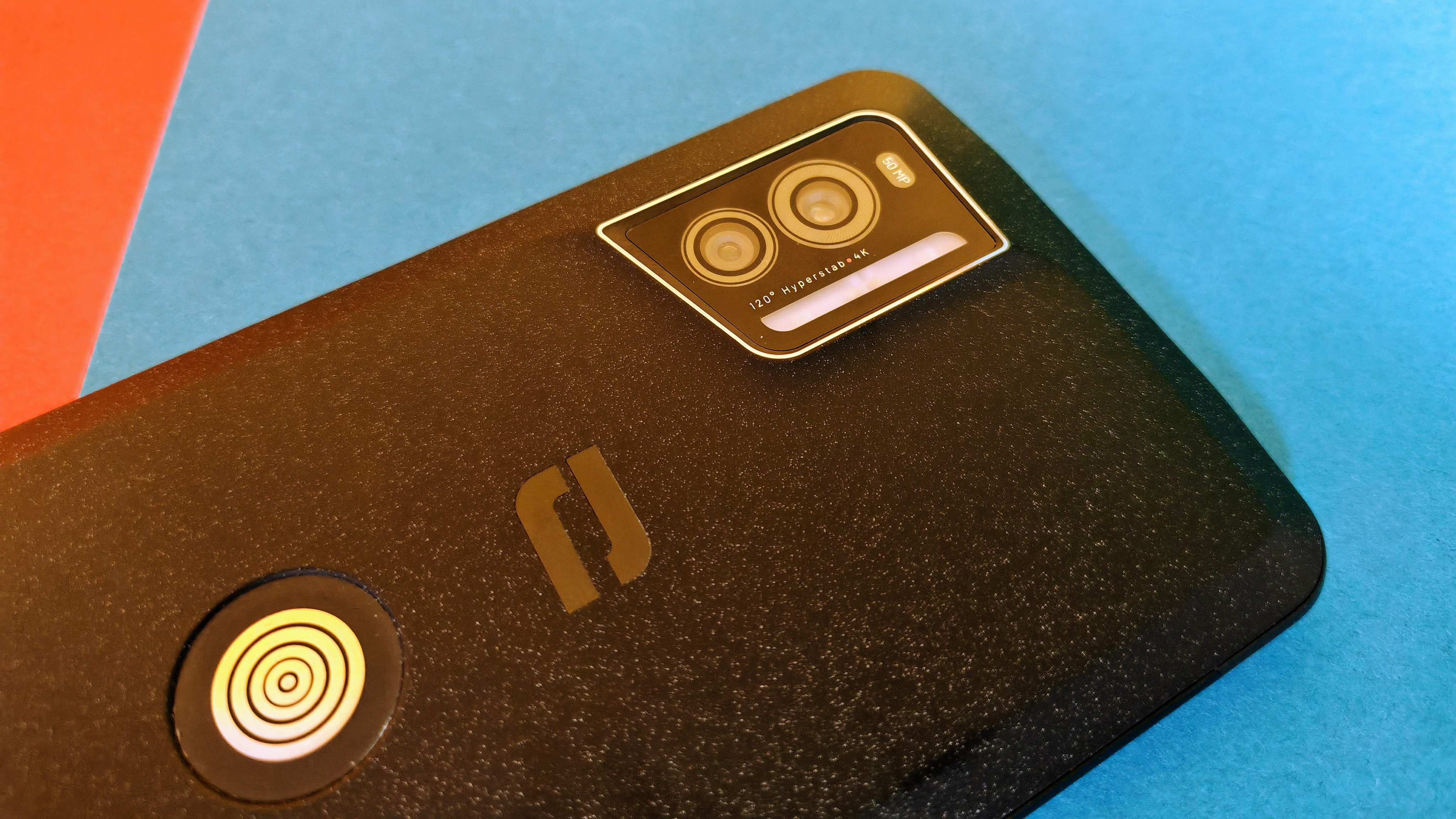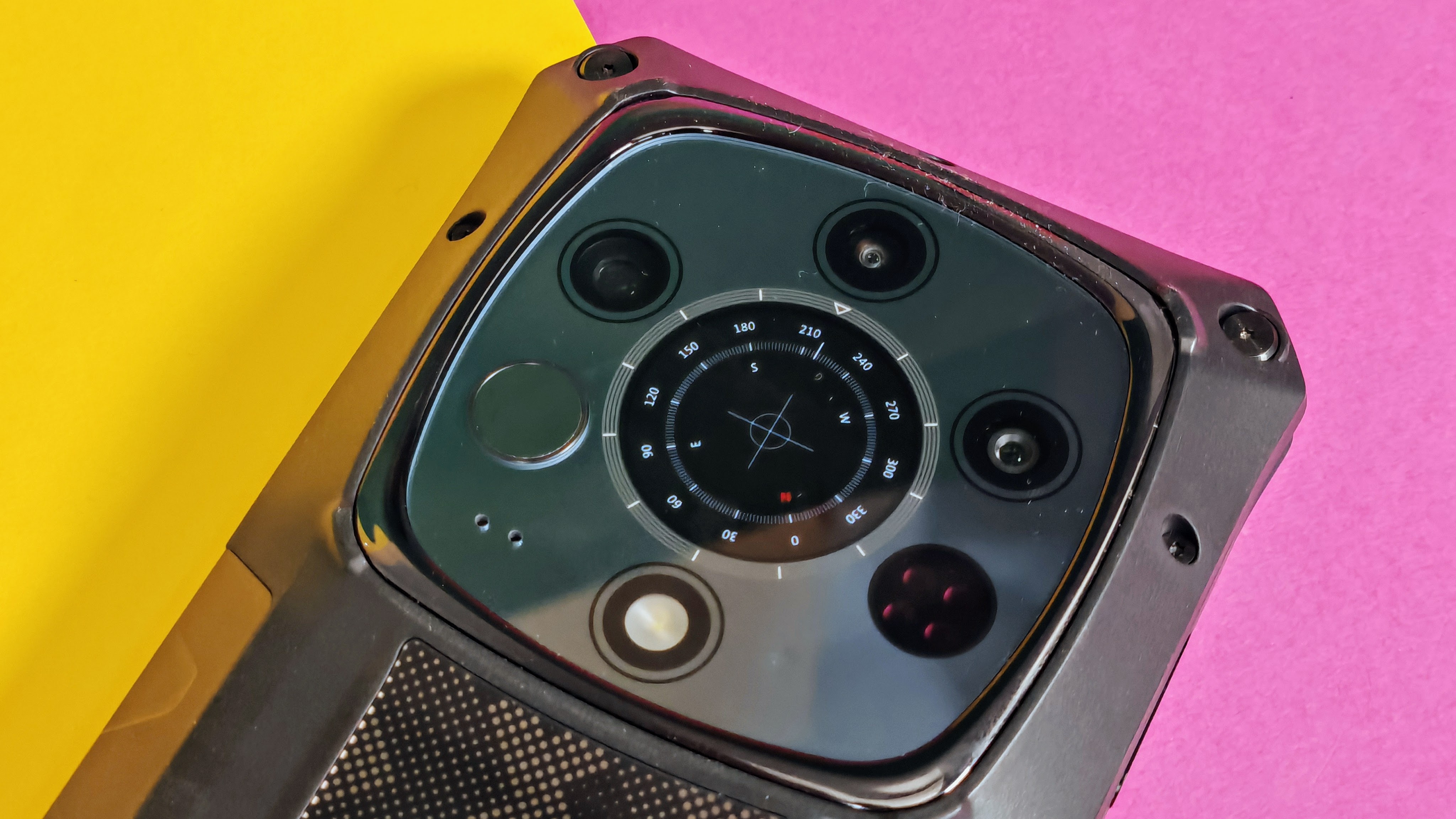 Das Design ist typisch für die Kategorie: achteckige Form, gummierte Kanten und ein verstärkter Metallrahmen. Auffällig ist das große Kameramodul auf der Rückseite. In der Mitte sitzt zusätzlich ein kleines Zweit-Display. Weitere Besonderheiten: Ein orangefarbener Kamera-Button auf der rechten Seite, eine frei belegbare Taste auf der linken und ein seitlich integrierter Fingerabdrucksensor im Power-Button. Die Anschlüsse – USB-C und 3,5-mm-Klinke – sind durch Gummilaschen geschützt.