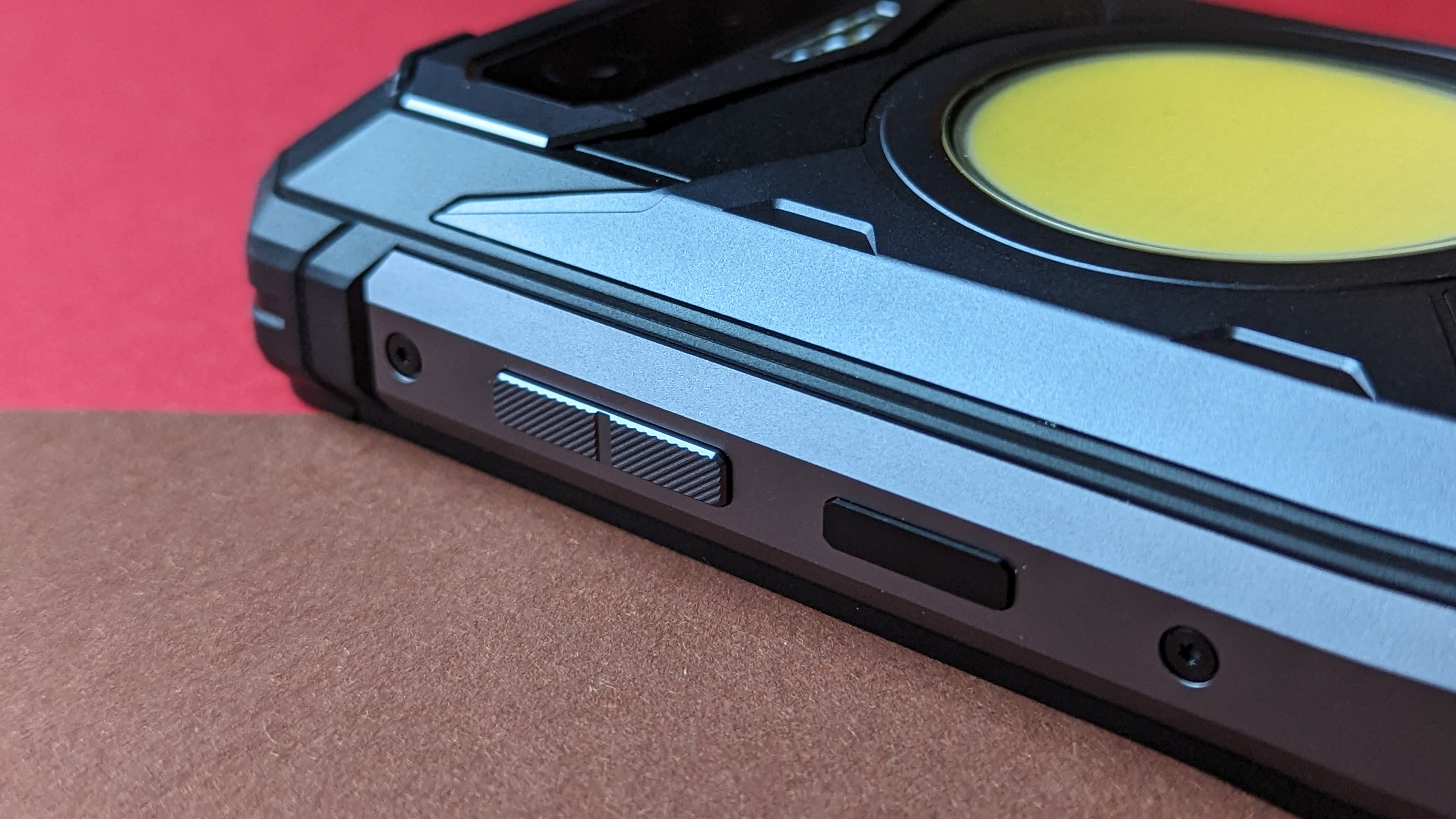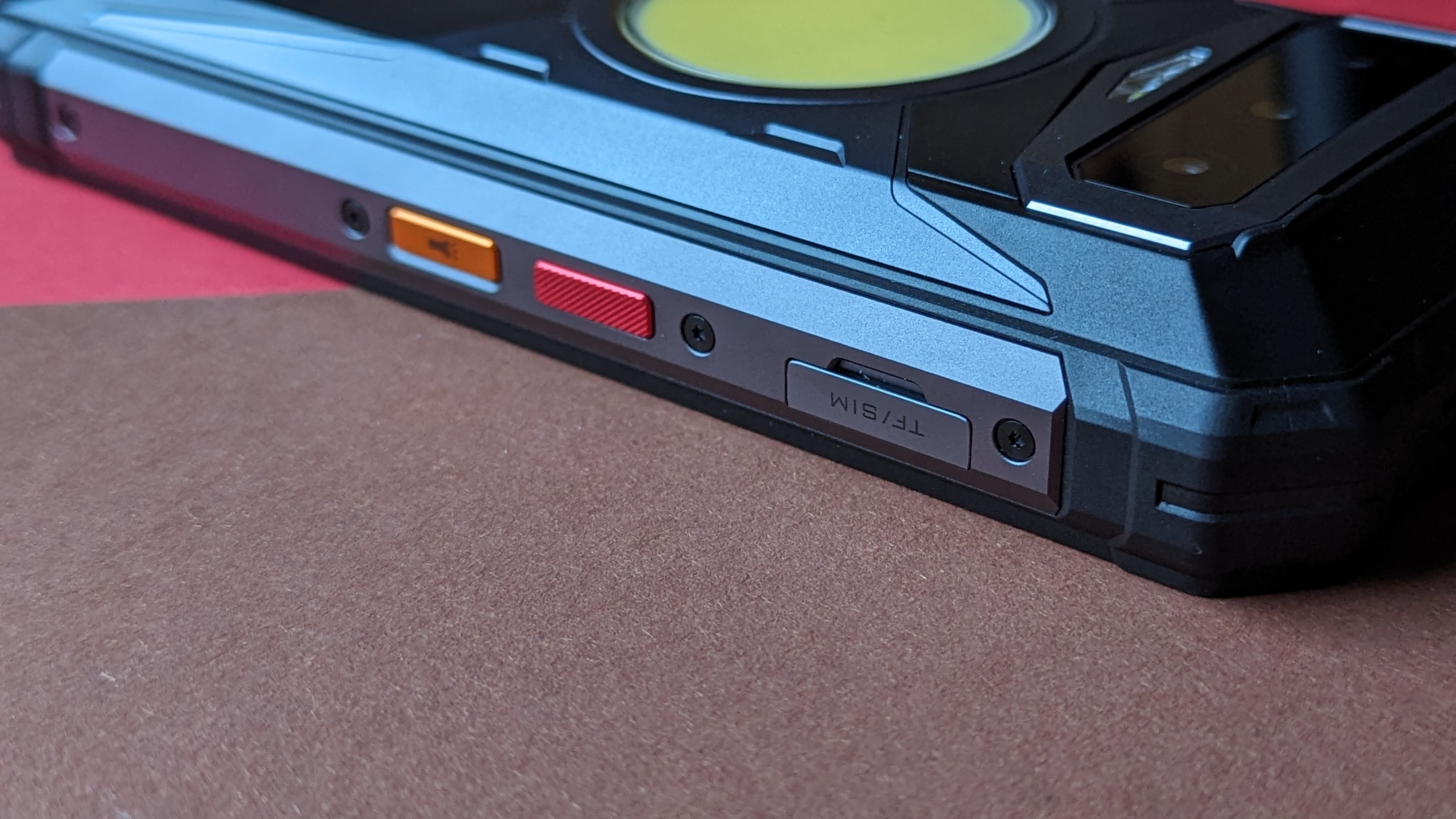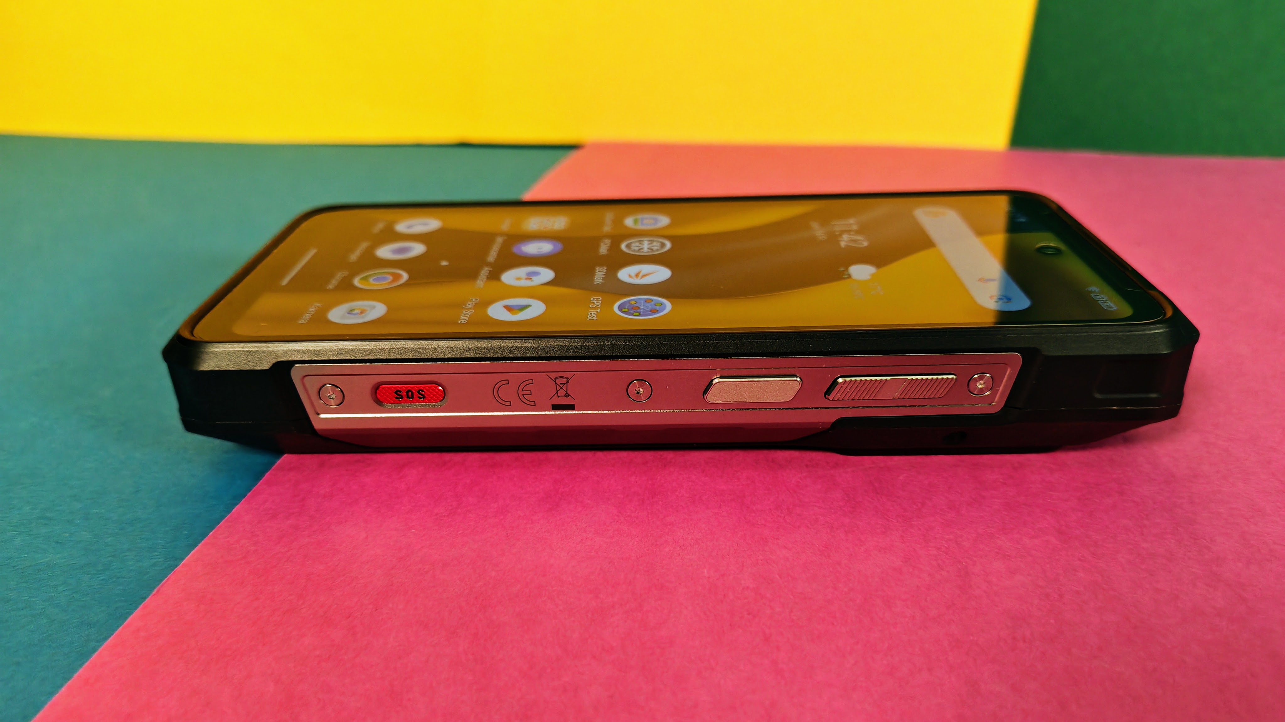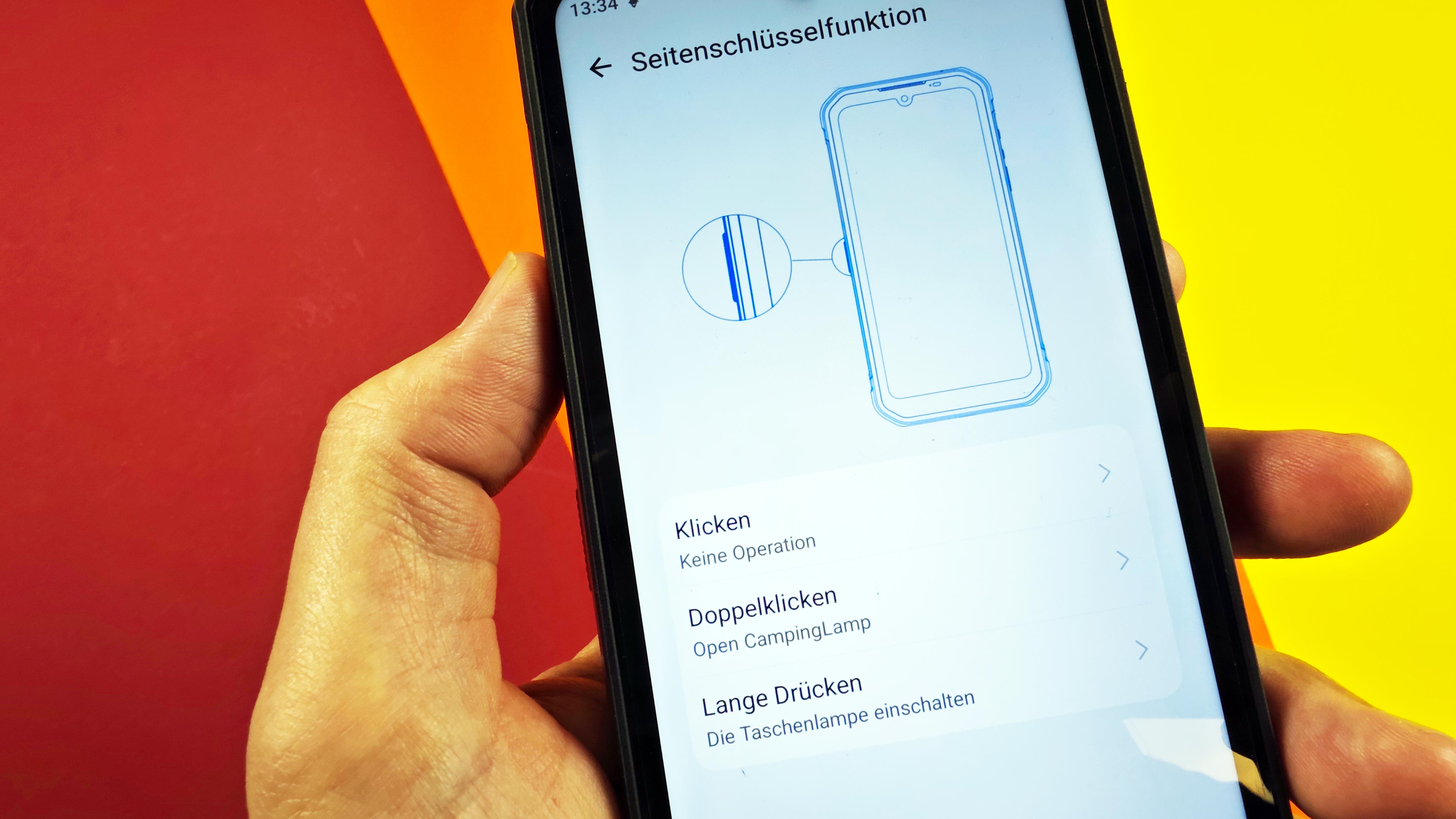 Mit einem Gewicht von 311 g bringt das WP200 Pro deutlich mehr auf die Waage als herkömmliche Smartphones. Seine Abmessungen von 163,6 × 77,9 × 13,7 mm machen es zudem zu einem recht massiven Gerät. Dennoch fällt es etwas kompakter und leichter aus als manch anderes Outdoor-Smartphone. Rechts sitzen die Lautstärkewippe und der Power-Button, während sich auf der linken Seite ein roter, programmierbarer Knopf befindet. Dieser lässt sich mit bis zu drei Funktionen belegen – für kurzes, langes oder doppeltes Drücken.