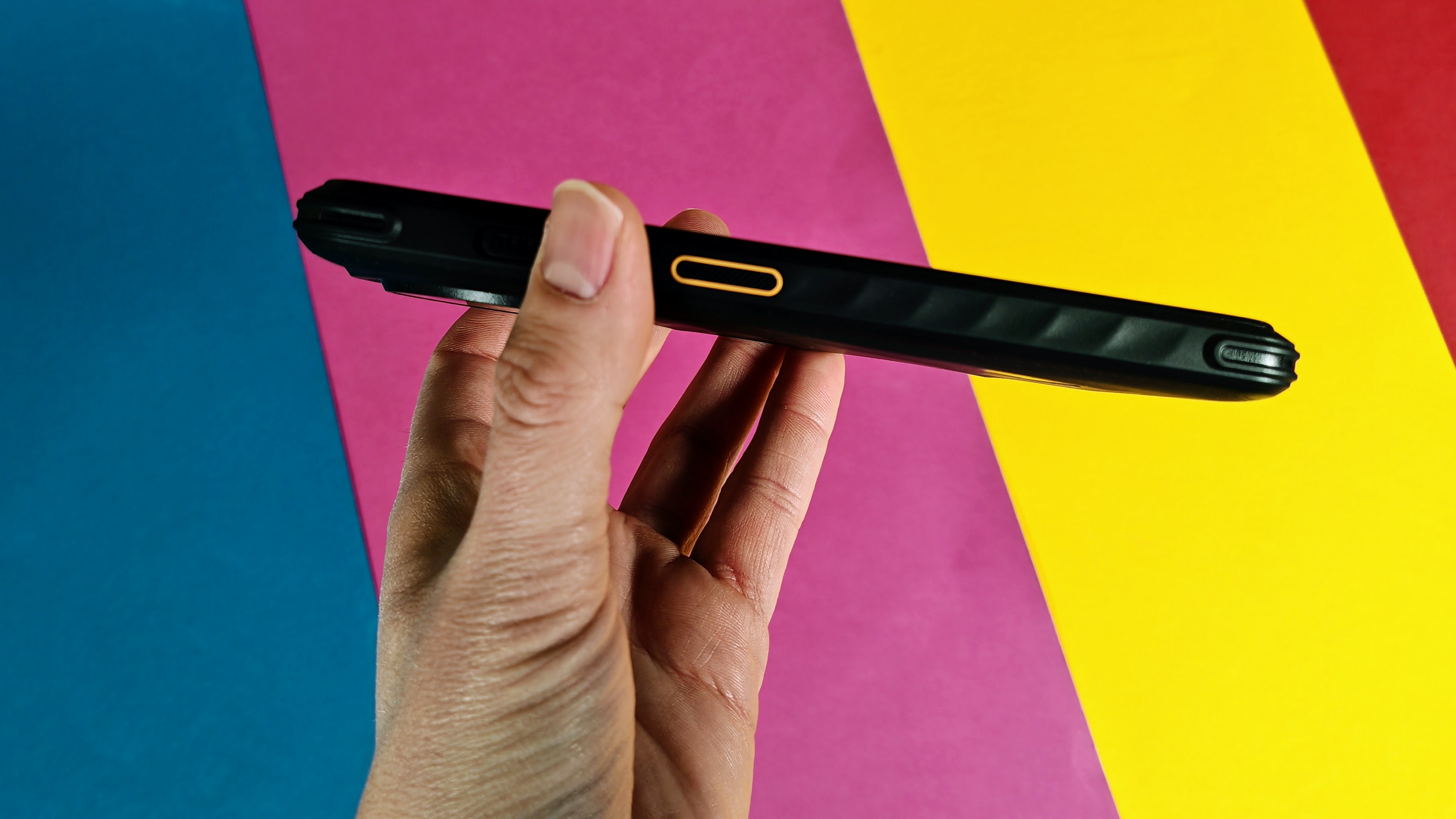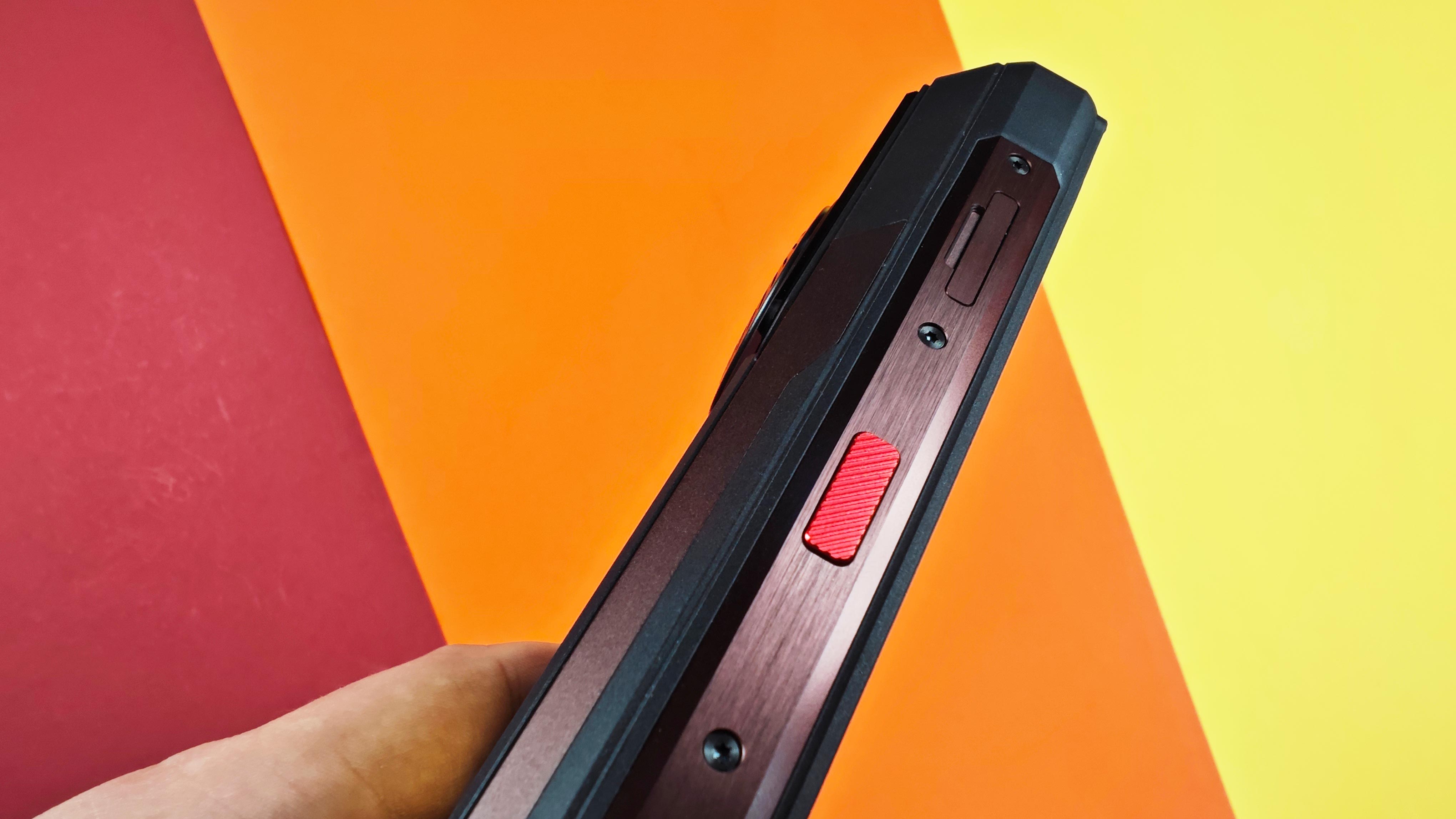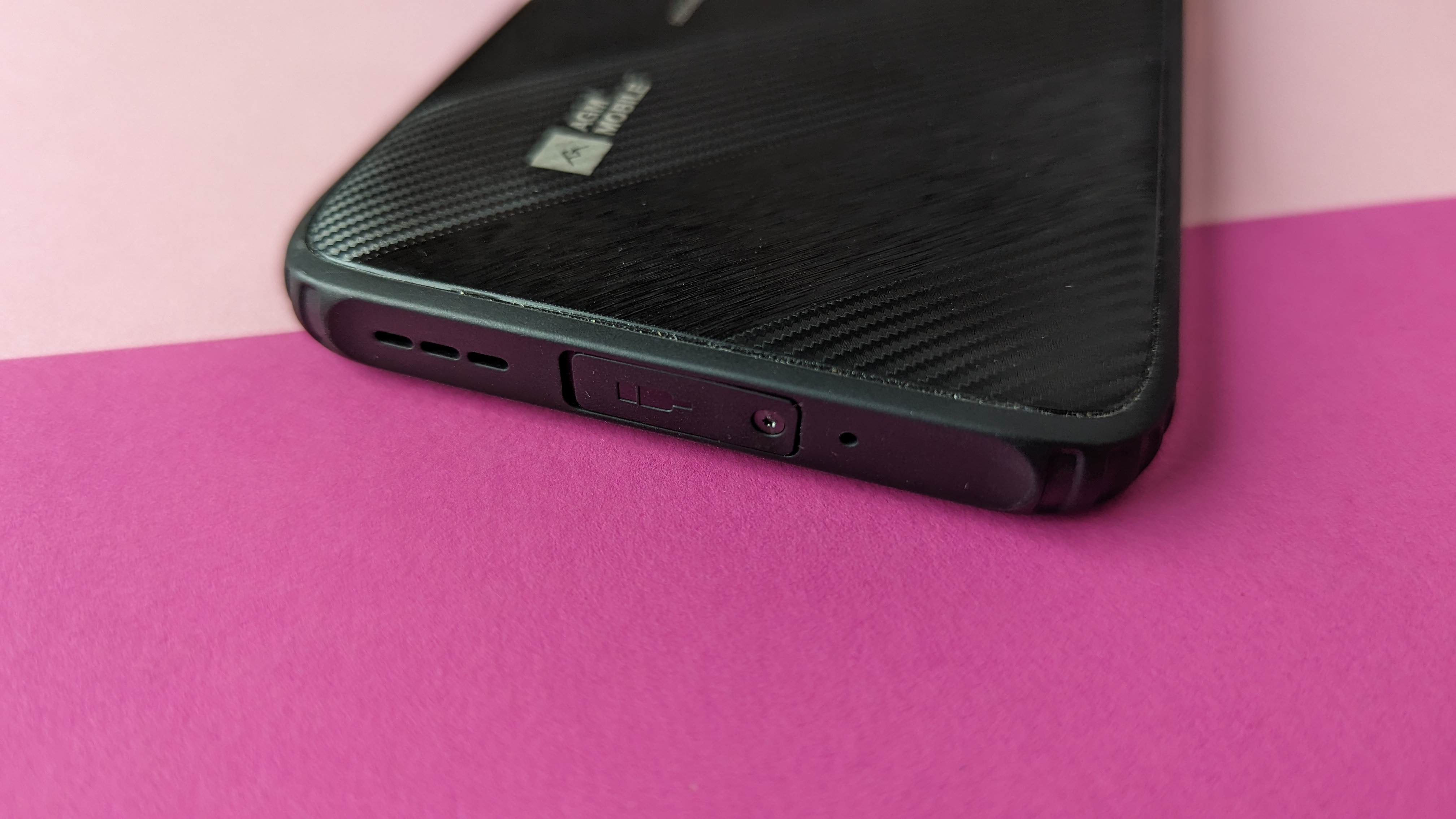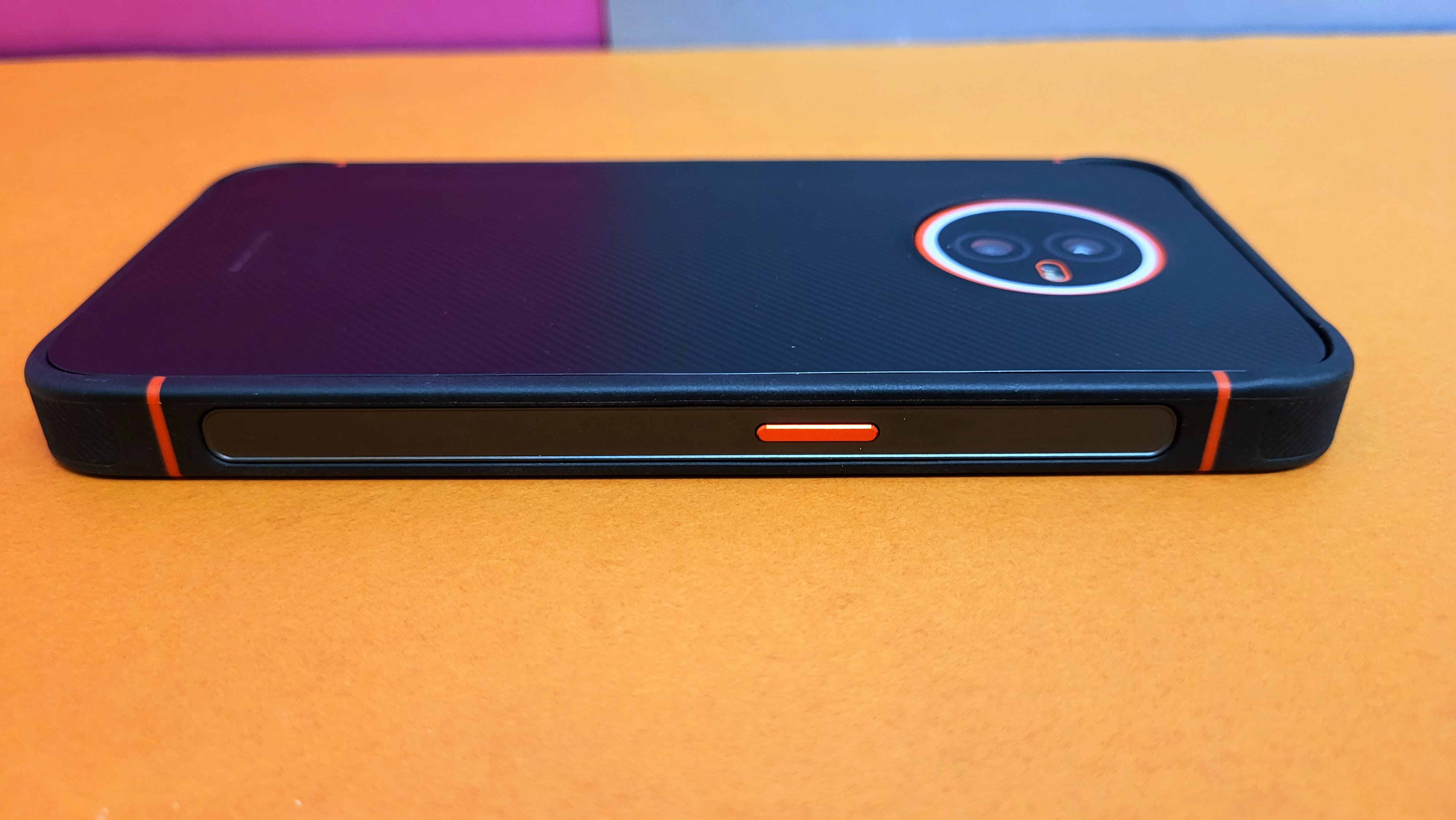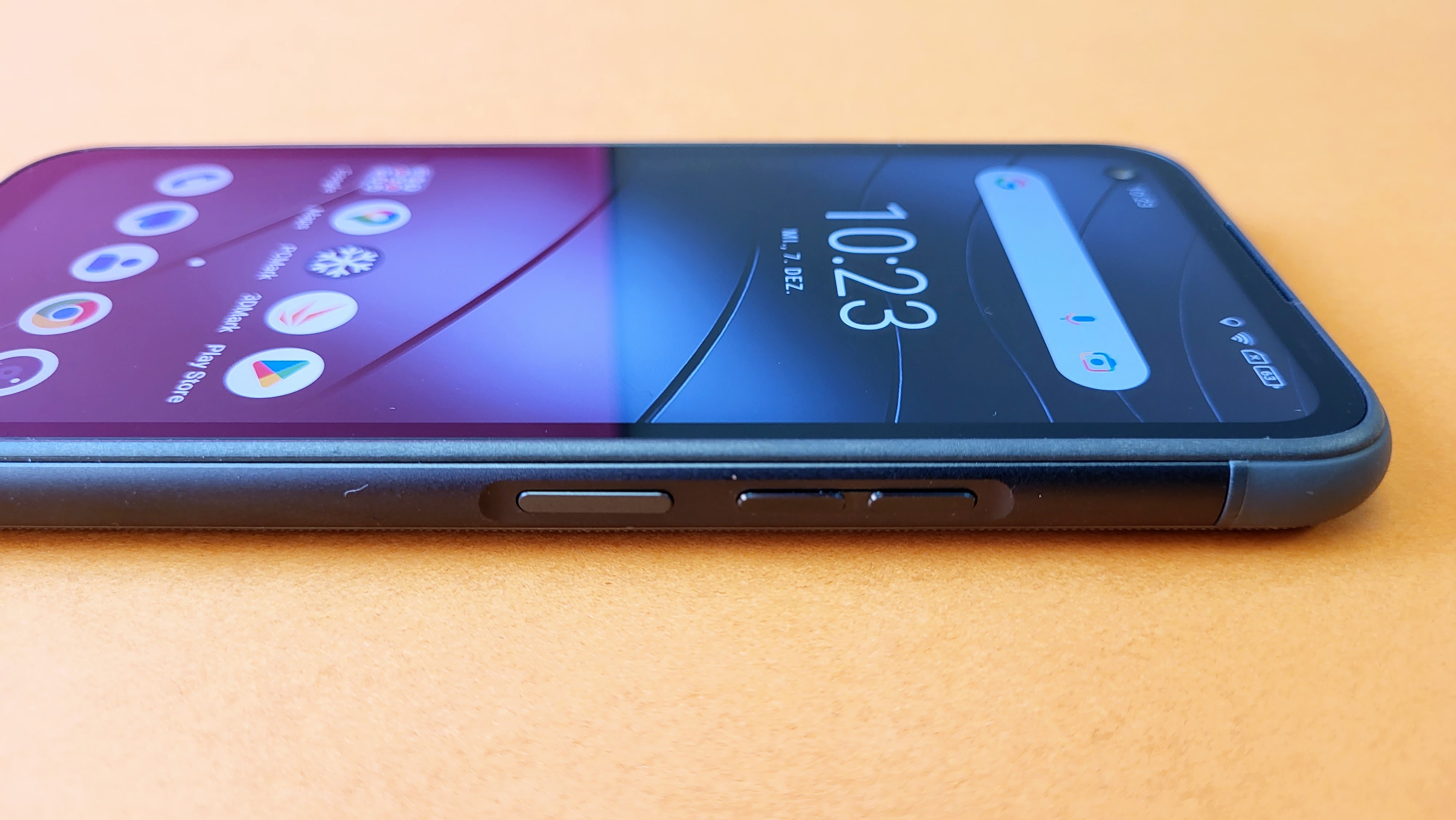 In der Power-Taste befindet sich ein Fingerabdruckscanner. Gegenüber liegt eine rot markierte Taste, die Nutzer mit Funktionen belegen können. Für unseren Geschmack wirken die Tasten eine Spur zu wackelig. Der USB-C-Anschluss auf der Unterseite ist zusätzlich mit einer Gummilasche bedeckt.