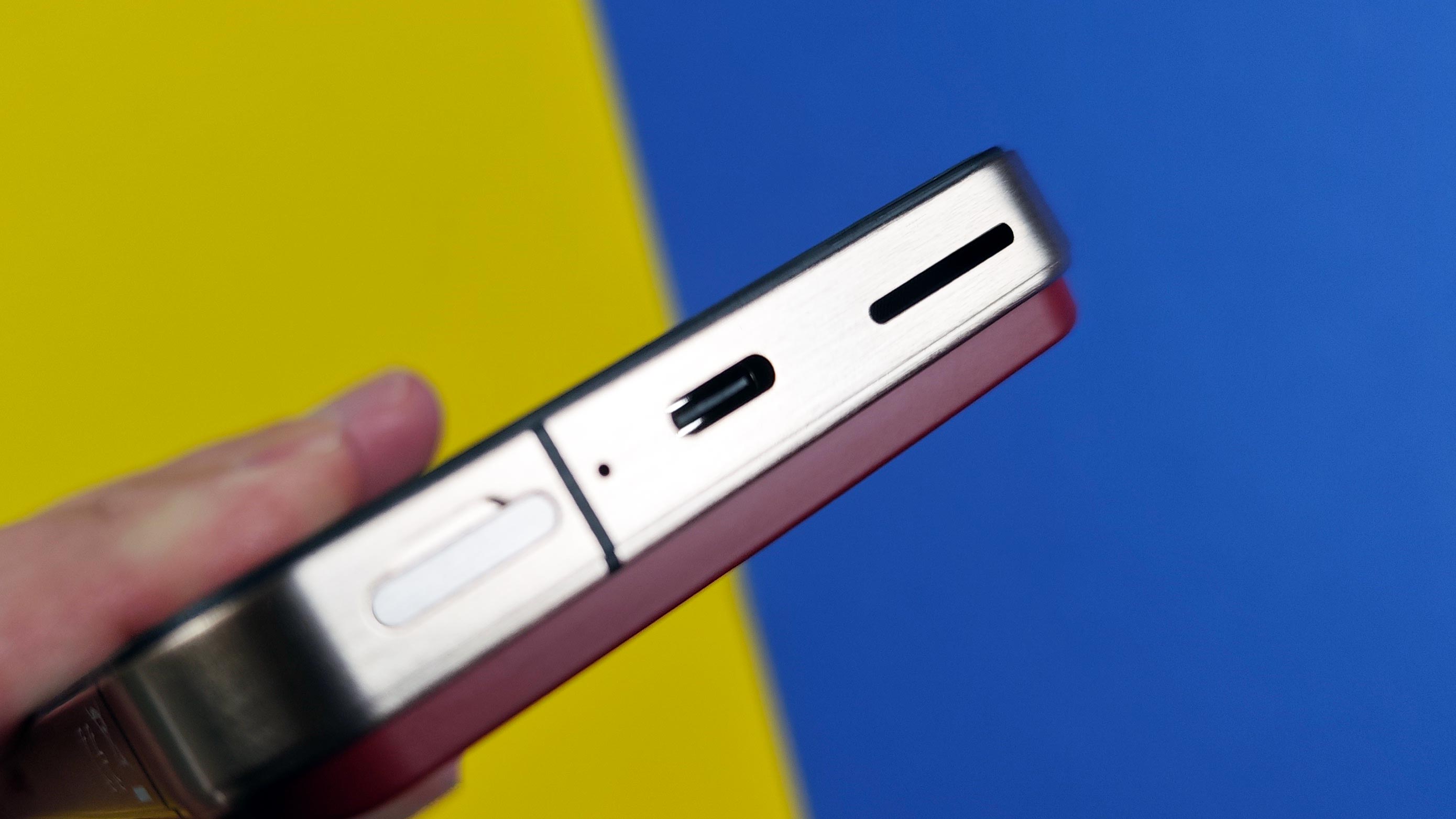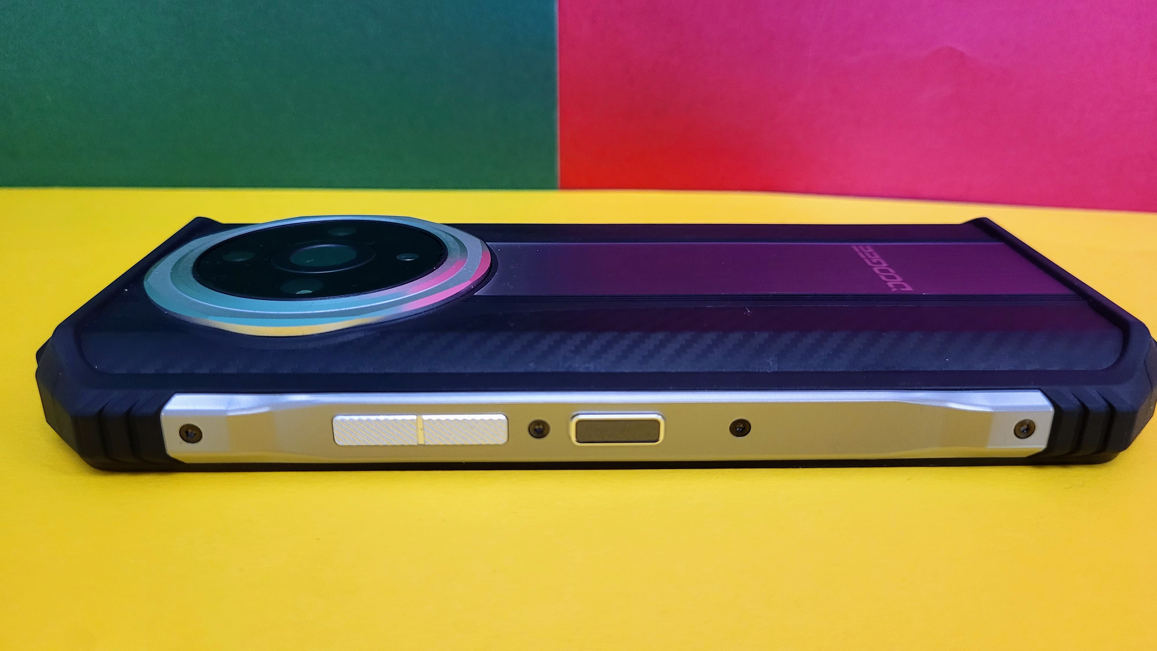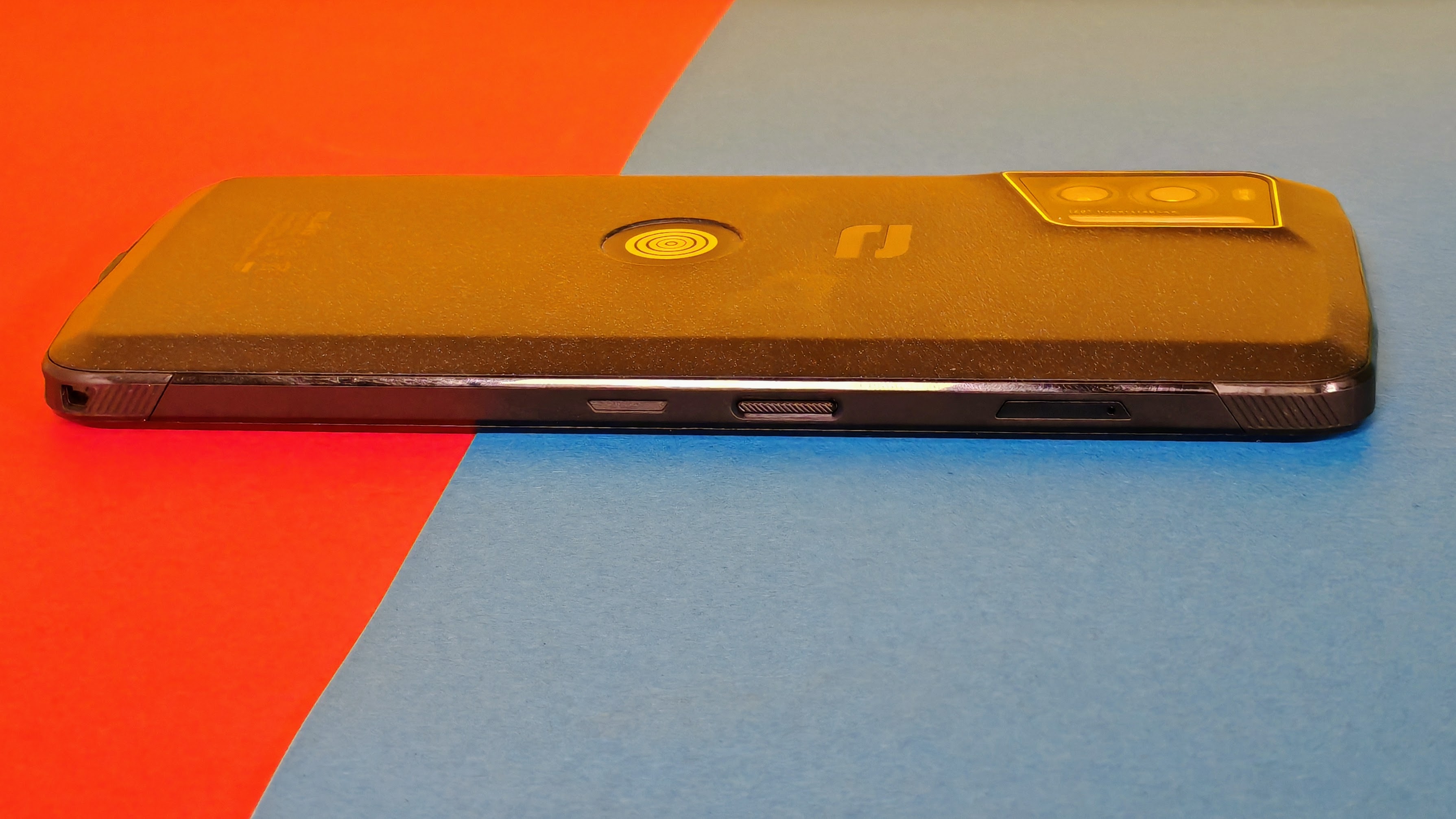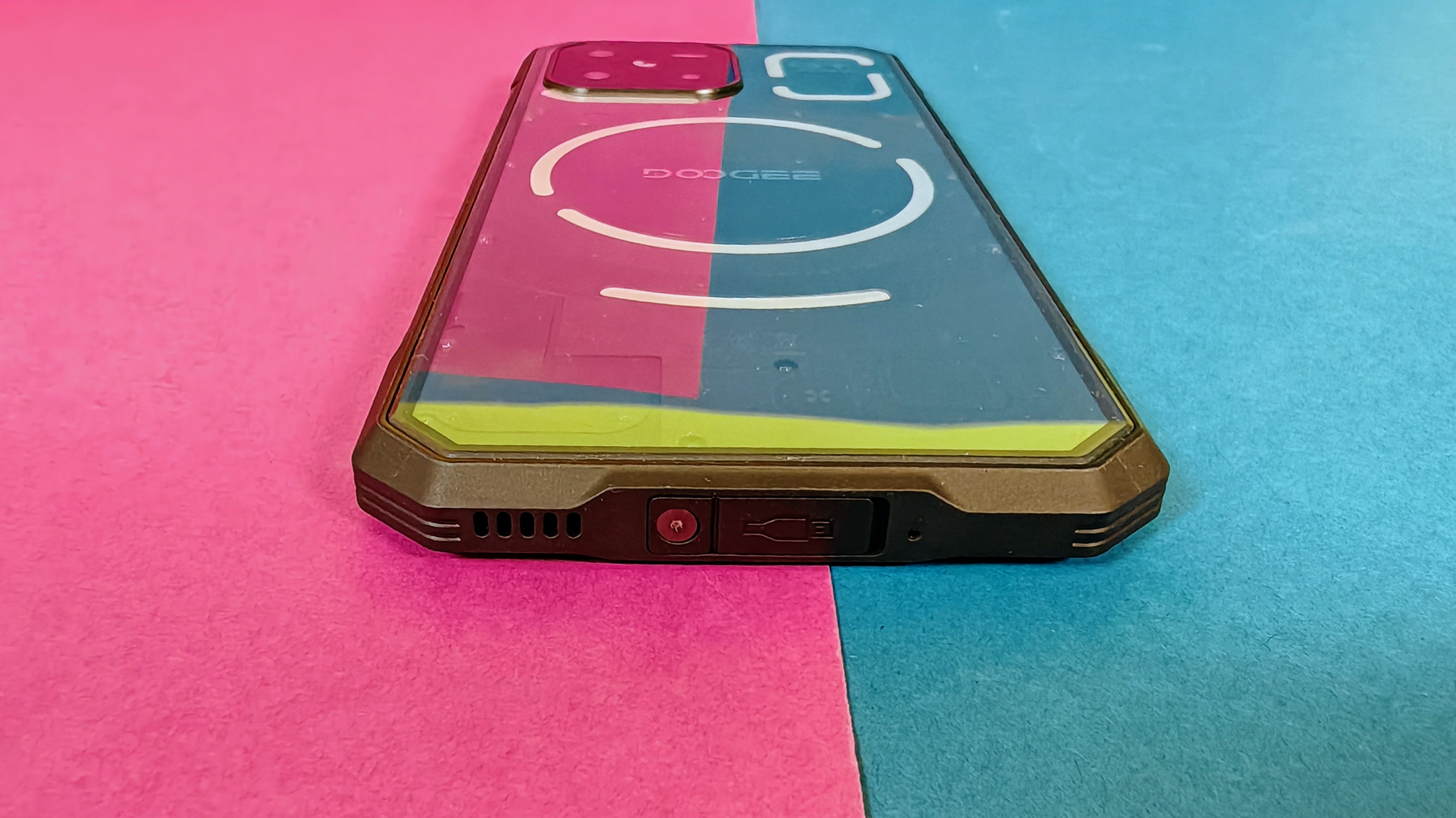 In der Power-Taste befindet sich ein Fingerabdruckscanner. Gegenüber liegt eine rot markierte Taste, die Nutzer mit Funktionen belegen können. Für unseren Geschmack wirken die Tasten eine Spur zu wackelig. Der USB-C-Anschluss auf der Unterseite ist zusätzlich mit einer Gummilasche bedeckt.