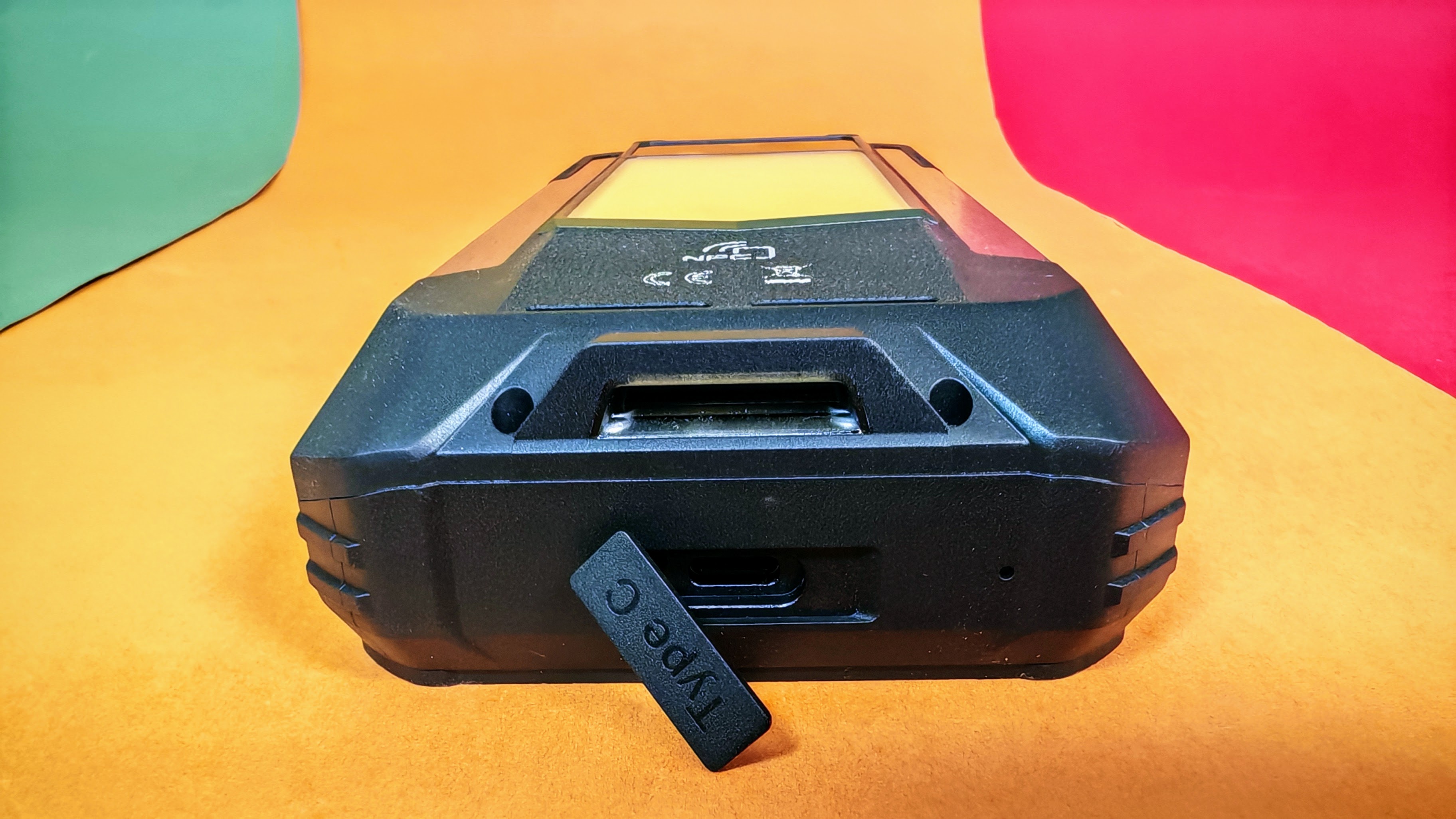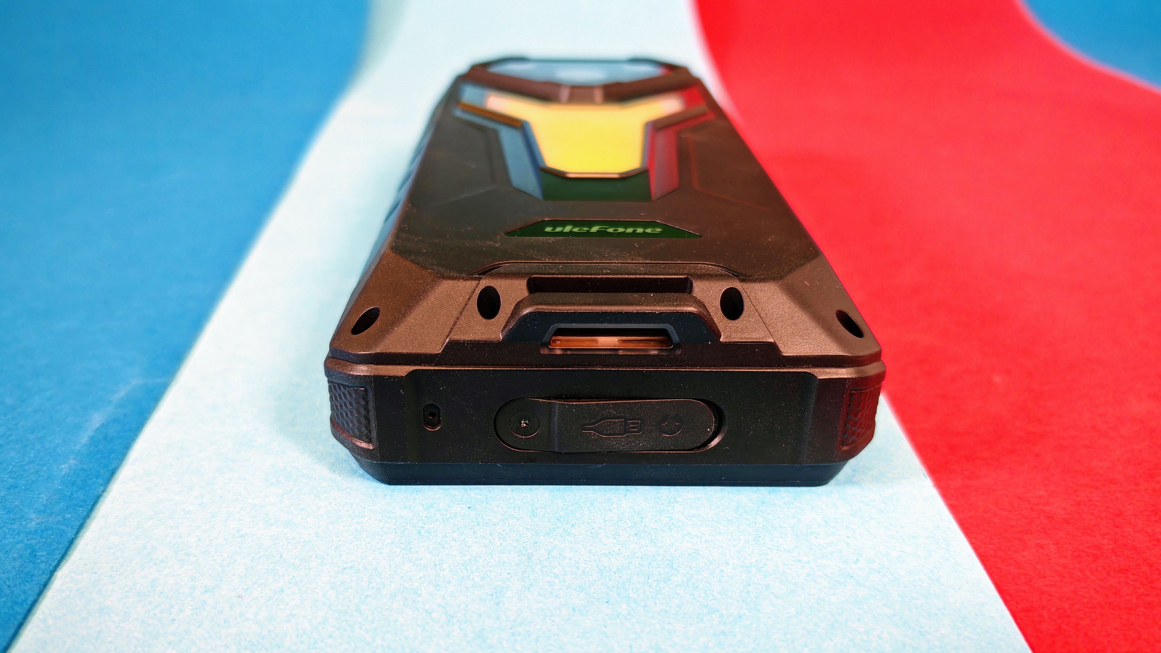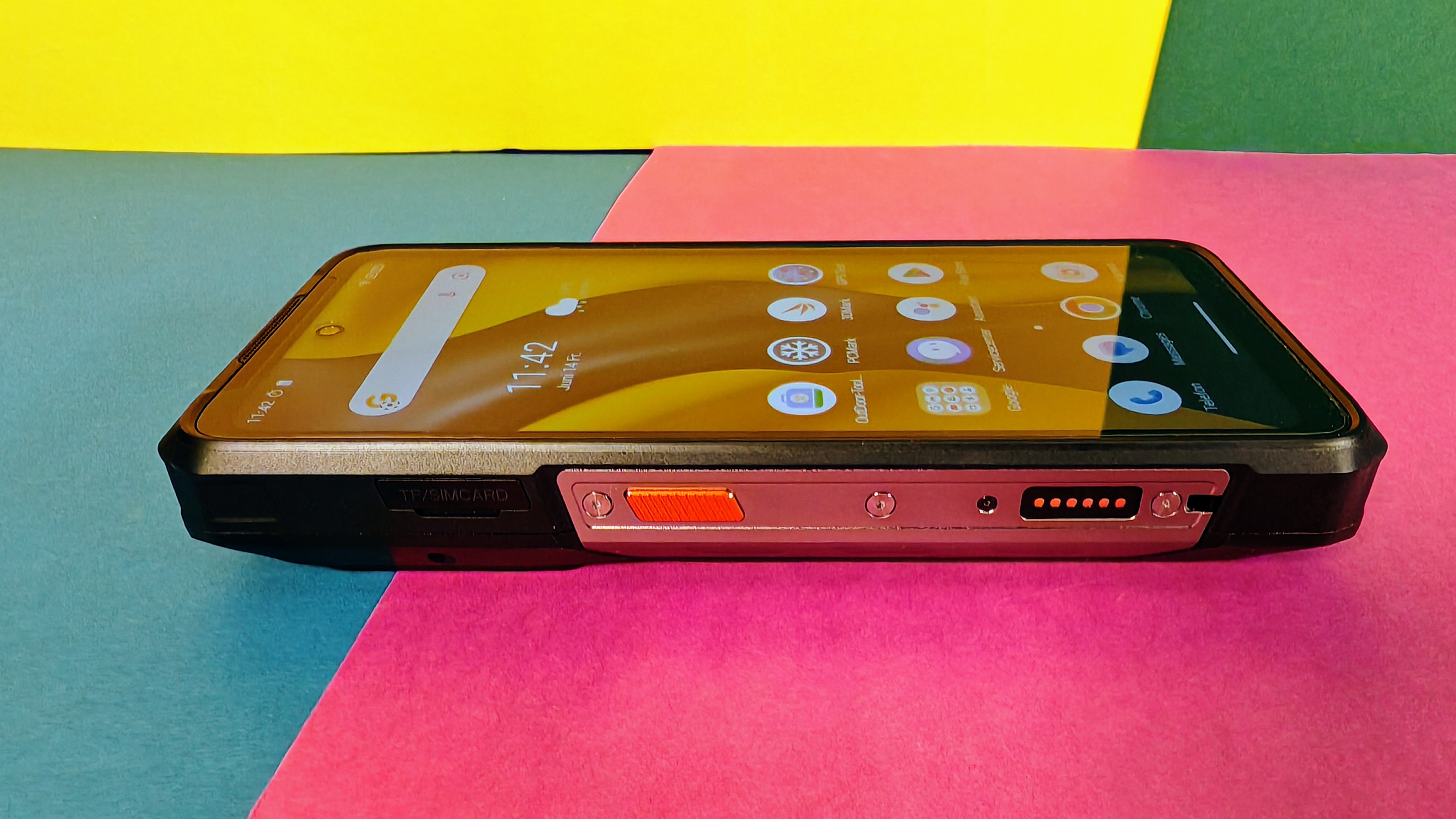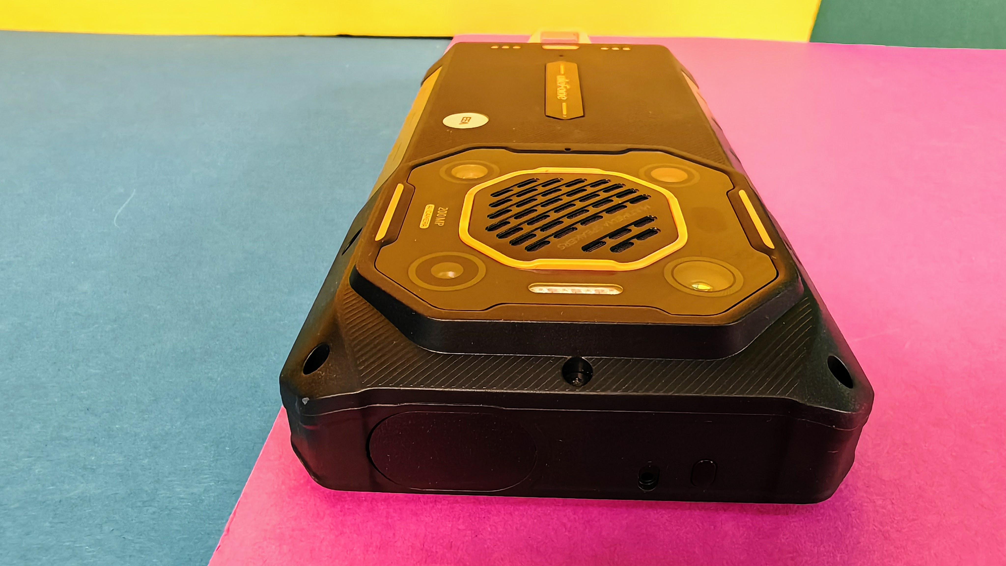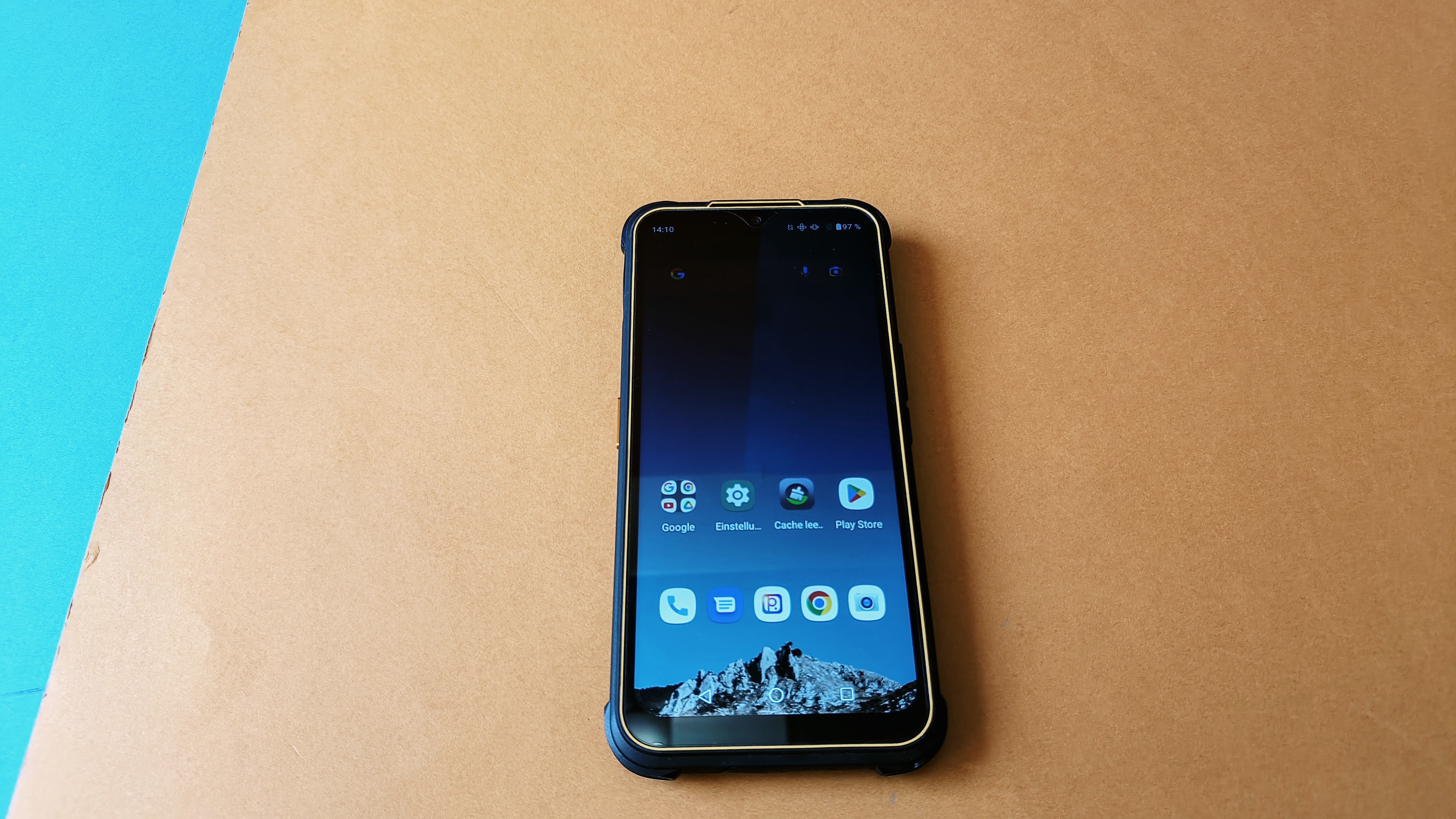 Mit 133,5 × 63,3 × 24,9 mm ist es in nahezu so groß wie ein iPhone 13 Mini – allerdings mehr als dreimal so dick. Um den starken Akku zu beherbergen, war es nötig, das Gerät zwei Finger dick zu gestalten. Typisch für ein Ulefone: Rechts befinden sich Power-Button mit Fingerabdruckleser und zwei runde Buttons für die Lautstärke, links sitzt der orangefarbene, programmierbare Knopf. Oben gibt es einen 3,5-mm-Klinkenanschluss und unten einen USB-C-Port. Beide Öffnungen sind mit einer Gummilasche geschützt. Alles andere als Mini ist das Gewicht von rund 300 g – doppelt so viel wie beim iPhone 13 Mini. Für ein Outdoor-Smartphone ist das aber schon wieder leicht.