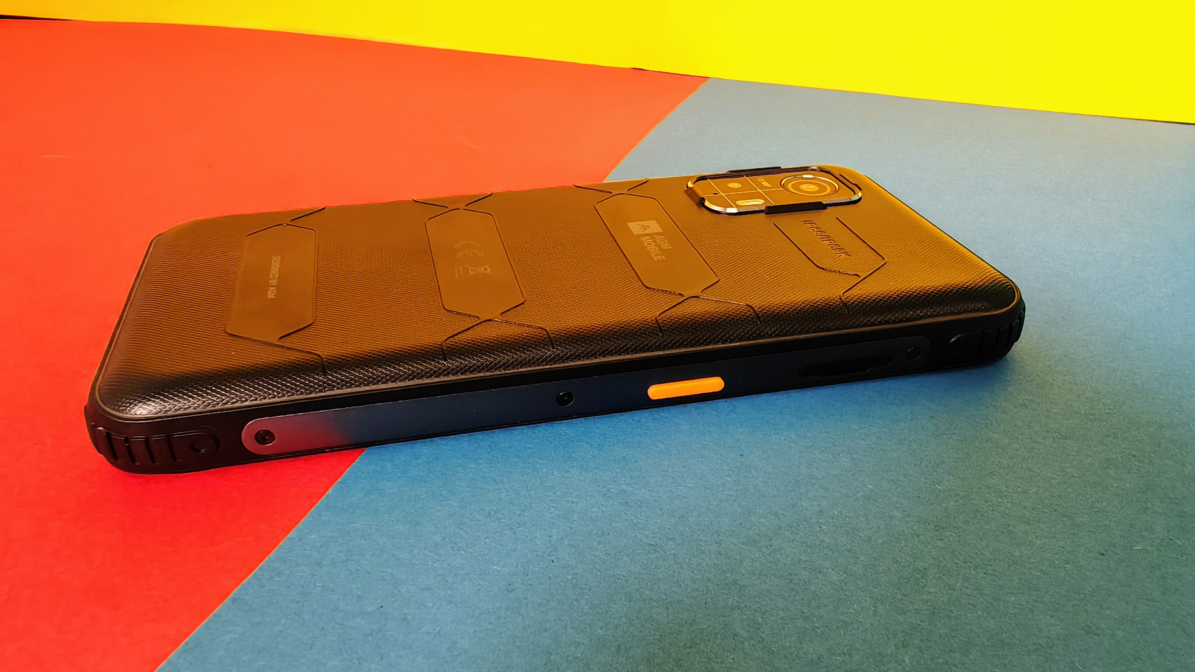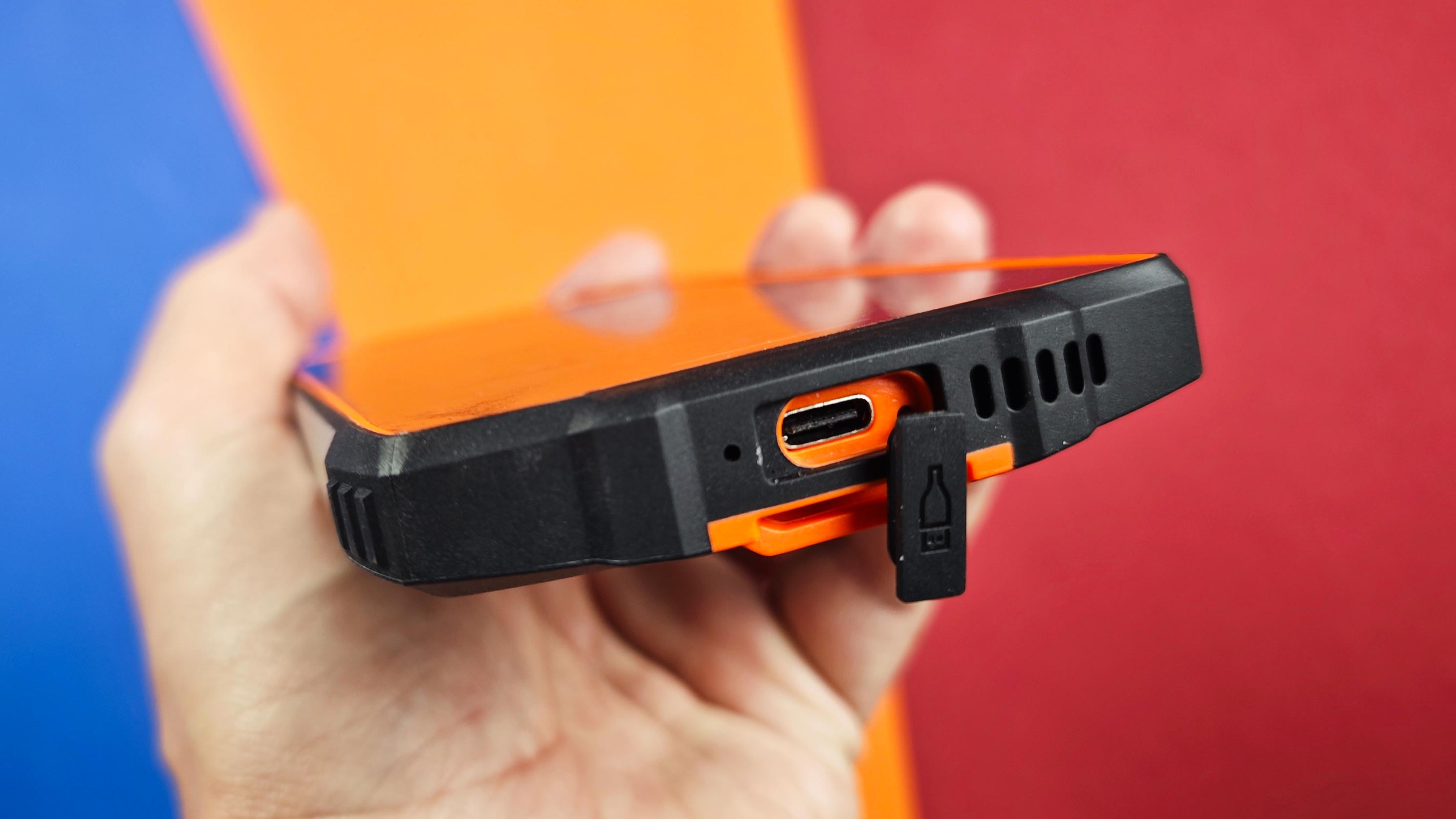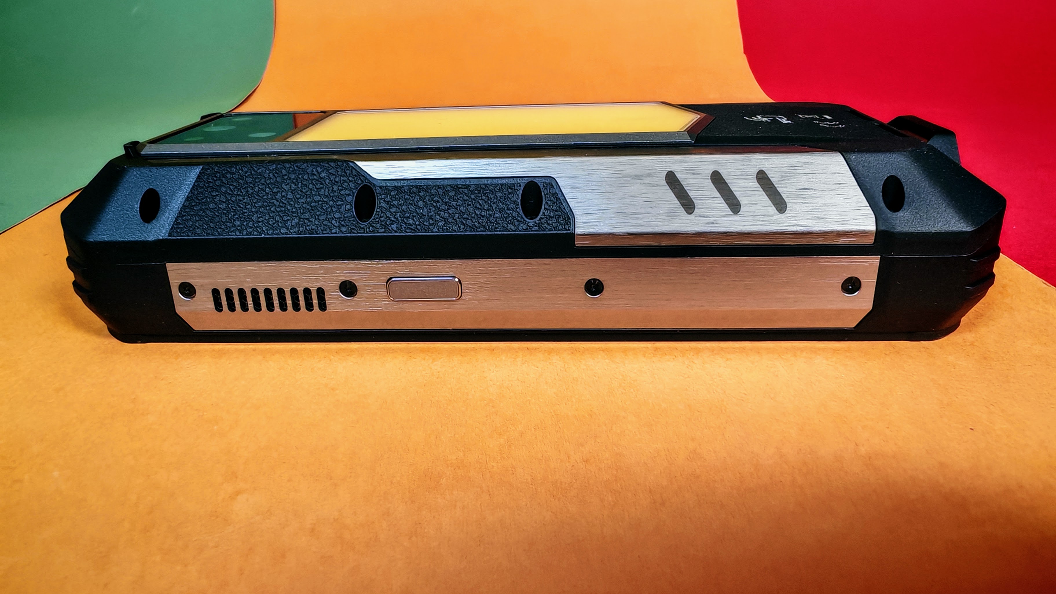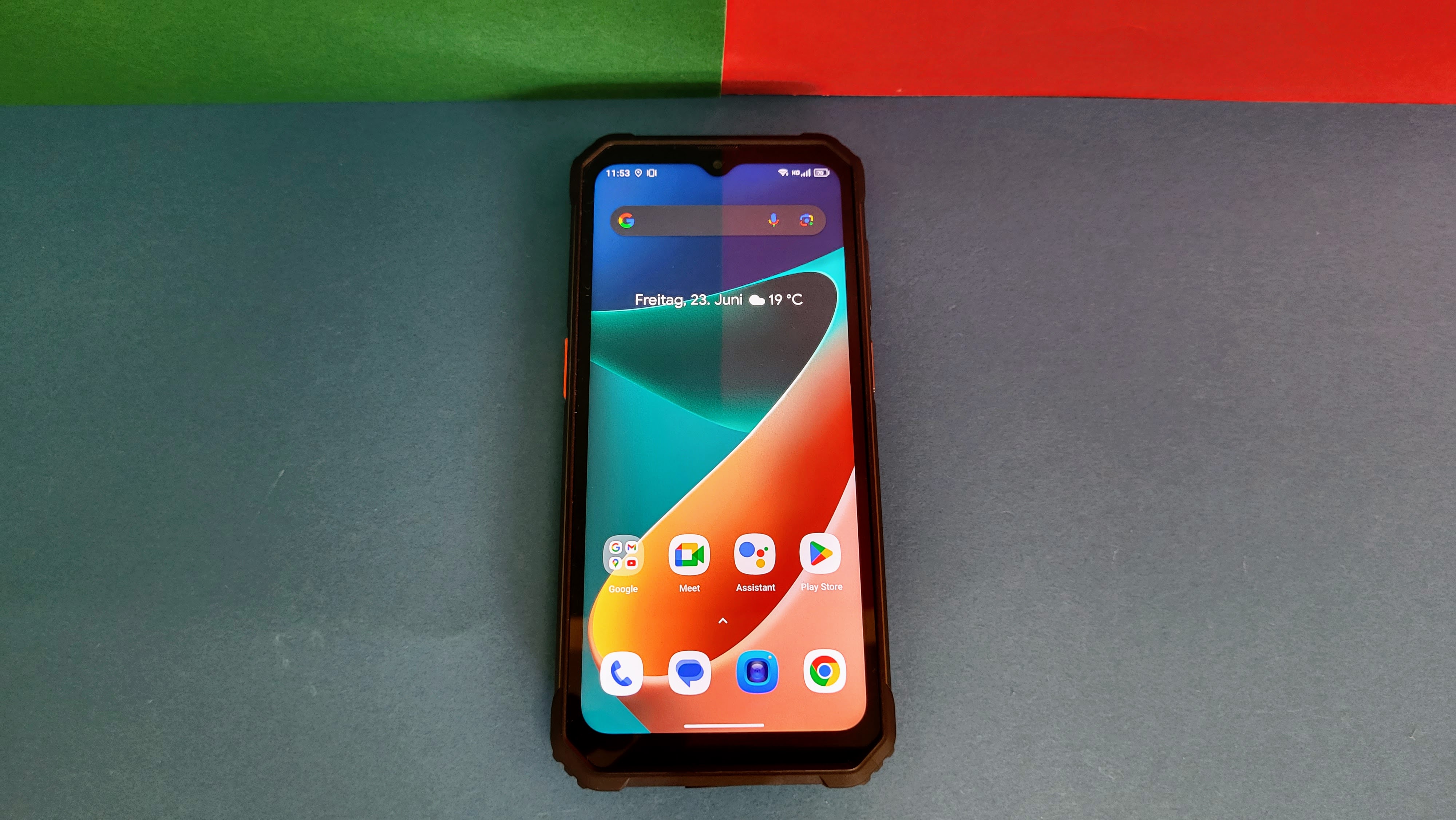 Mit 133,5 × 63,3 × 24,9 mm ist es in nahezu so groß wie ein iPhone 13 Mini – allerdings mehr als dreimal so dick. Um den starken Akku zu beherbergen, war es nötig, das Gerät zwei Finger dick zu gestalten. Typisch für ein Ulefone: Rechts befinden sich Power-Button mit Fingerabdruckleser und zwei runde Buttons für die Lautstärke, links sitzt der orangefarbene, programmierbare Knopf. Oben gibt es einen 3,5-mm-Klinkenanschluss und unten einen USB-C-Port. Beide Öffnungen sind mit einer Gummilasche geschützt. Alles andere als Mini ist das Gewicht von rund 300 g – doppelt so viel wie beim iPhone 13 Mini. Für ein Outdoor-Smartphone ist das aber schon wieder leicht.