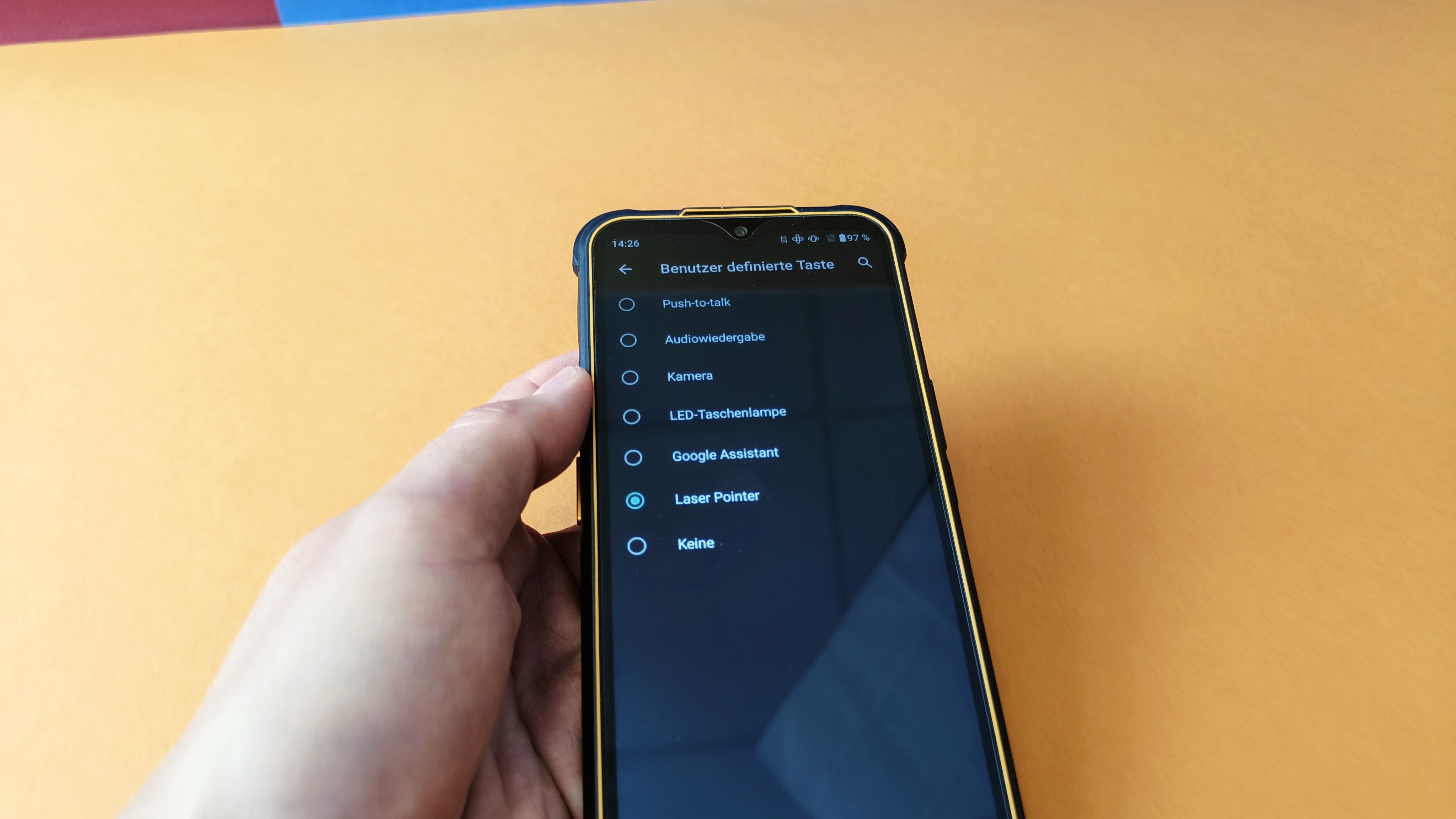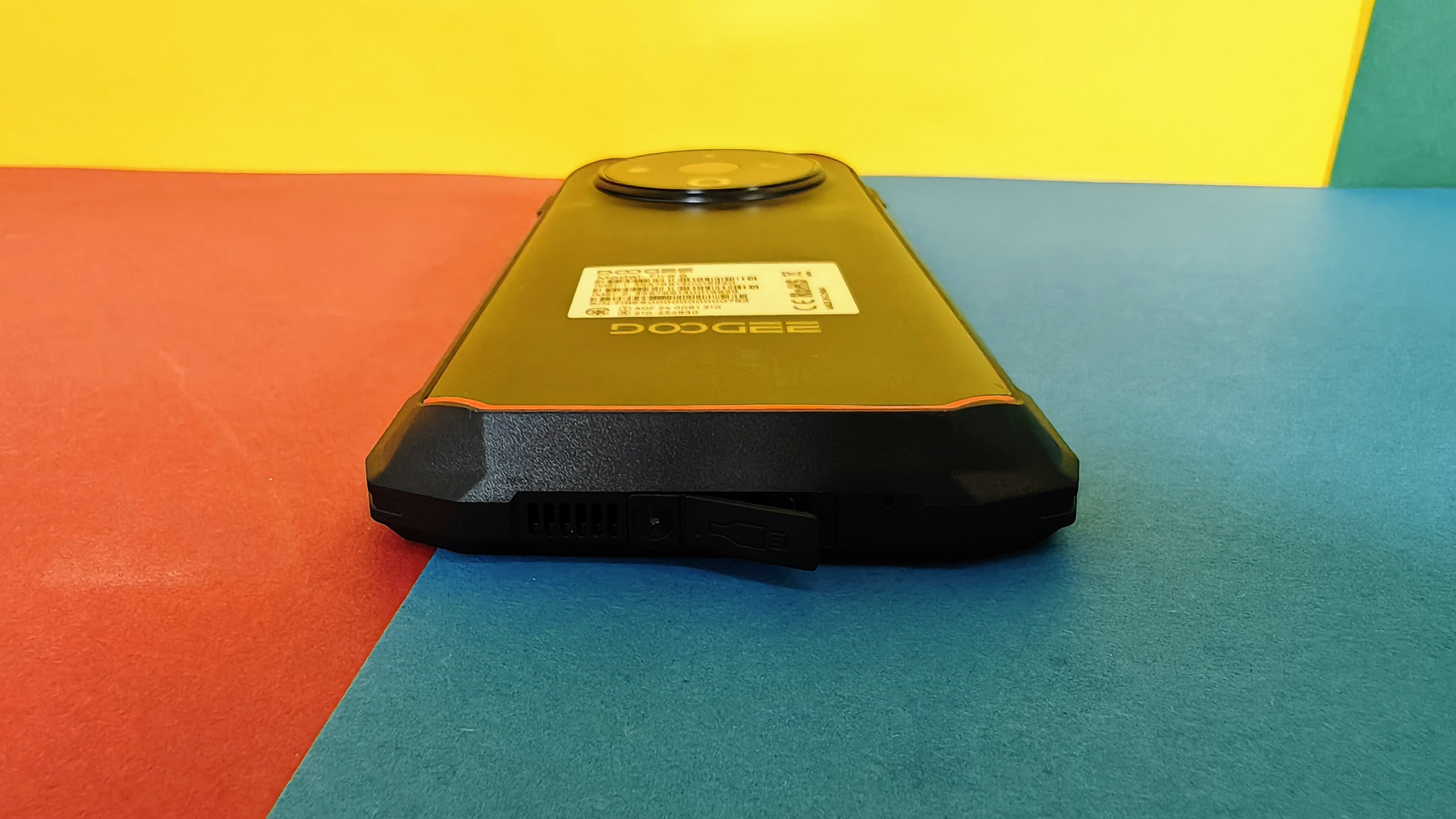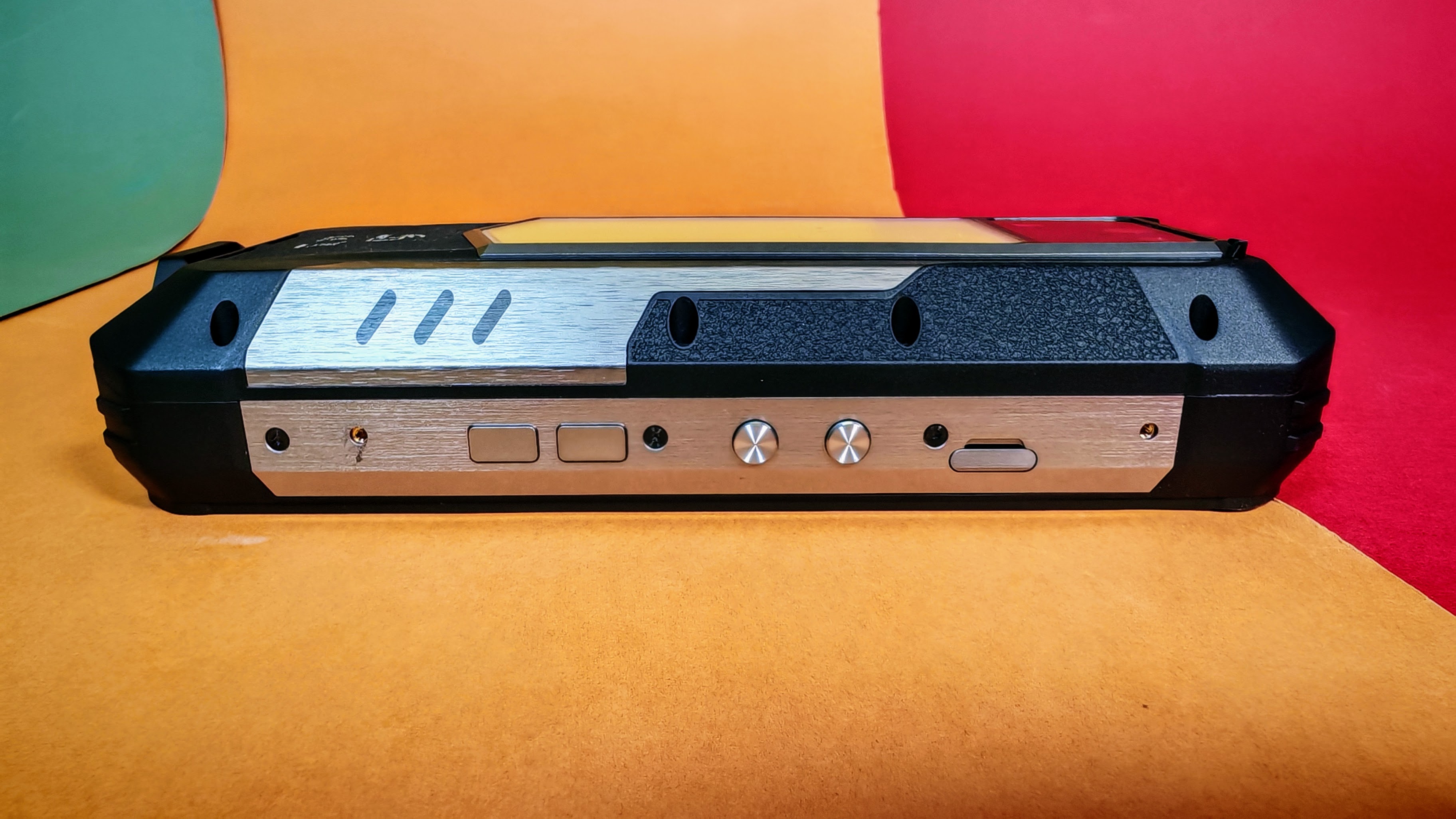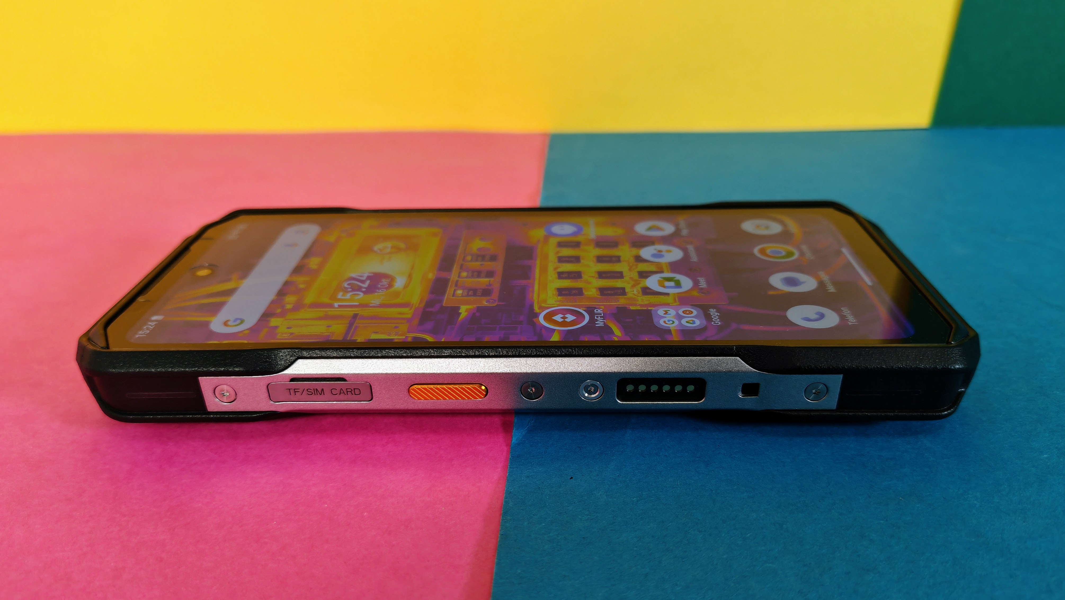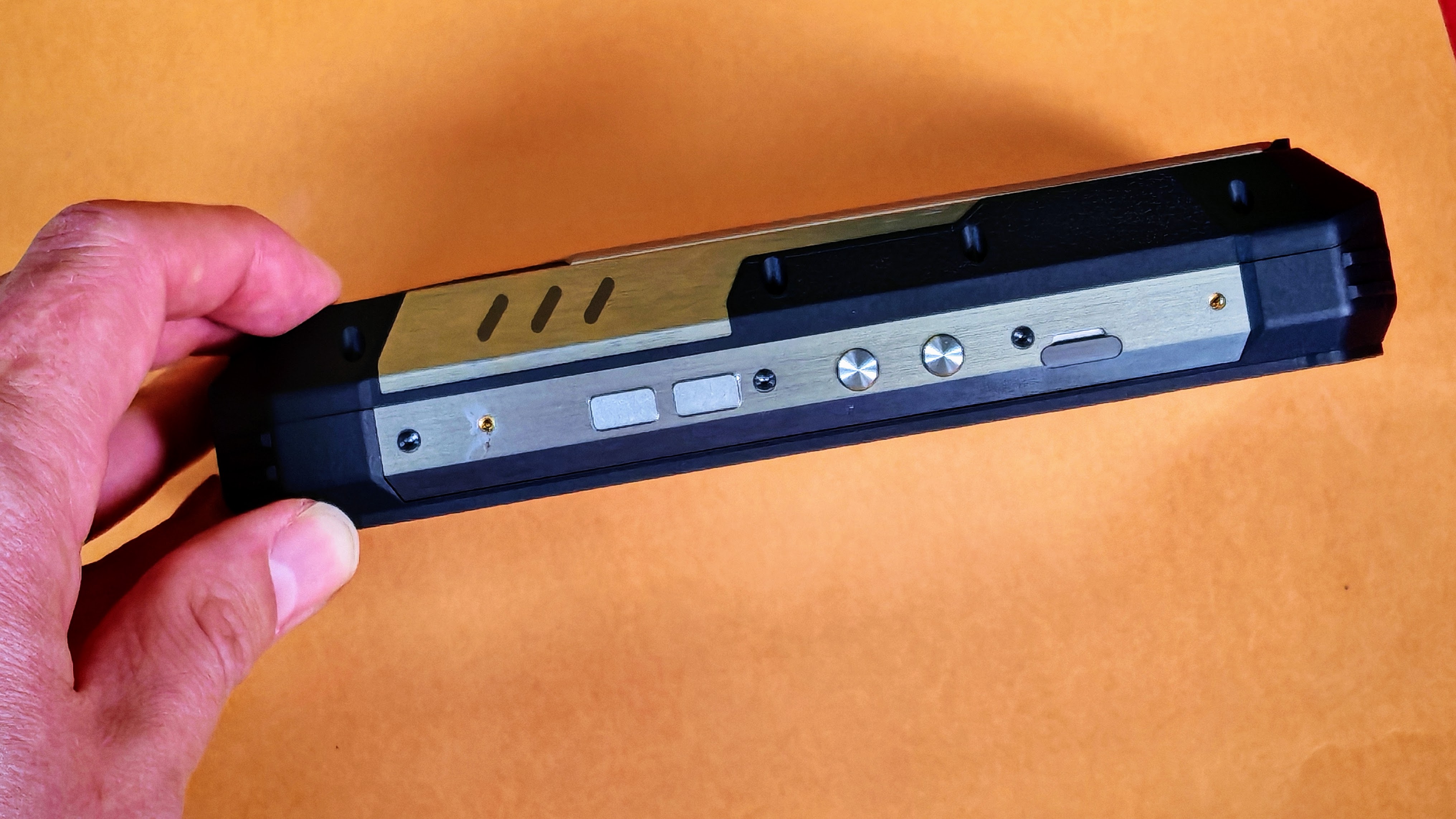Mit 133,5 × 63,3 × 24,9 mm ist es in nahezu so groß wie ein iPhone 13 Mini – allerdings mehr als dreimal so dick. Um den starken Akku zu beherbergen, war es nötig, das Gerät zwei Finger dick zu gestalten. Typisch für ein Ulefone: Rechts befinden sich Power-Button mit Fingerabdruckleser und zwei runde Buttons für die Lautstärke, links sitzt der orangefarbene, programmierbare Knopf. Oben gibt es einen 3,5-mm-Klinkenanschluss und unten einen USB-C-Port. Beide Öffnungen sind mit einer Gummilasche geschützt. Alles andere als Mini ist das Gewicht von rund 300 g – doppelt so viel wie beim iPhone 13 Mini. Für ein Outdoor-Smartphone ist das aber schon wieder leicht.