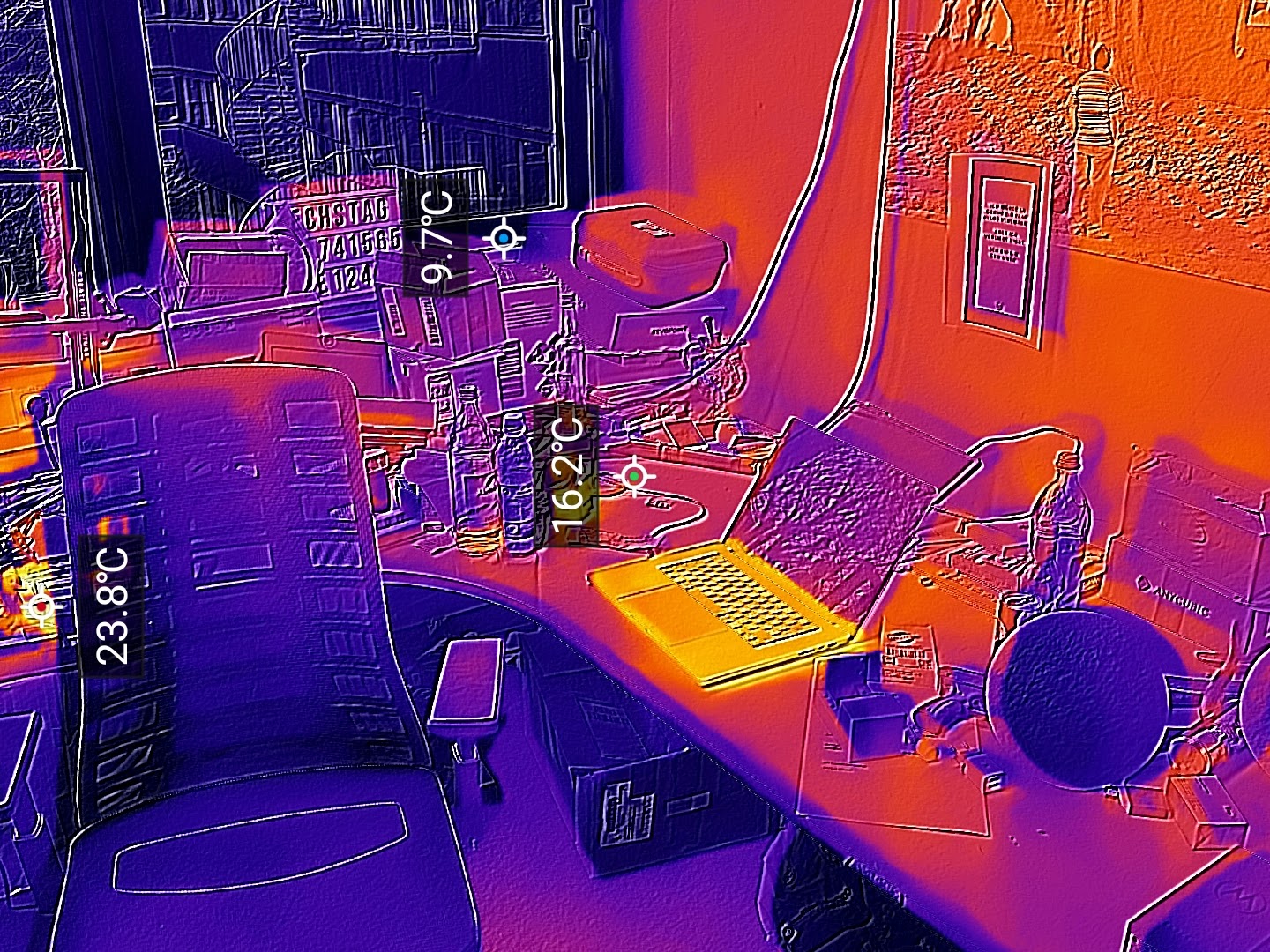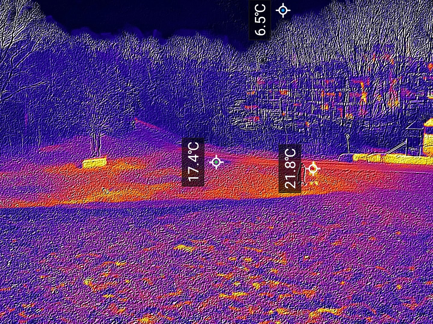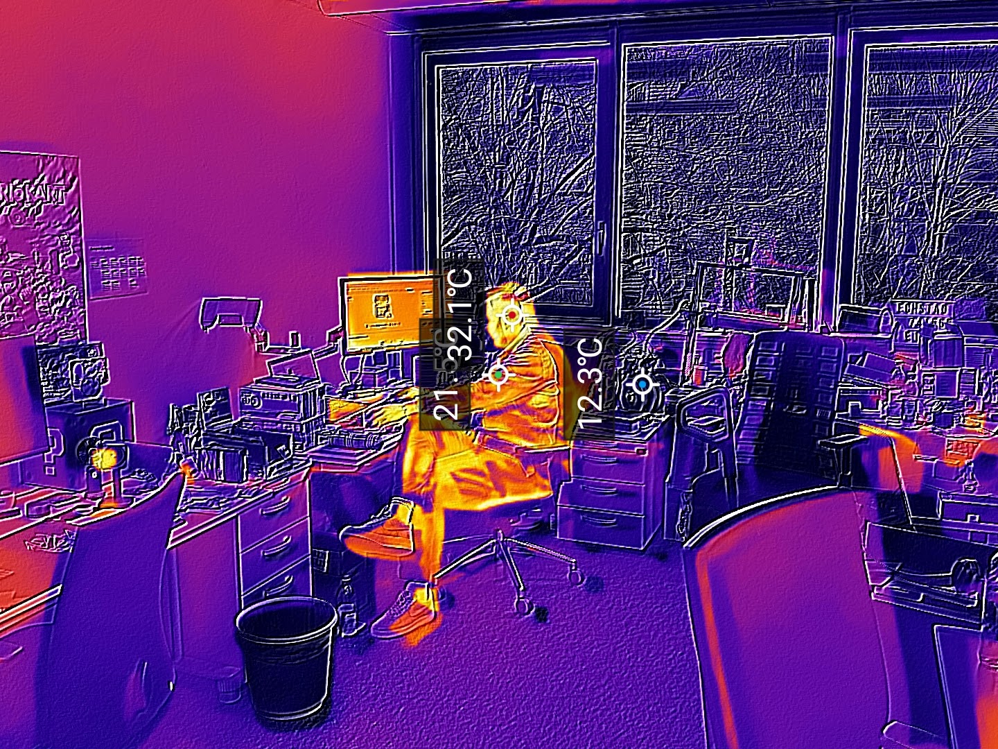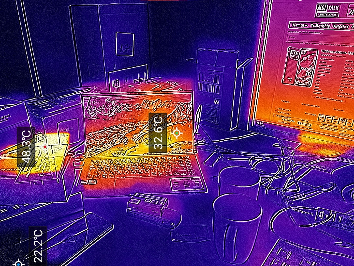 Ein weiterer Höhepunkt ist die Wärmebildkamera: Das Thermovue T2 System bietet eine hohe Auflösung von 640 × 512 Pixeln und misst Temperaturen im Bereich von -20 bis 550 Grad Celsius. Im Vergleich zu anderen Outdoor-Smartphones oder einem Adapter zum Aufstecken (Bestenliste), die in unseren Tests weniger detaillierte Wärmebilder lieferten, sticht das Ulefone-Modell positiv hervor. Es bietet mehrere Farbpaletten und zeigt die höchsten sowie niedrigsten Temperaturen auf dem Wärmebild an.