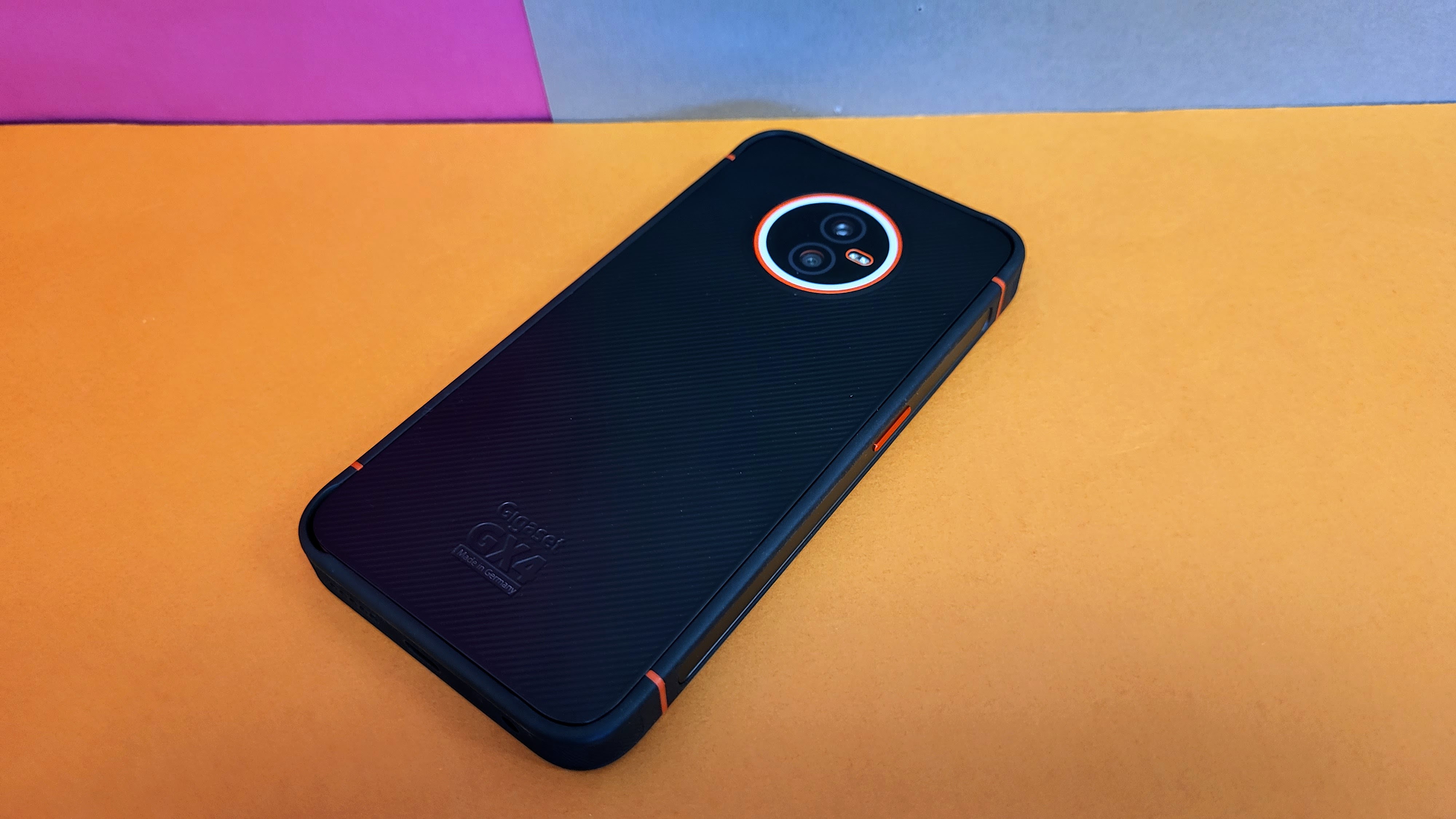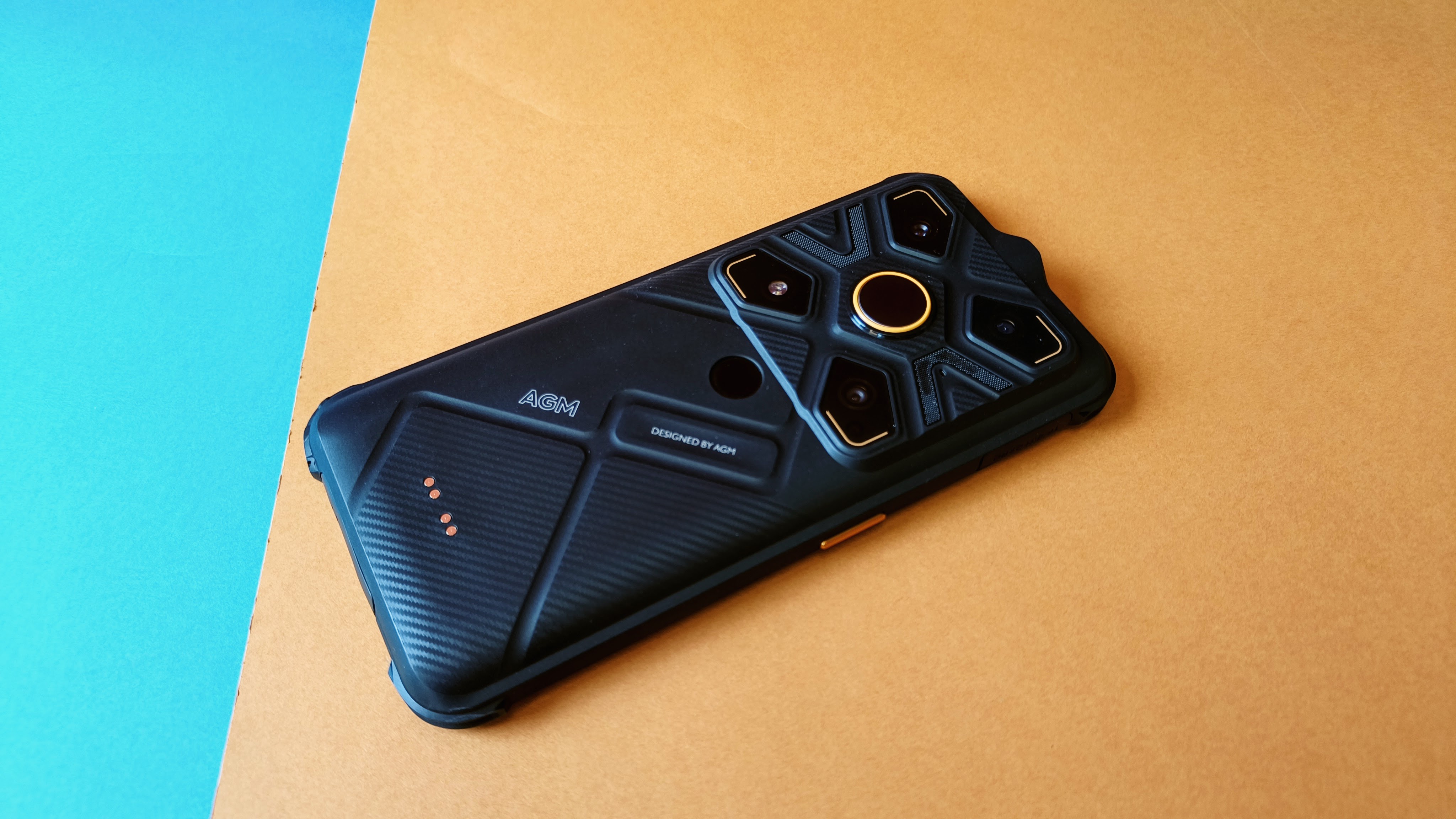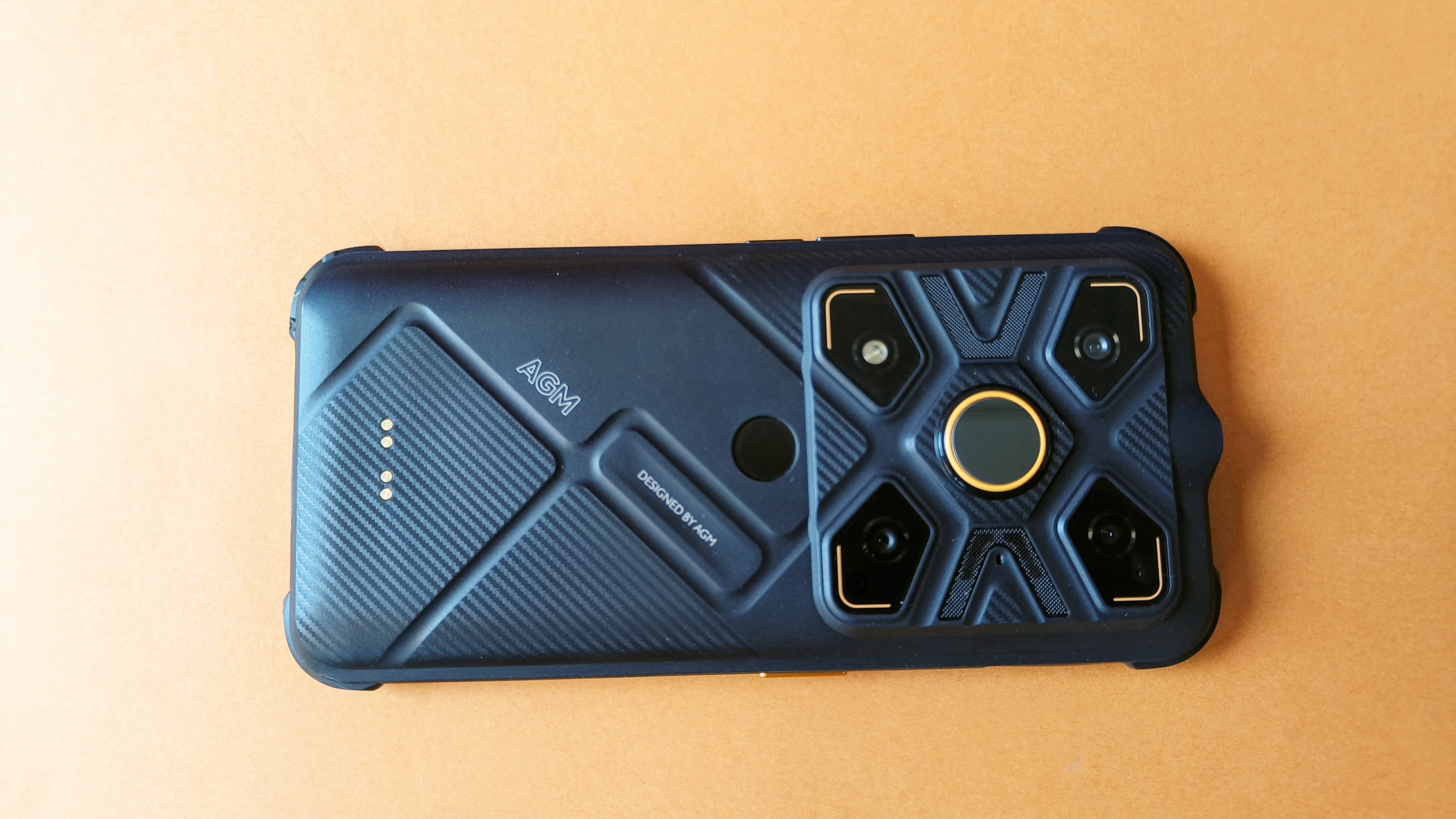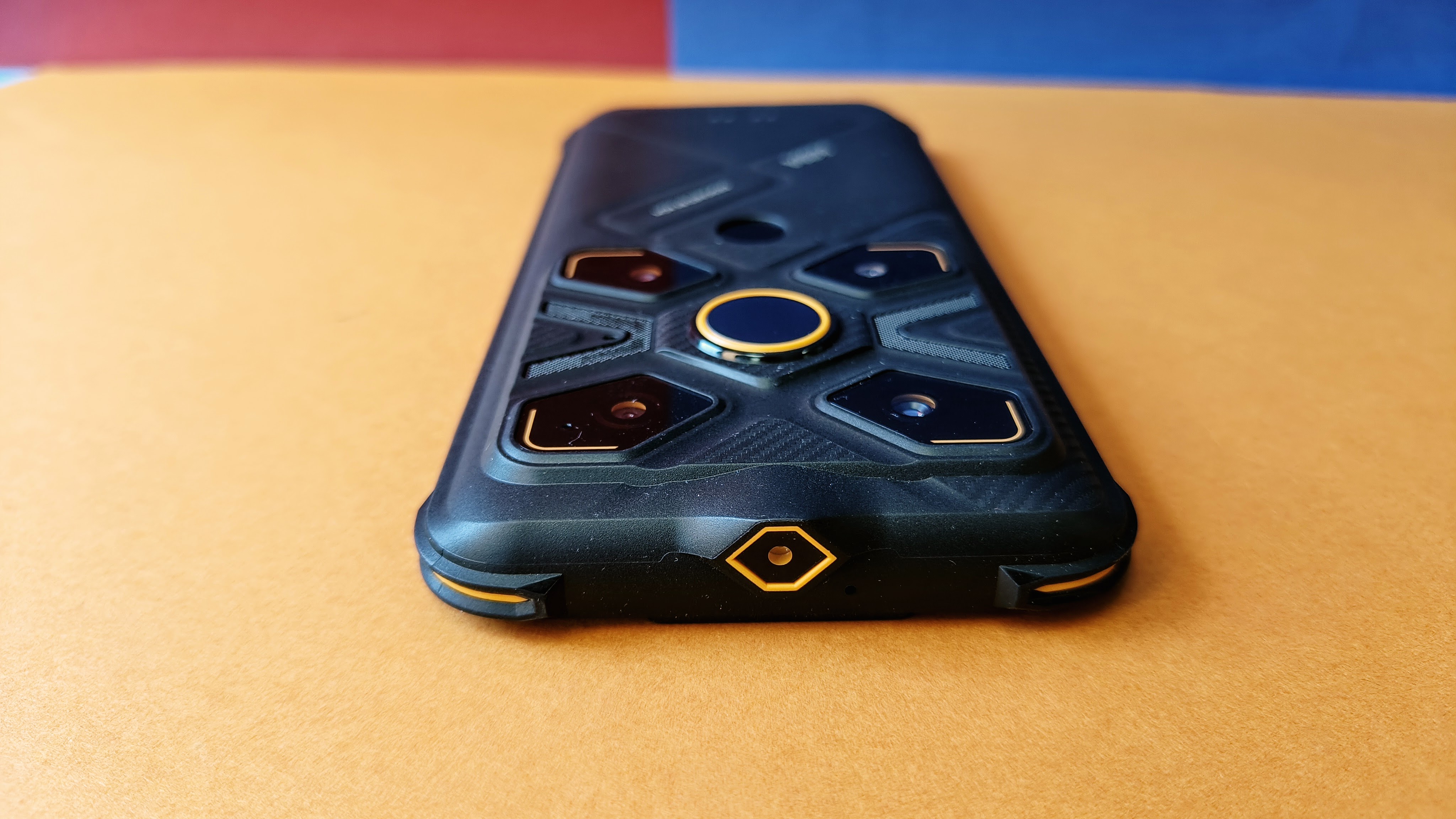Gleich auf den ersten Blick weiß man, dass man hier ein Outdoor-Smartphone vor sich hat. Das kantige, achteckige Gehäuse ist mit Gummi ummantelt und an den Ecken besonders verstärkt. Nur an den Seiten ragt das Metallgehäuse ein wenig hervor. Die Rückseite ist komplett eben gestaltet. Die Kameralinsen befinden sich in einem großen und runden Element.