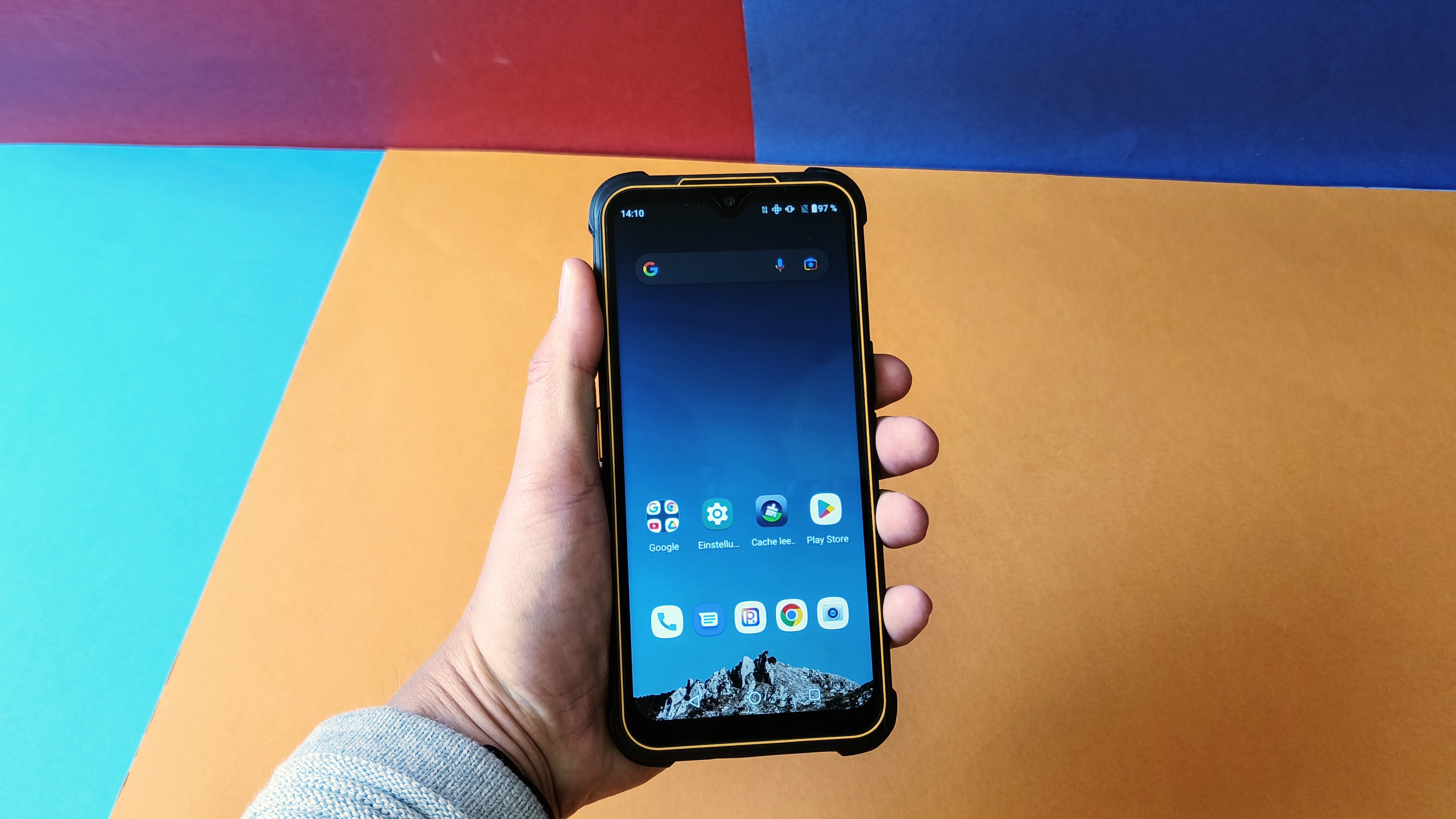 Die kleine Anzeige misst in der Diagonale 4,7 Zoll – da kommt etwas Nostalgie auf. Denn die Zeiten derart kleiner Smartphones scheinen längst vorbei zu sein. Zwar löst es nominell nur in HD mit 1600 × 720 Pixel auf. Doch bei der Größe bietet es dennoch eine sehr hohe Pixeldichte von 373 PPI, bei der Bildpunkte mit dem Auge nicht mehr zu erkennen sind. Apropos Auge: Wer unter Alterssichtigkeit leidet wie der Autor dieses Tests, wird vom Ulefone Armor Mini 20T Pro ganz schön gefordert. Um das Display gut abzulesen, benötigt man schon eine Lesebrille.