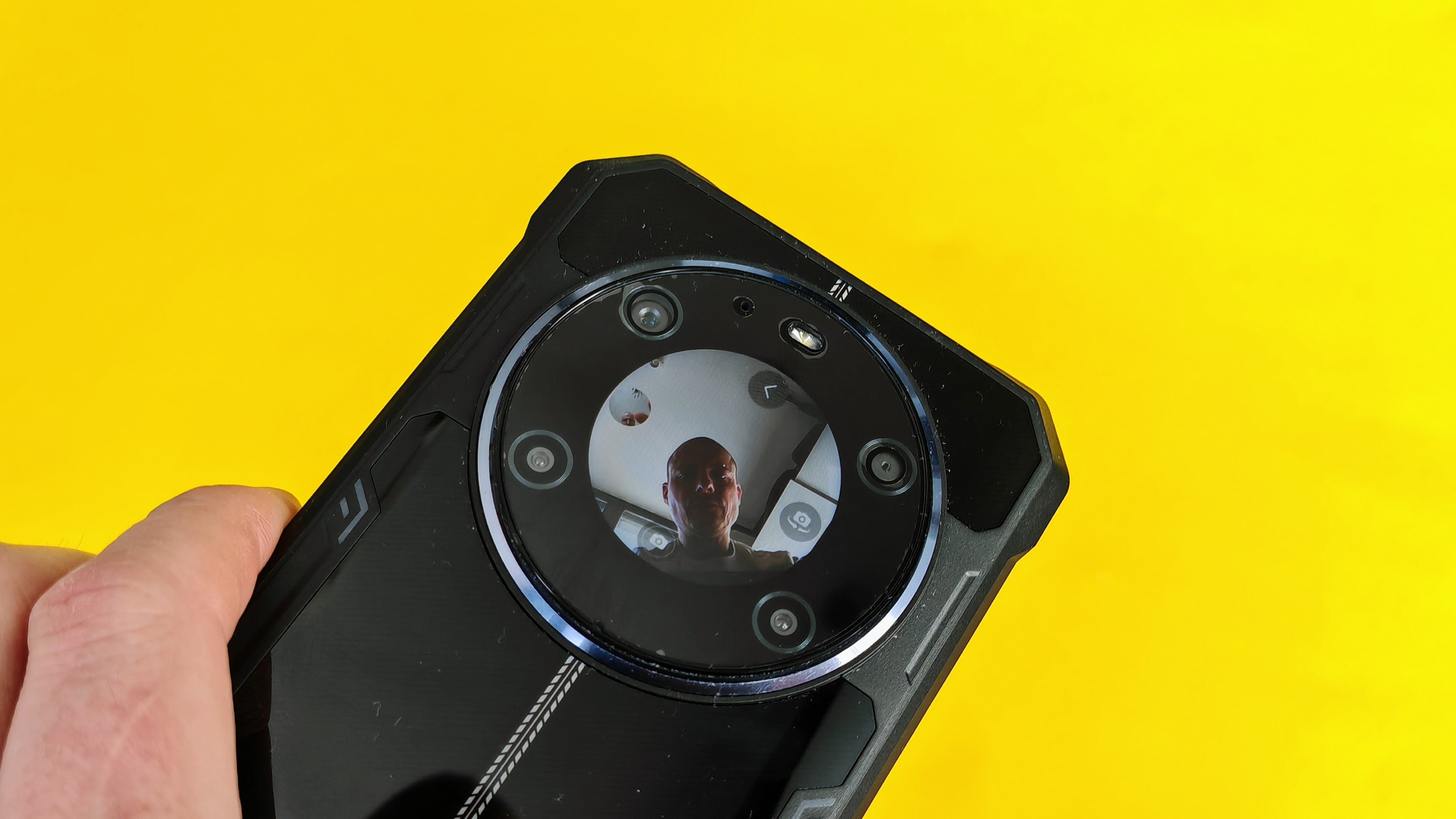 Optisch wirkt das Oukitel WP200 Pro weniger martialisch als viele andere Outdoor-Smartphones. Auffälligstes Designelement ist das große, runde Kamera-Modul auf der Rückseite, das etwa 7 mm hervorsteht und entfernt an ein chinesisches Flaggschiff-Modell von Xiaomi erinnert. In der Mitte befindet sich ein zweites Display – hierzu später mehr. Der kantige Rahmen besteht aus Aluminium, während die geriffelte Rückseite aus Kunststoff gefertigt ist und guten Grip bietet. Eine gummierte Beschichtung gibt es allerdings nicht, und die Anschlüsse liegen frei.