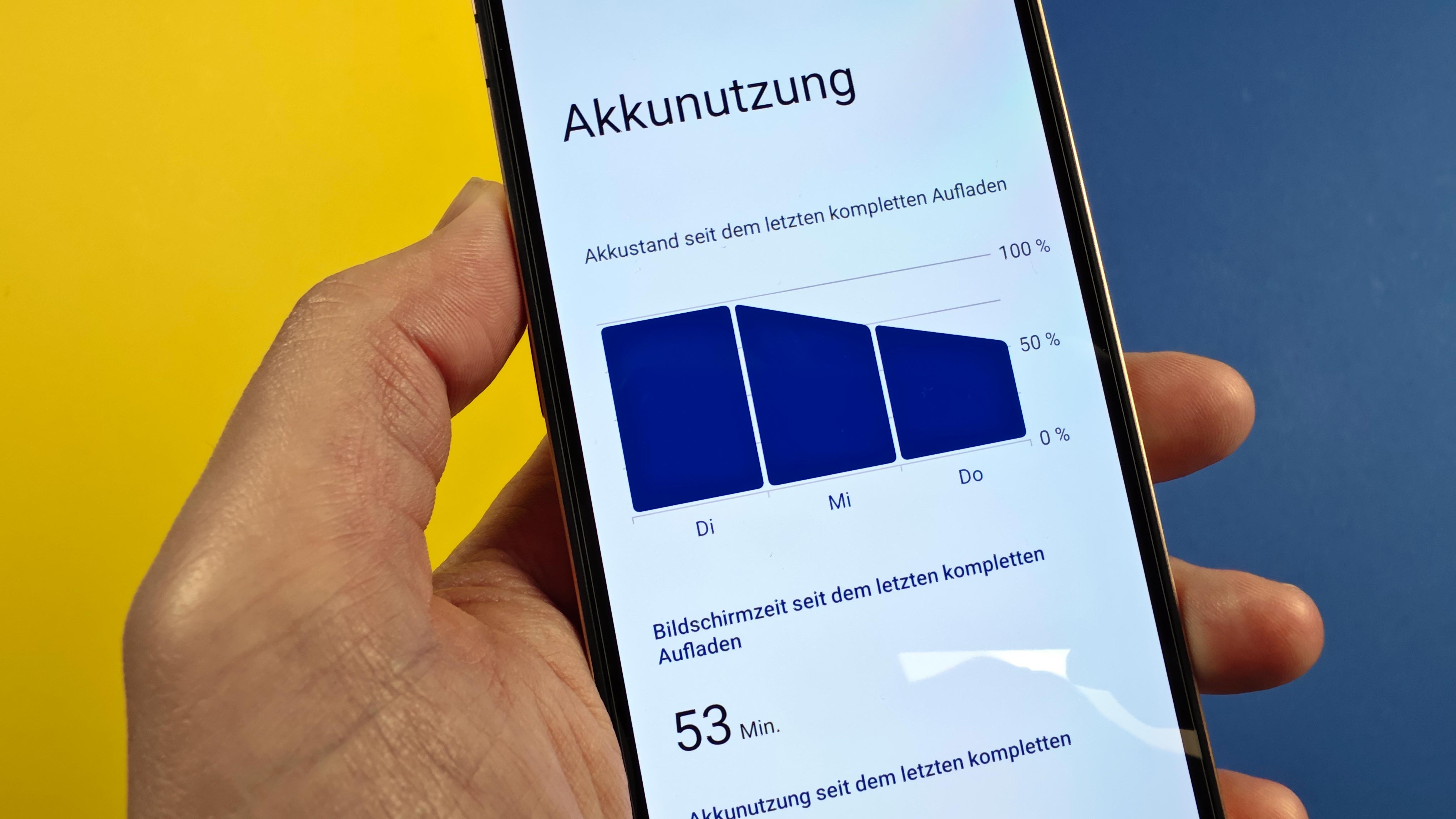 Trotz des kompakten Formfaktors bietet das Smartphone einen Akku mit 6200 mAh, was auch die Dicke des Geräts erklärt. Das sorgt für eine lange Akkulaufzeit, die im Alltag für zwei Tage ausreichen sollte. Im Battery Test von PCmark erreicht das Gerät einen Dauerbetrieb von 18 Stunden. Ein Netzteil mit einer Ladeleistung von 33 W liegt bei. Damit ist das Gerät in knapp einer Stunde von 20 auf 100 Prozent aufgeladen. Kabelloses Laden ist ebenfalls möglich, mit einer Leistung von etwa 15 W.