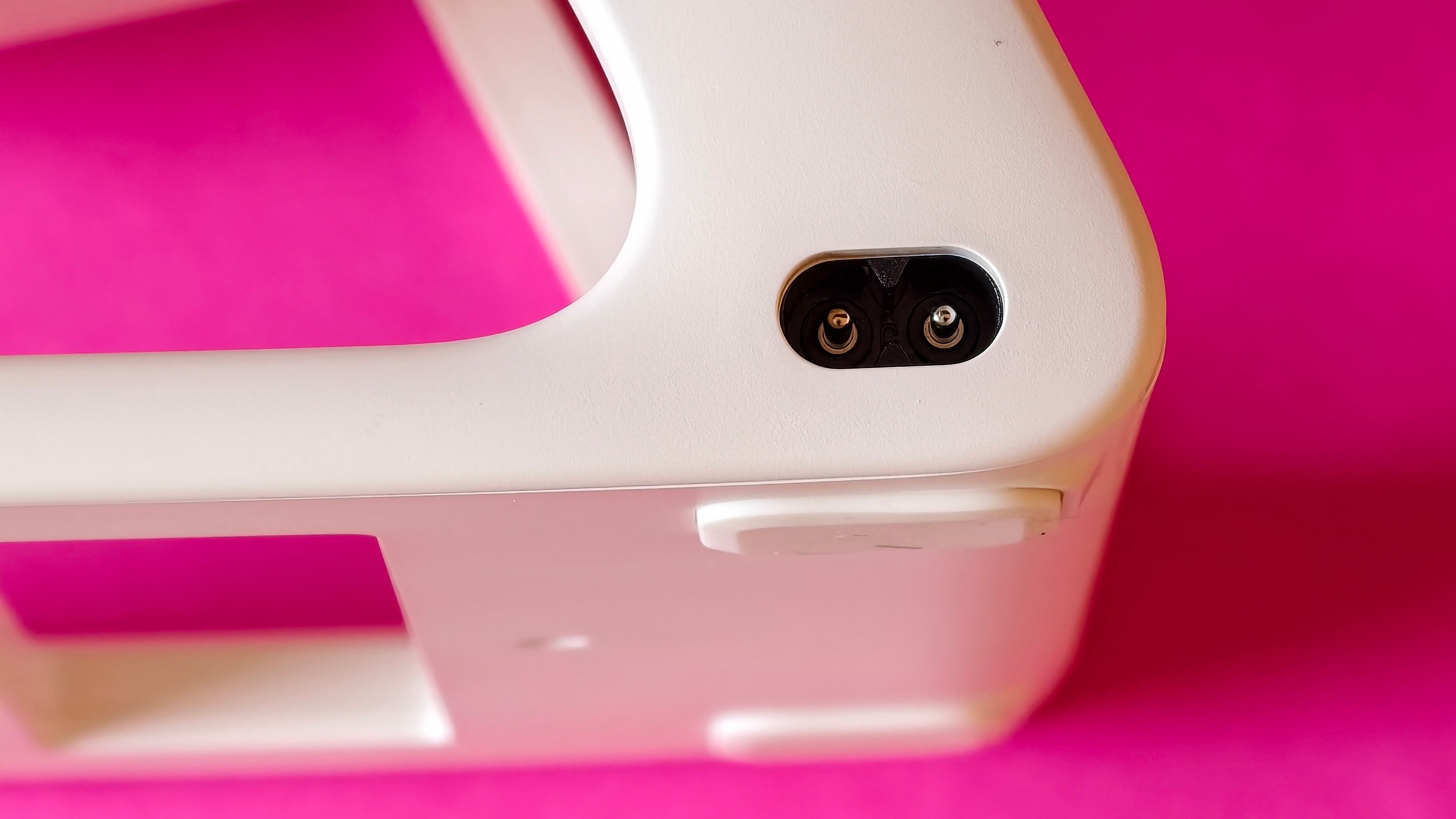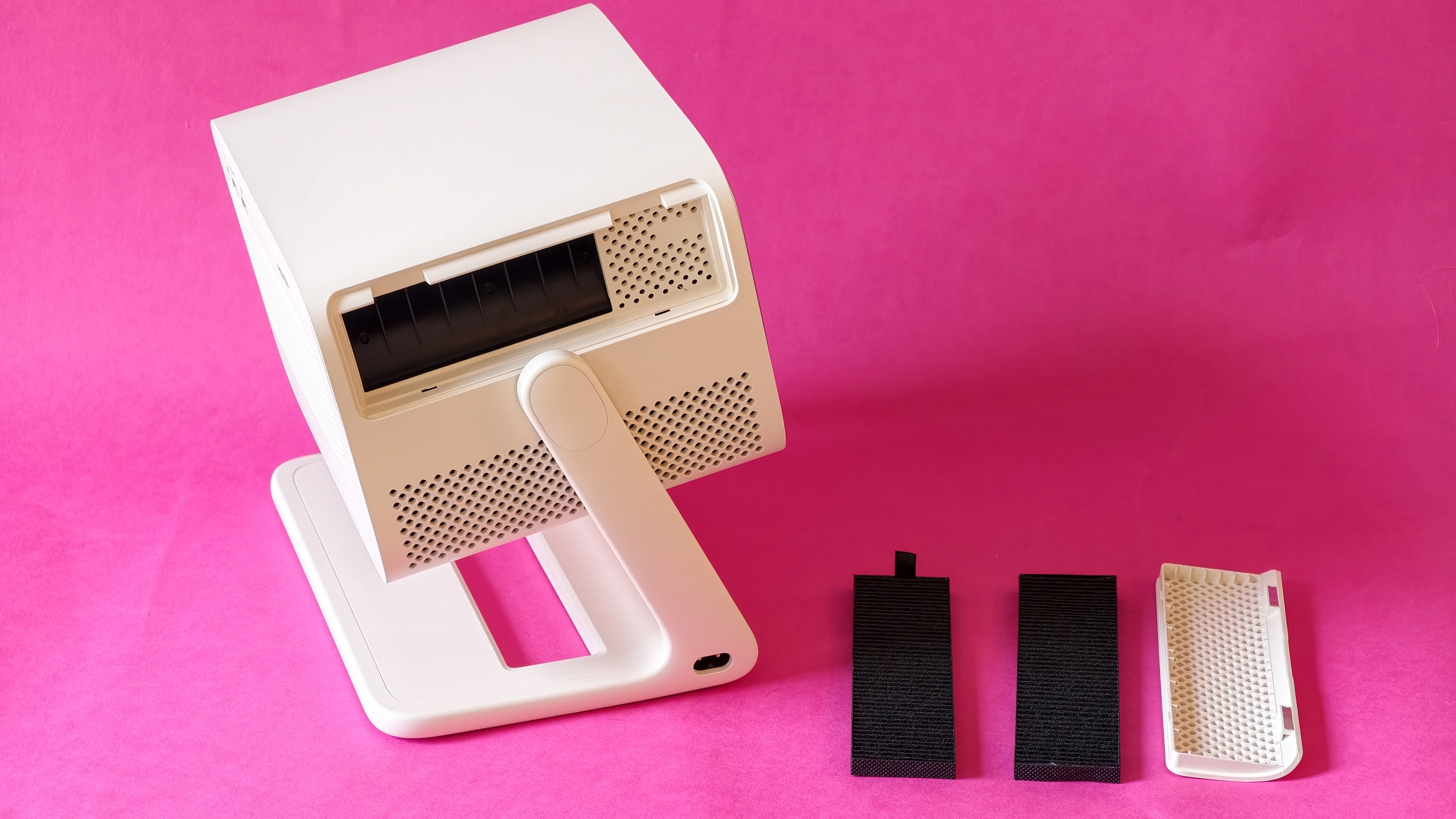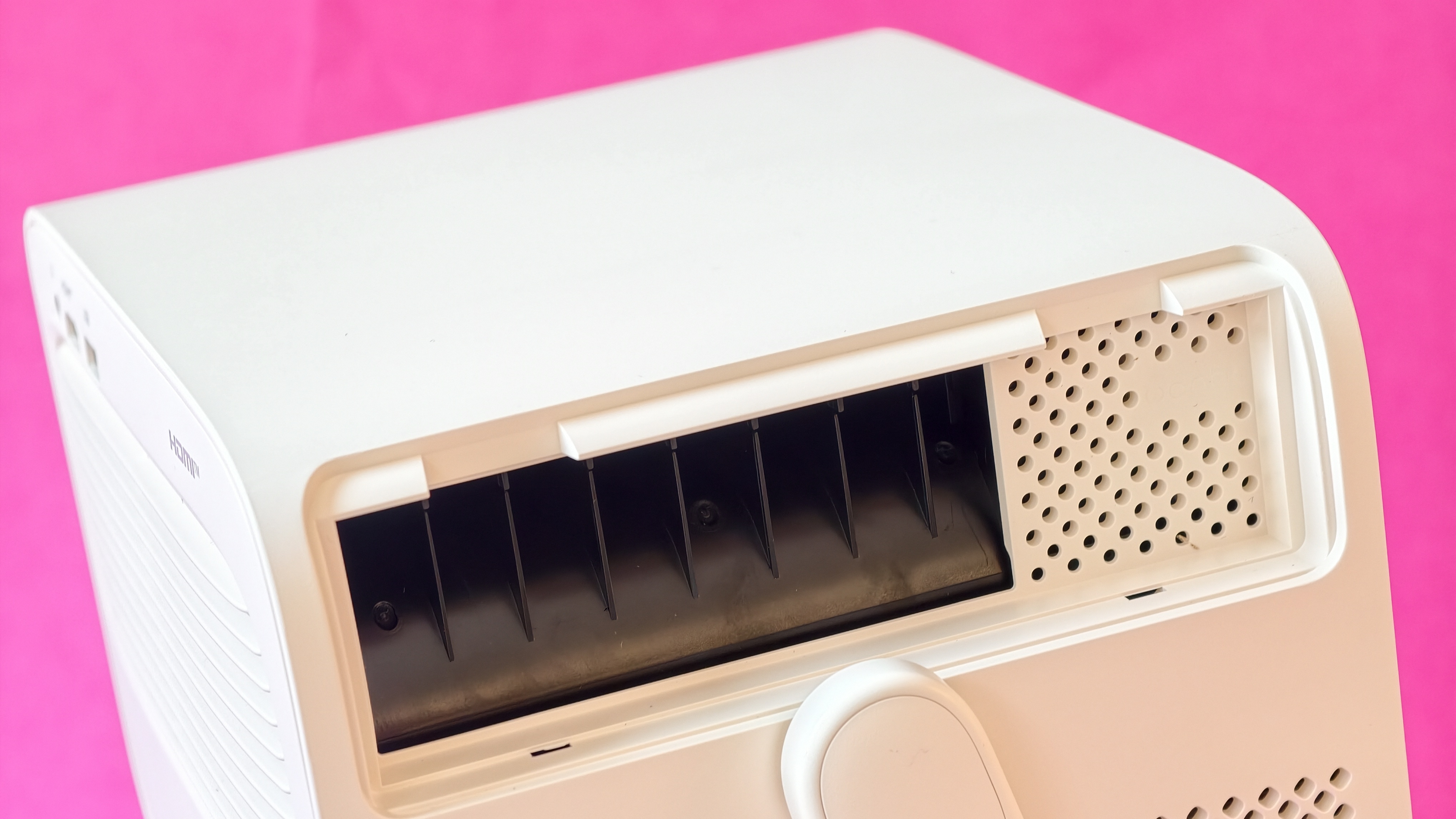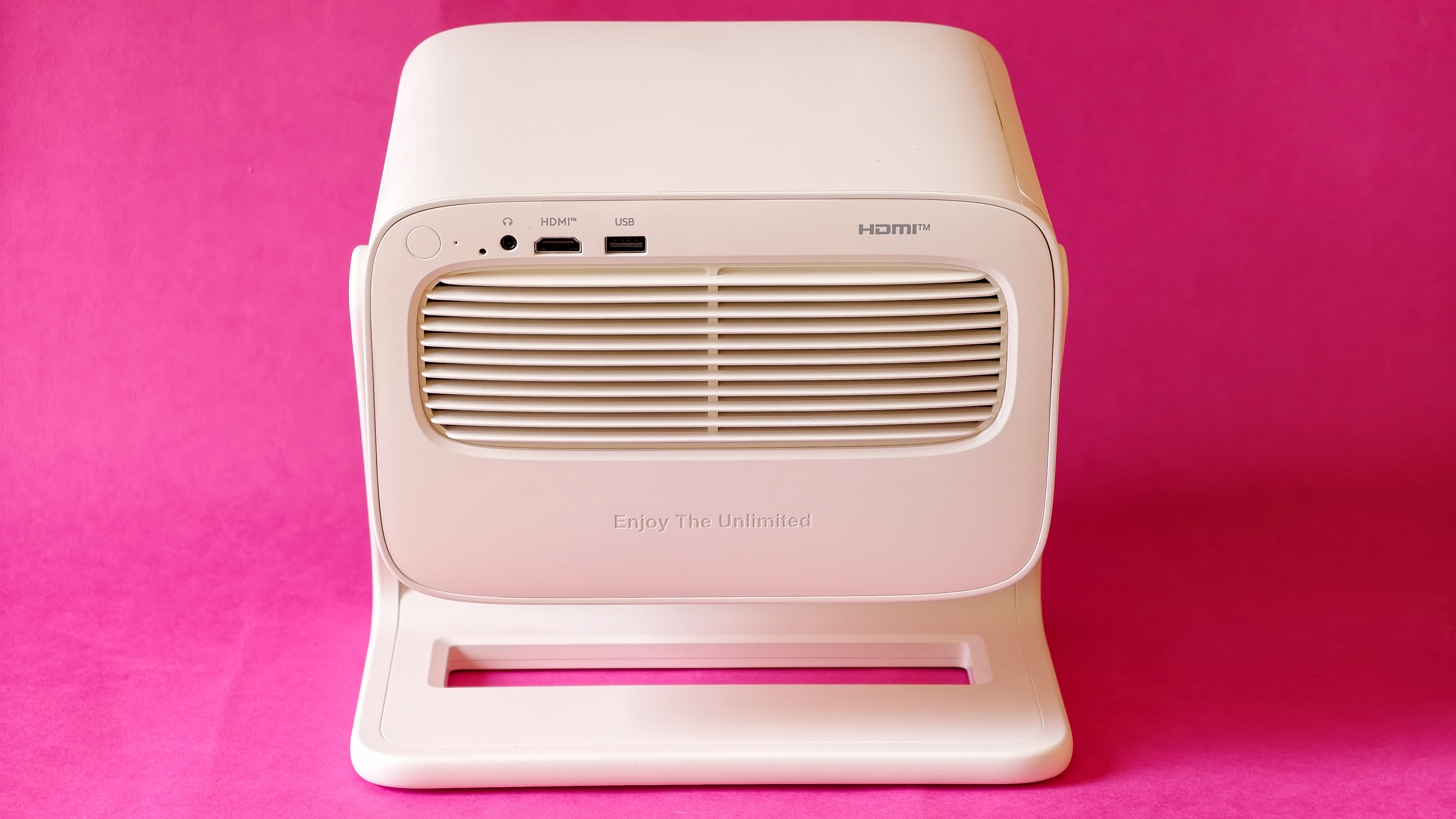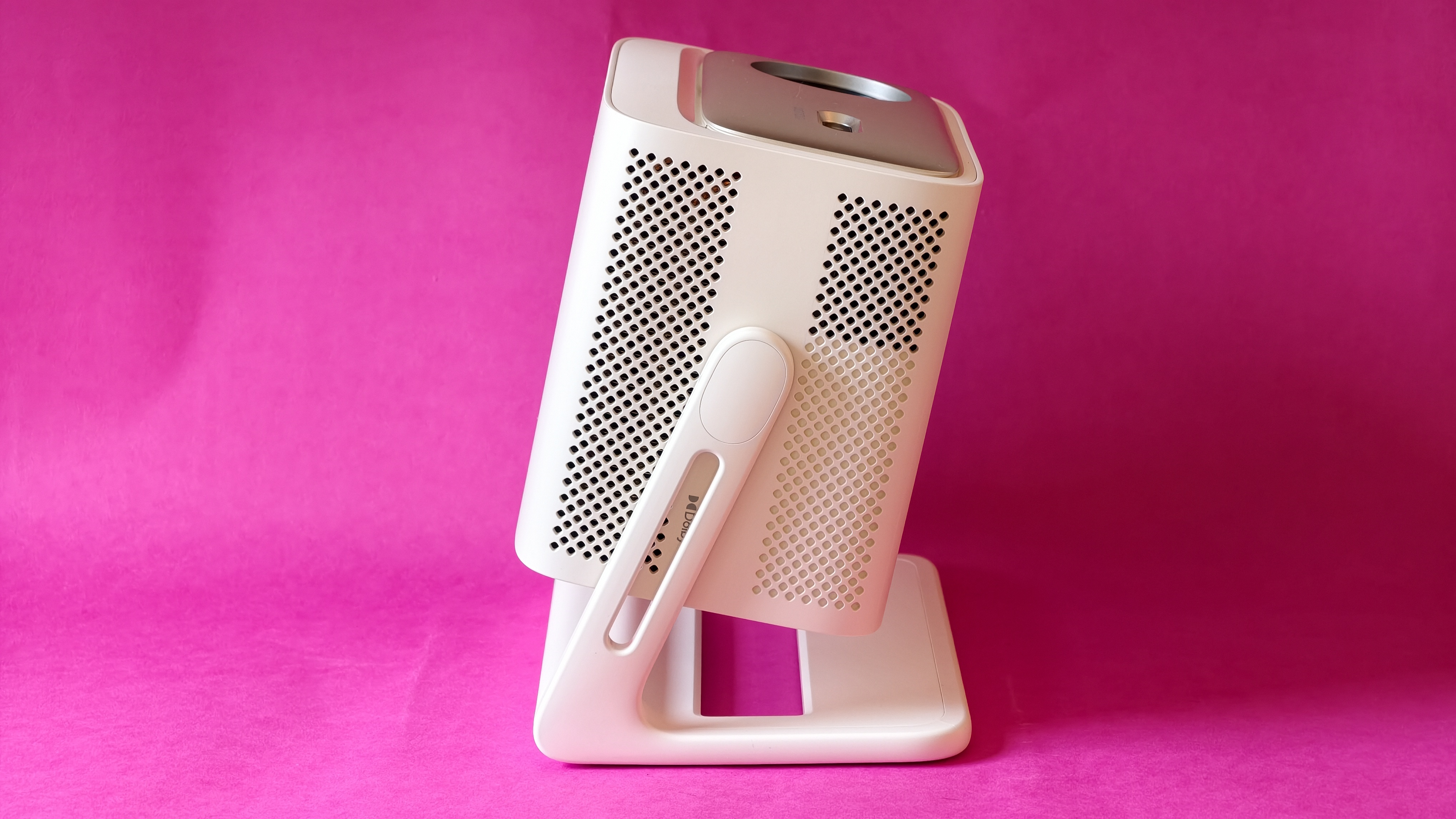 Auffälligstes Designmerkmal ist der integrierte Tragegriff, der den Transport erleichtert. Darunter sitzt ein Ständer, in dem der Beamer vertikal gedreht werden kann. So lässt sich die Projektionshöhe flexibel anpassen, ohne ein Stativ zu benötigen. Im zusammengeklappten Zustand schützt der Ständer gleichzeitig die empfindliche Linse – eine clevere Lösung, die an den Mechanismus des Xgimi Mogo 3 Pro (Testbericht) erinnert.