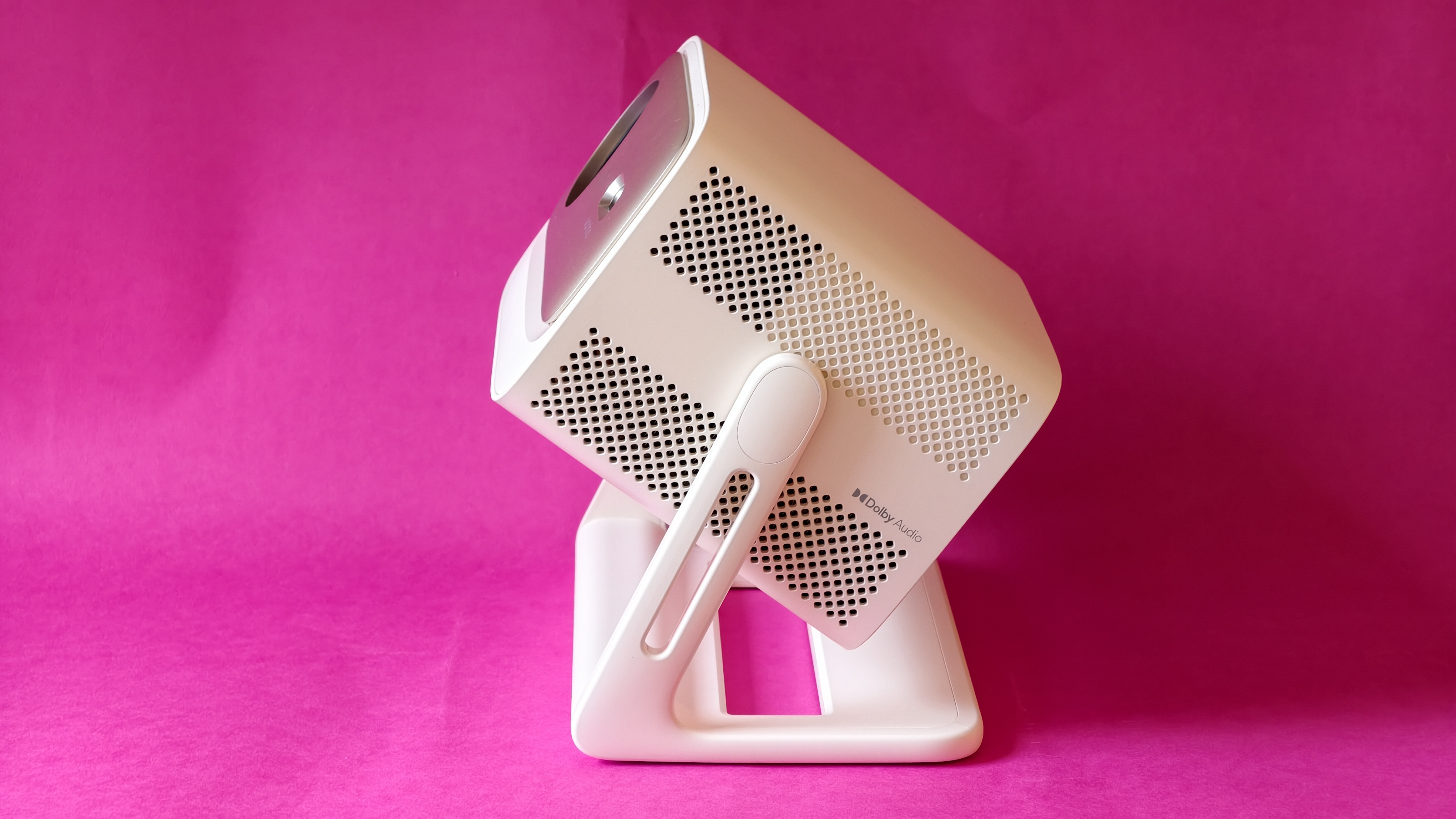 Entscheidet ihr euch für den Kauf, bekommt ihr einen Beamer mit drehbarem Objektiv, 1080p-Full-HD-Auflösung und 450 ISO-Lumen. Eine Besonderheit des Mogo 3 Pro ist der um 130 Grad verstellbare Ständer, der direkt mit dem Gehäuse verbunden ist. Das beeinflusst maßgeblich das ungewöhnliche Design des Beamers, der außerdem mit zwei 5-Watt-Speakern ausgestattet ist.
