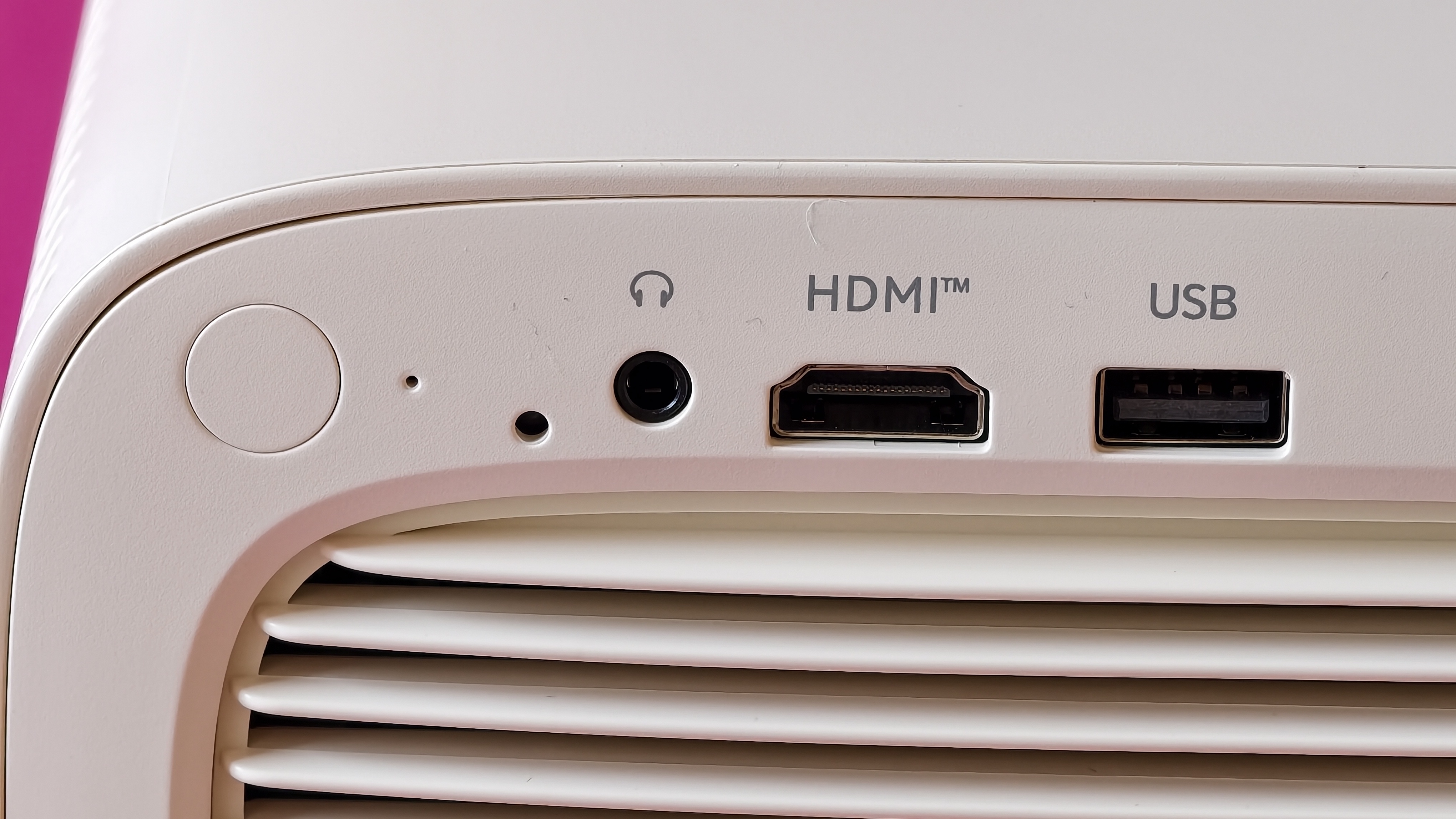Auf der Unterseite verfügt der Beamer über ein Stativgewinde. Auf der Rückseite befinden sich ein LAN-Anschluss, eine 3,5-mm-Line-Out-Buchse, ein HDMI- und ein USB-A-Port sowie der Anschluss für das Netzteil. Außerdem verbergen sich hinter einer perforierten Abdeckung zwei 5-W-Lautsprecher und der Ausgang für die Abluft. Hier gibt es gleich zwei Besonderheiten.