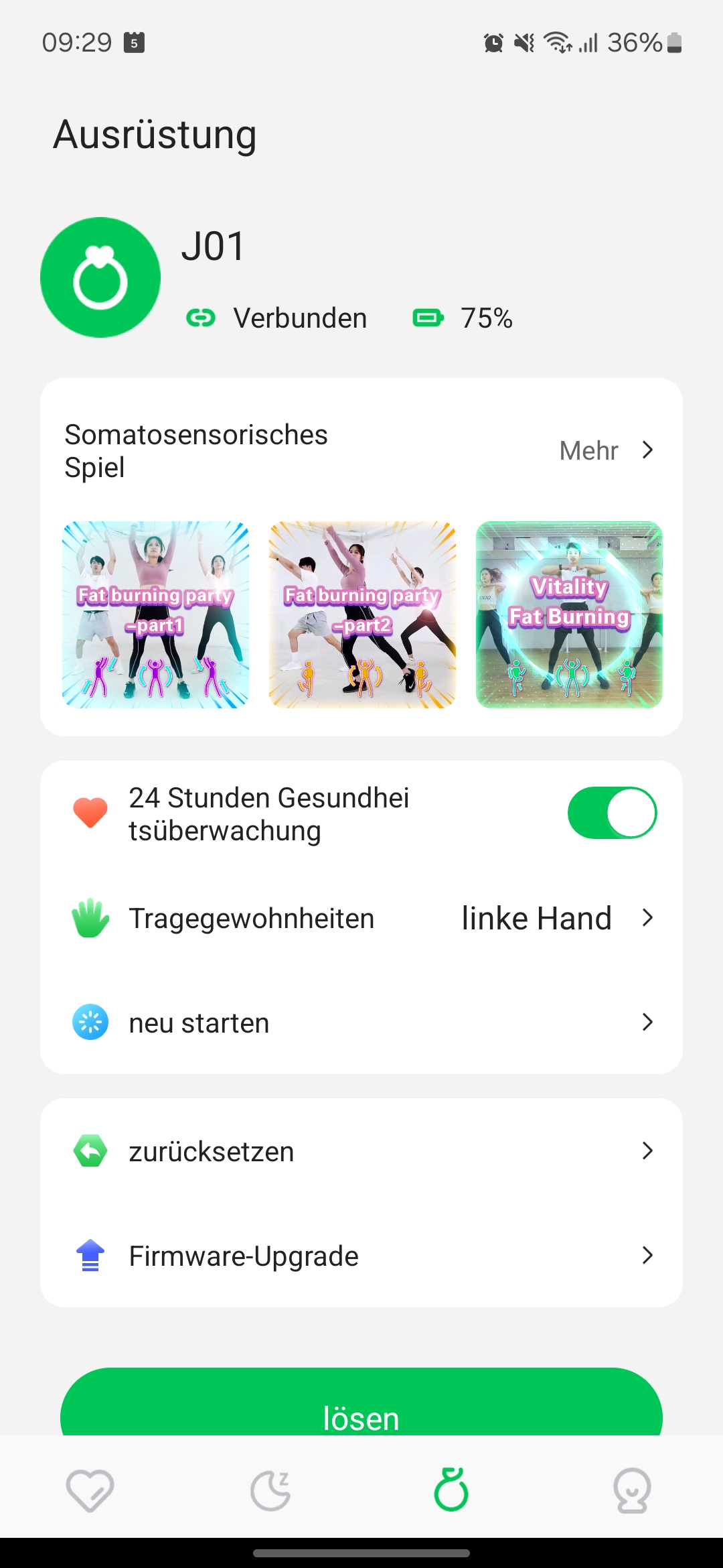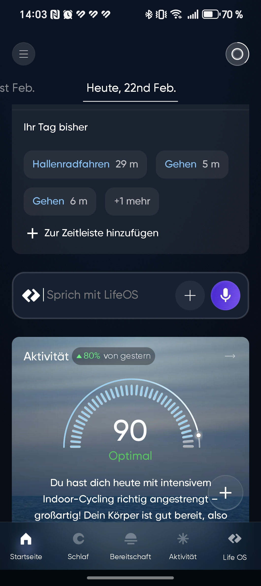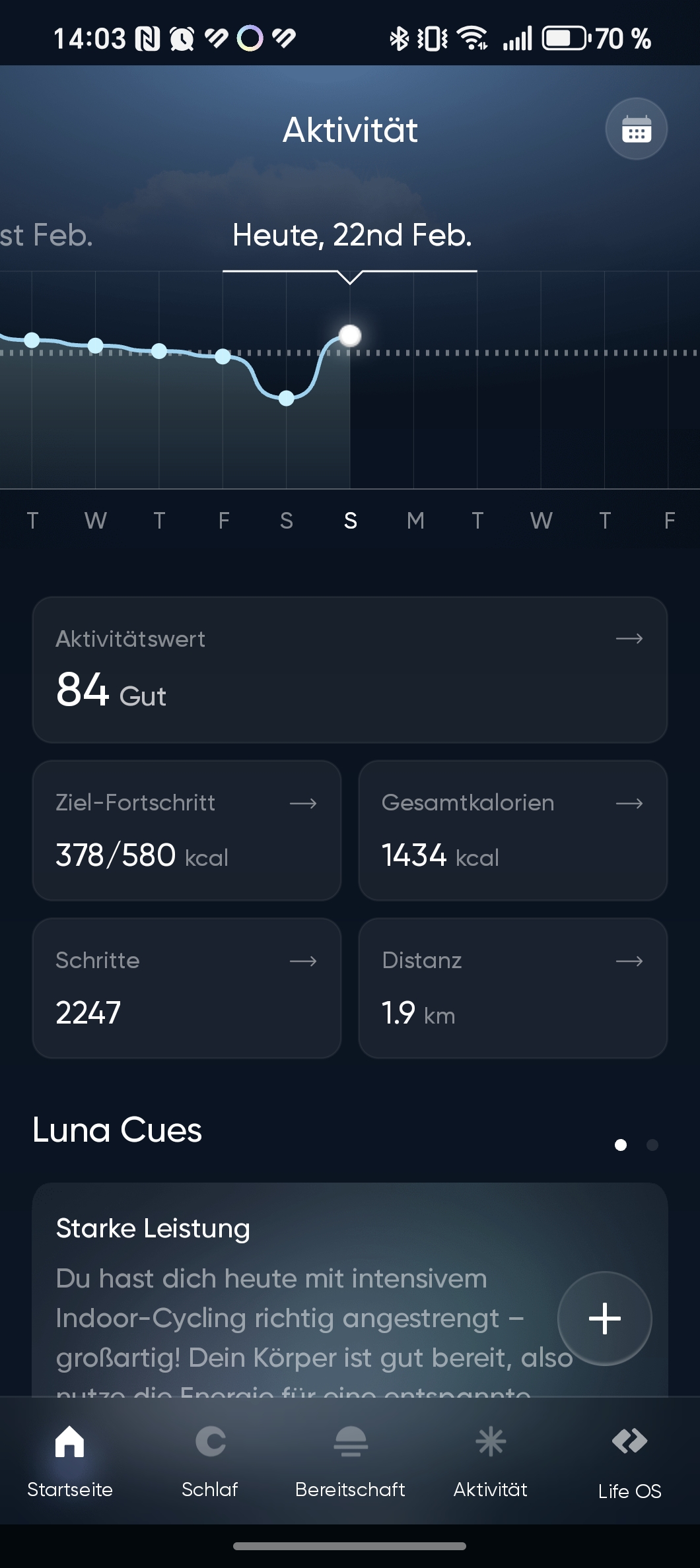 Der Ring setzt auf die App „Aizo“. Diese wirkt aufgeräumt und übersichtlich, leidet jedoch unter zahlreichen Übersetzungsfehlern, die den Gesamteindruck trüben. So begegnet man Begriffen wie „Einstellungseinstellungen“ oder der Aufforderung „Mach dich jeden Tag energisch“. Selbst das Fahrradfahren wird eigenwillig als „Reiten“ bezeichnet – eine sprachliche Nachlässigkeit, die bei einem solchen Produkt nicht vorkommen sollte. Sonderlich viele Sportprofile gibt es zudem nicht.