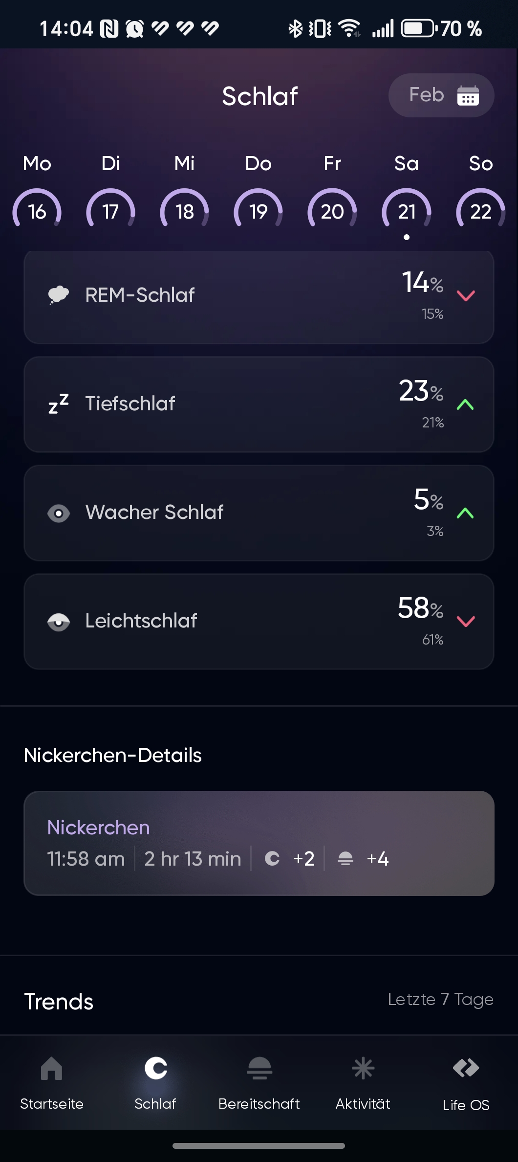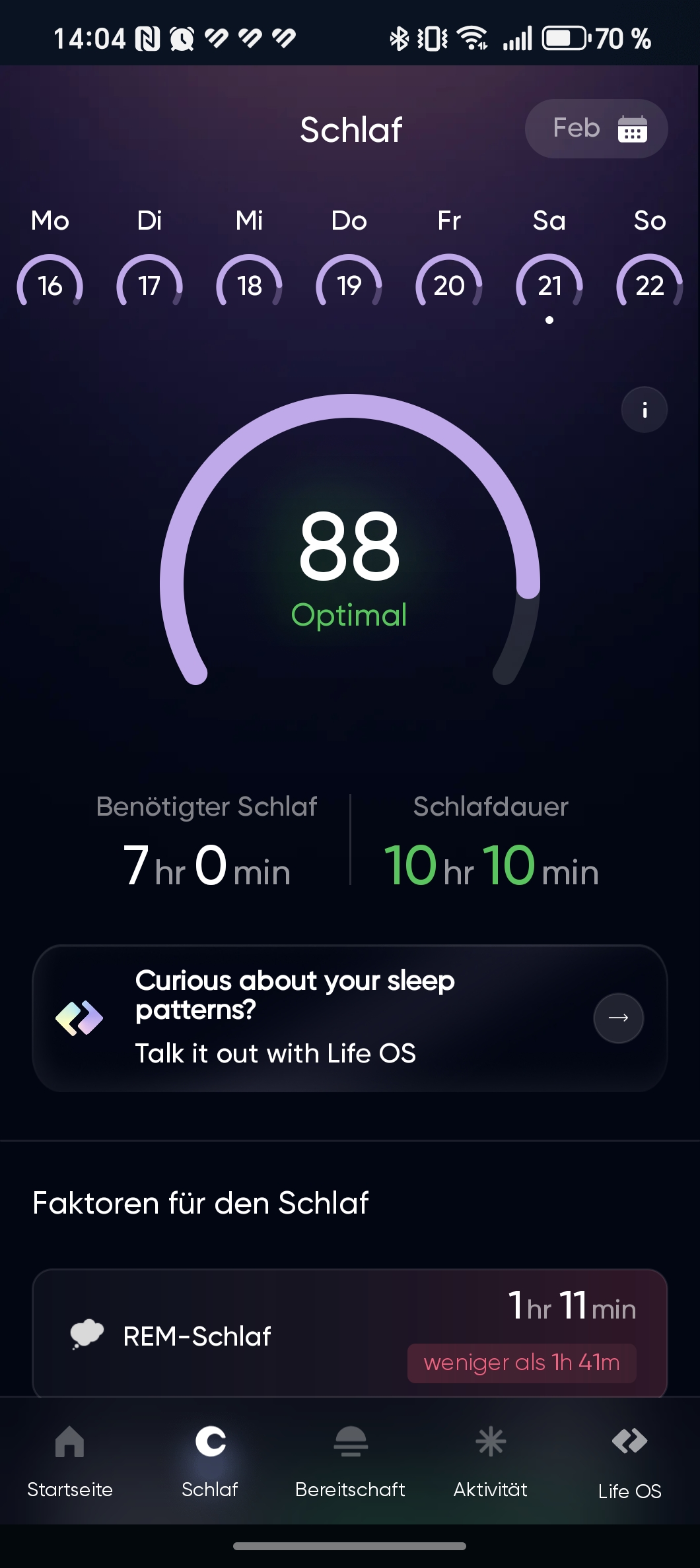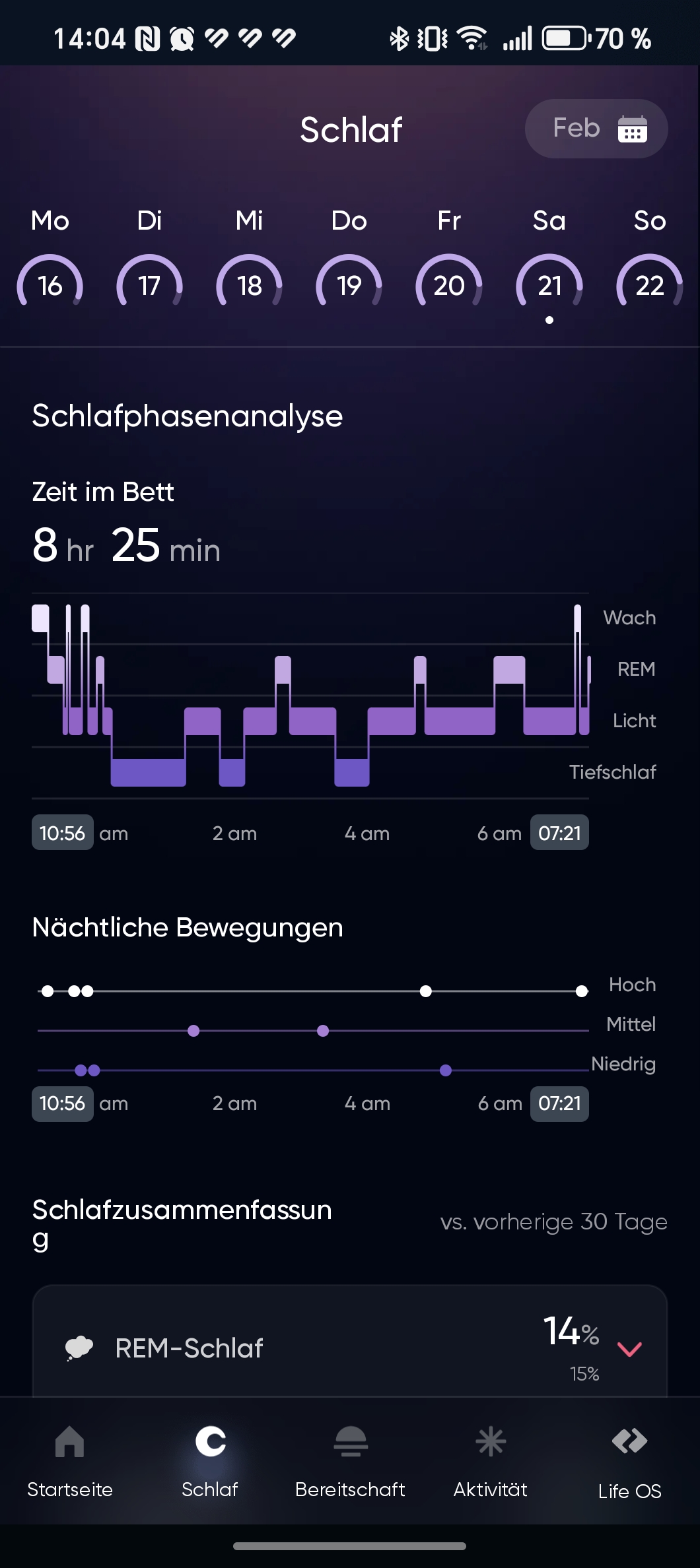 Die App analysiert den Schlaf und unterteilt ihn in die Phasen: leichter Schlaf, tiefer Schlaf und REM (Rapid Eye Movement). In der Praxis ließ die Genauigkeit allerdings zu wünschen übrig. Verglichen mit einer Smartwatch wie der Huawei Watch Fit 3 ermittelte der Ring deutlich längere Schlafzeiten – auch dann, wenn wir noch wach im Bett lagen oder gelesen haben. Diese Zeiten wurden fälschlicherweise bereits als Schlaf gewertet. Insgesamt fiel die Schlafanalyse für unseren Geschmack zu unpräzise aus.