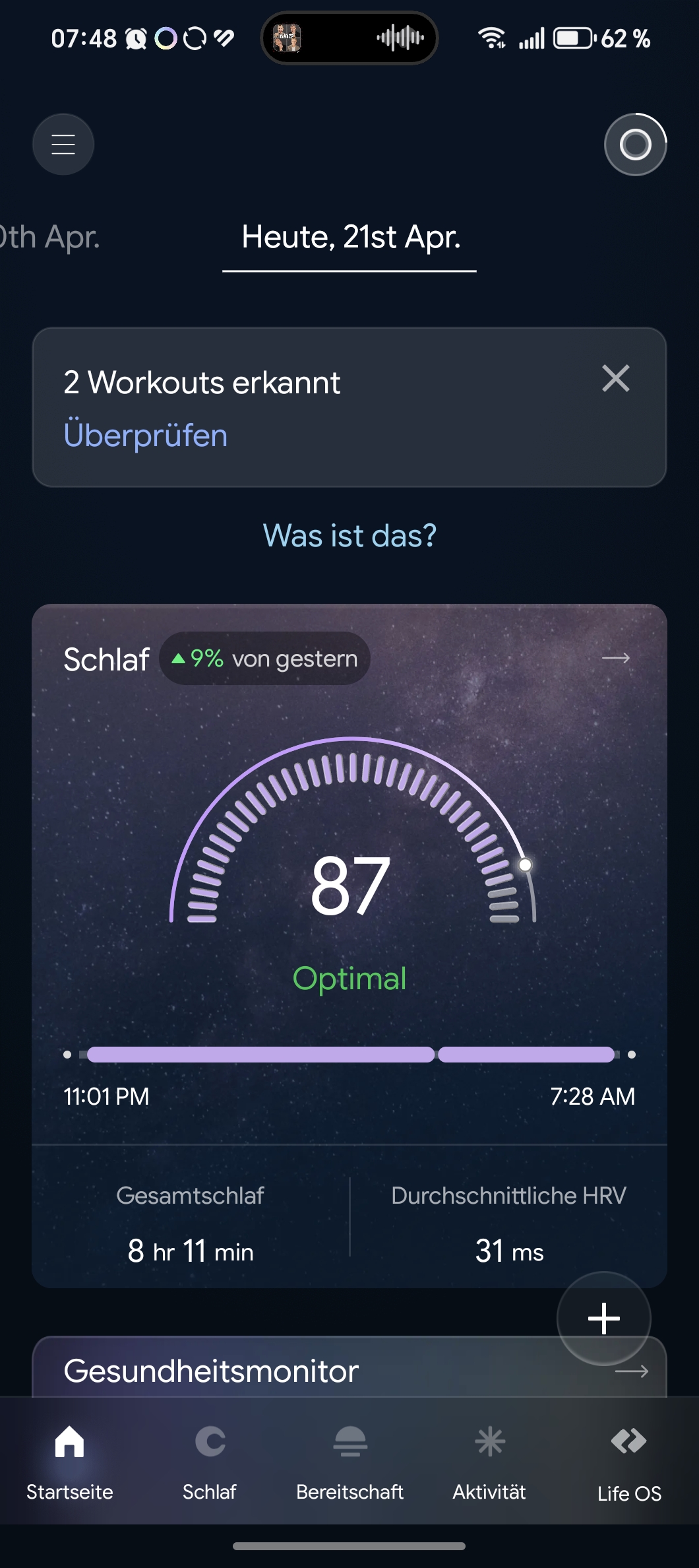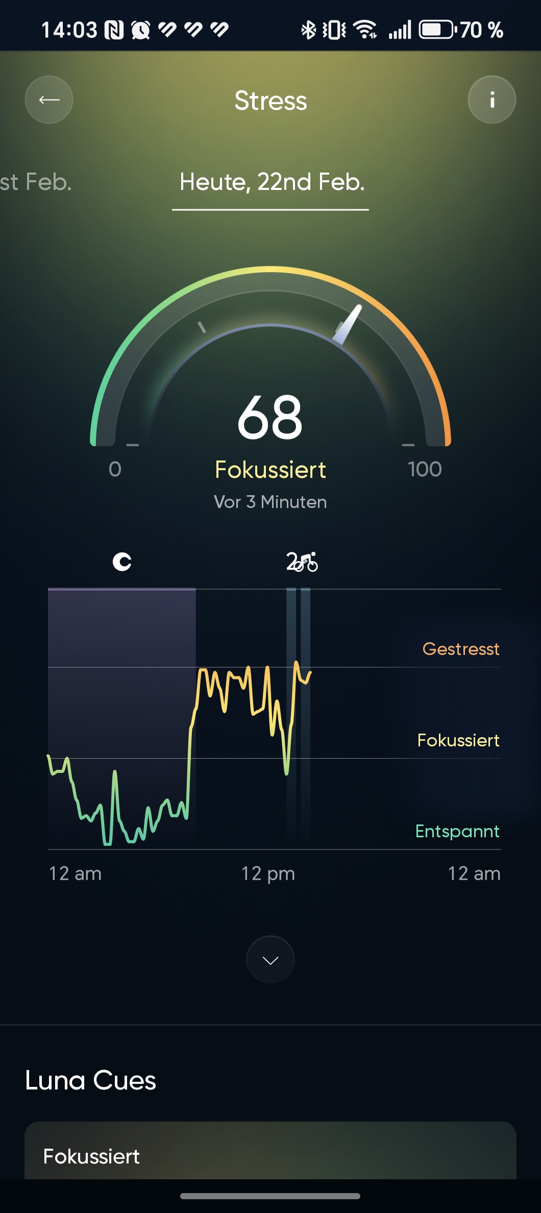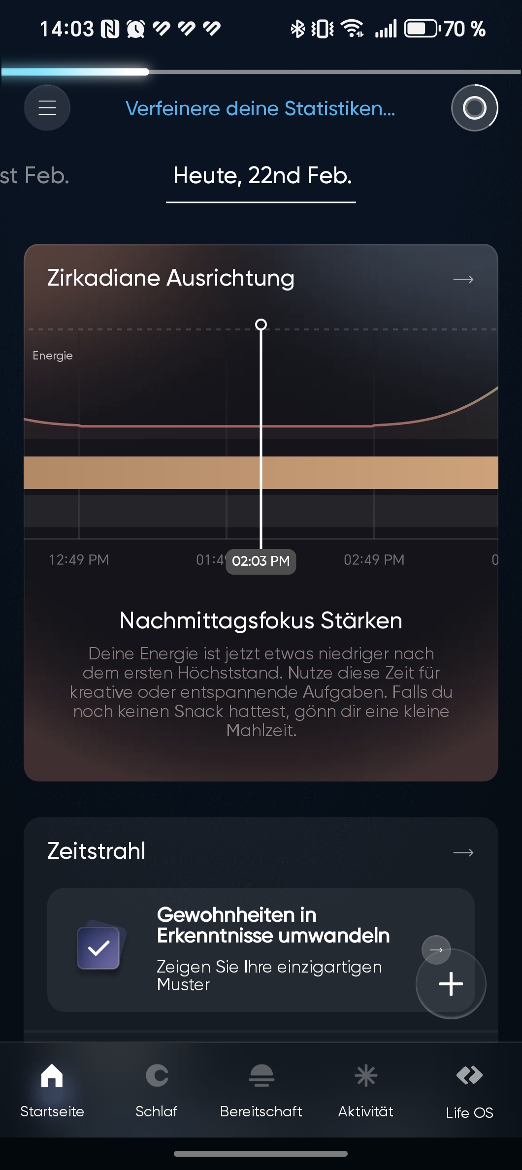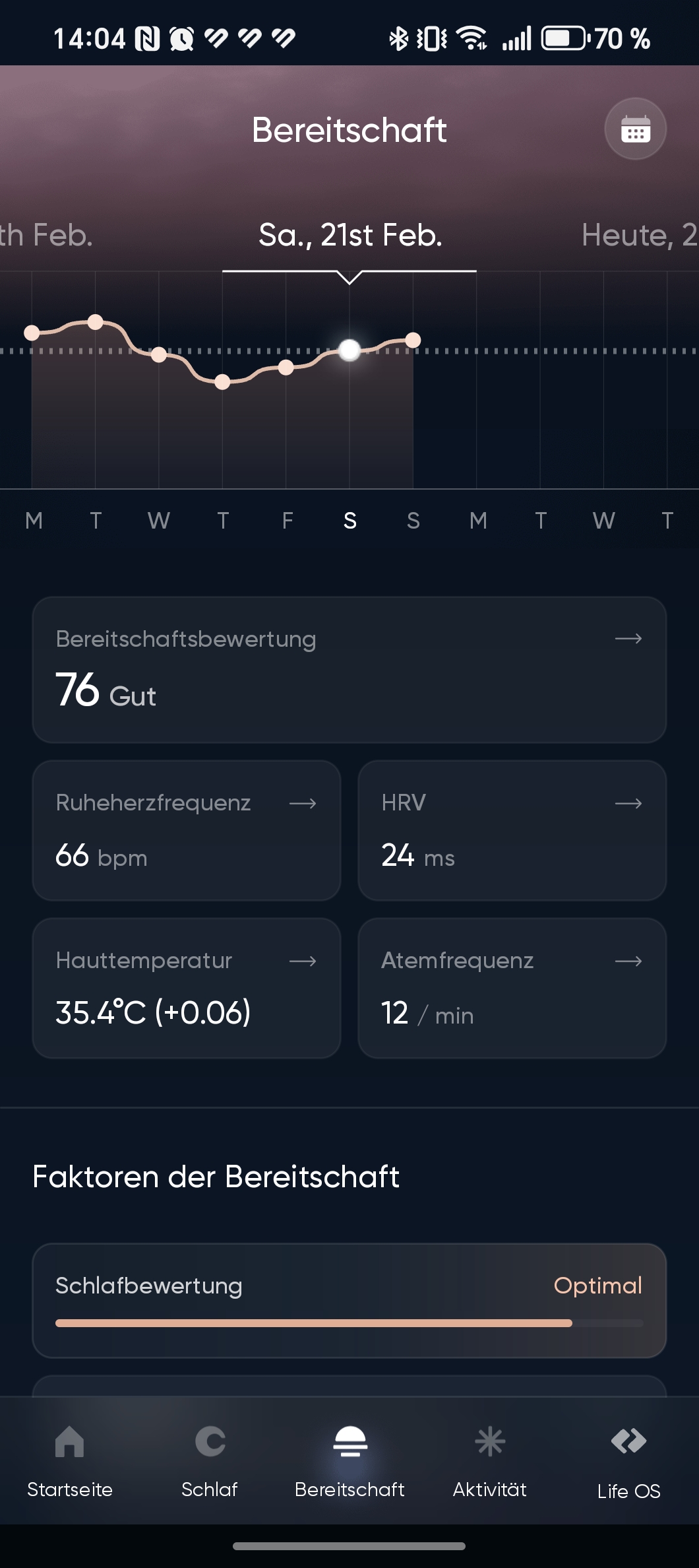 Am unteren Rand bietet das Navigationsmenü eine Ansicht des aktuellen Tags – also des beschriebenen Startbildschirms –, dazu eine kompakte Übersicht der einzelnen Vitalwerte sowie langfristige Gesundheitsstatistiken, etwa zur Schlafqualität, zum durchschnittlichen Stresslevel und zur kardiovaskulären Fitness