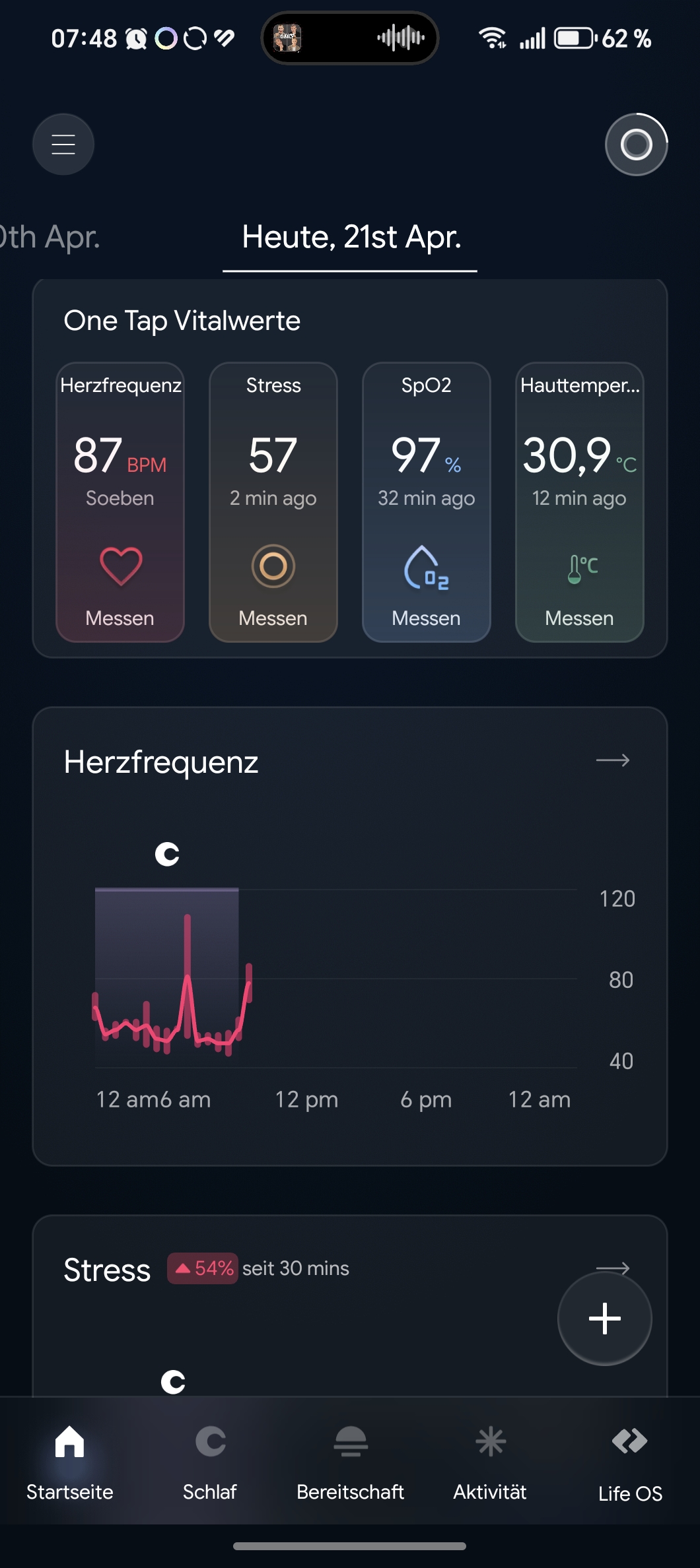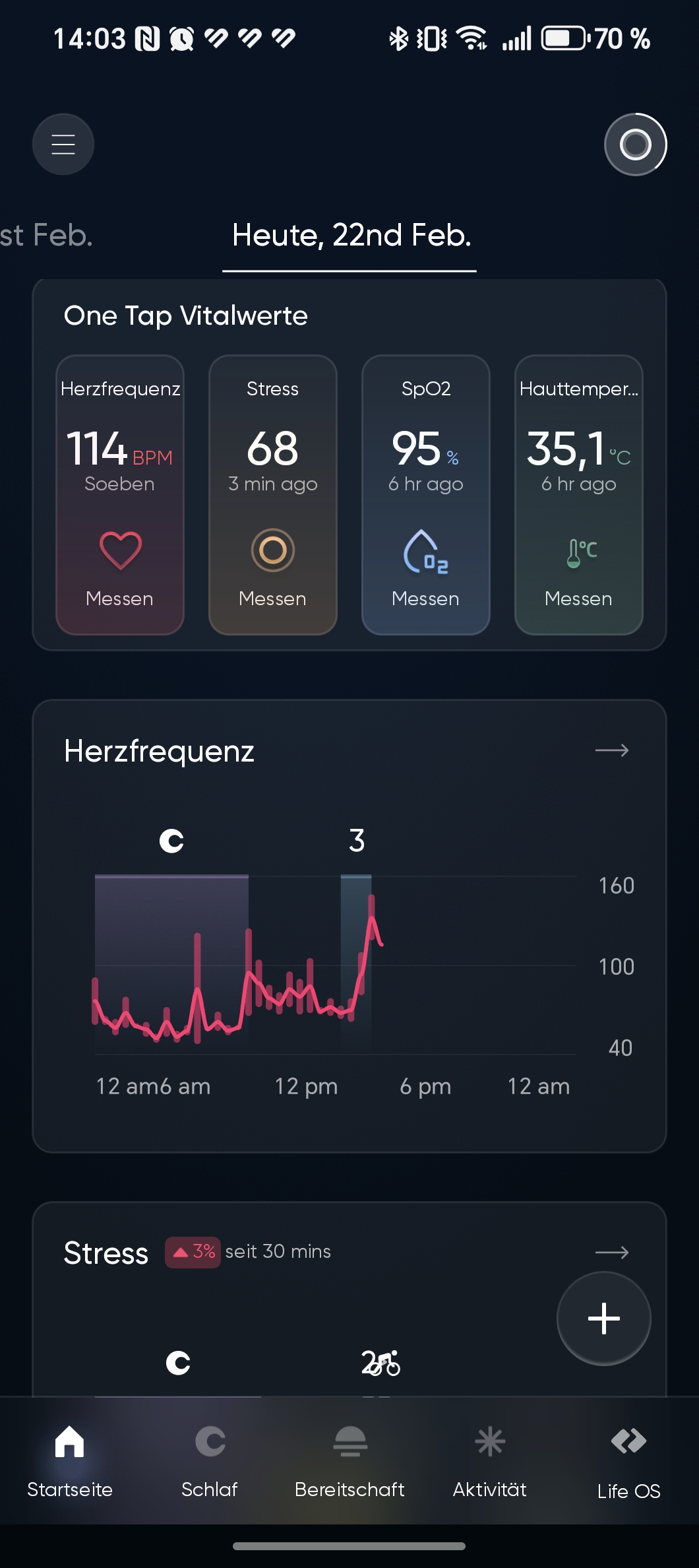 Die App ist klar strukturiert. Auf dem Startbildschirm erscheinen oben Punkte für Tagesform, Schlaf und Aktivität sowie die aktuelle Herzfrequenz. Darunter folgen Stresswerte, Herzschlagverlauf, Balance der Herzfrequenzvariabilität (HFV) und die letzten Aktivitäten.
