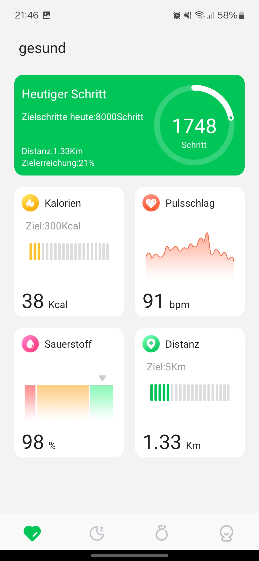 Nicht ganz überzeugen kann die Pulsmessung. Zum einen läuft diese nicht kontinuierlich im Hintergrund, sondern auf Abruf. Laut Hersteller sollte diese kontinuierlich erfolgen, wenn man sie in der App aktiviert. Ohne große körperliche Aktivität erscheint uns die Messung noch recht genau und liefert mit einer minimalen Abweichung von zwei Herzschlägen die gleichen Ergebnisse wie die Scanwatch 2 ab. Treibt man damit aber Sport, kommt die Pulsmessung nicht mehr hinterher. Als Fitness-Tracker fällt der M1 Smart Ring damit eher aus. Wenig realistisch, da zu niedrig, waren die Angaben zu den verbrannten Kalorien. Einen realistischen Eindruck hinterließ die Blutsauerstoffmessung, die deckungsgleich mit unserer Smartwatch war.