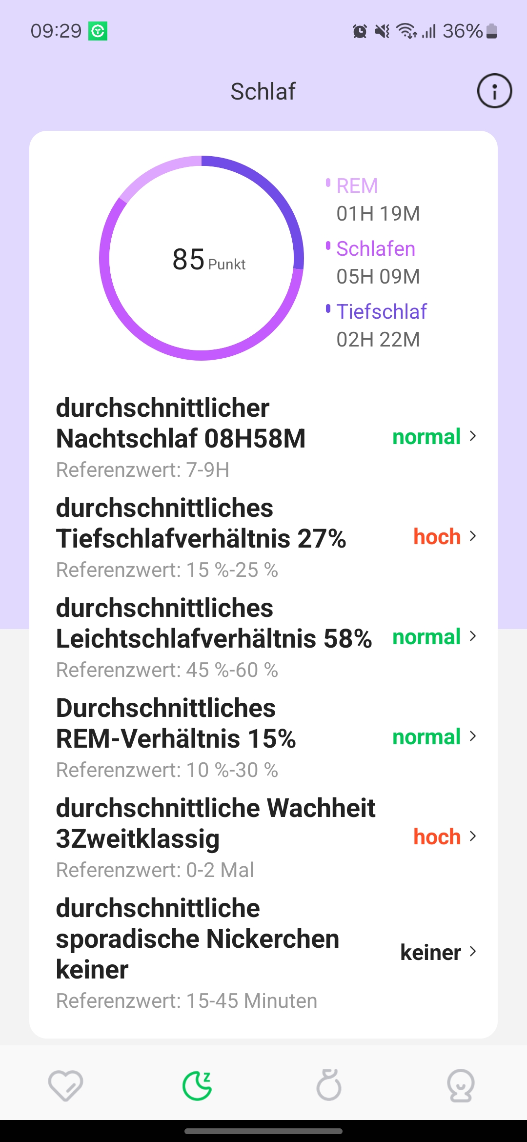 Die Schlafüberwachung teilt den Nachtschlaf in die üblichen Phasen Tiefschlaf, Leichtschlaf und REM auf. Zusätzlich werden Wachphasen sowie die Pulsentwicklung während der Nacht protokolliert. Auf Basis dieser Daten vergibt die App eine Bewertung der Schlafqualität. Im Vergleich zur Huawei Watch Fit 3 weichen die Daten allerdings teils deutlich ab. Insbesondere bei der Erkennung von Wachphasen zeigt der Ring ähnliche Schwächen wie viele Smartwatches – nicht jede Unterbrechung wird korrekt erkannt. Insgesamt halten wir das Schlaf-Tracking jedoch für brauchbar – zumindest für eine grobe Tendenz der Schlafqualität.