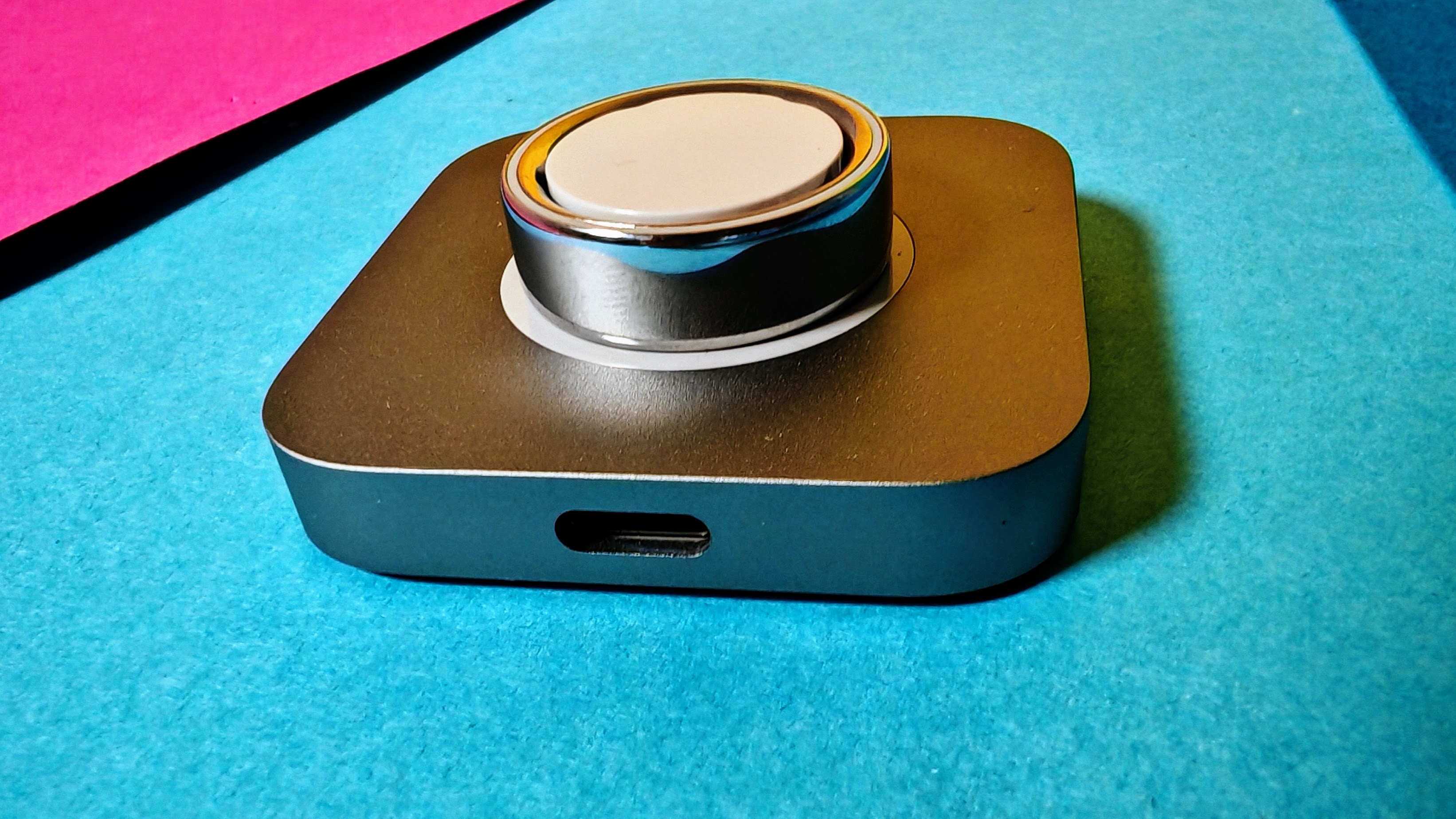 Das Ladegerät aus einfachem Kunststoff macht keinen besonders hochwertigen Eindruck. Der Ring wird zum Laden einfach aufgelegt und haftet magnetisch. Der Anschluss erfolgt über einen klassischen USB-A-Stecker – solide, bewährt und zuverlässig. Ein verschließbares Case wäre aber schöner gewesen.