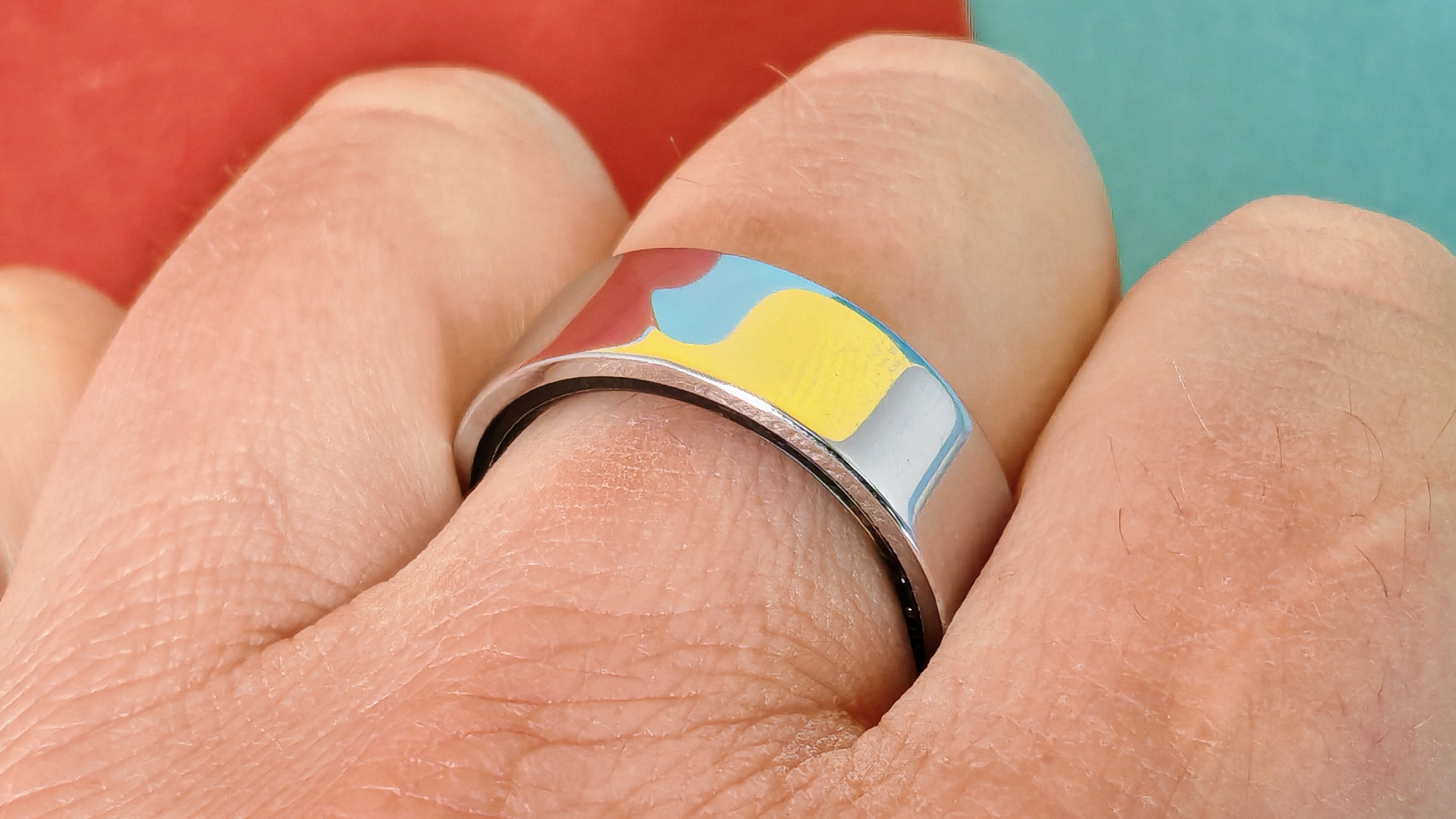 Abgesehen von der Touch-Fläche besteht der Ring aus Edelstahl. Im Vergleich zu Modellen von Amazfit oder Samsung fällt er zwar dünner, dafür aber deutlich breiter aus – was ihn am Finger wuchtiger wirken lässt. Mit fast 5 g ist er schwerer als die meisten Konkurrenten. Nachts beim Schlafen spürt man den Ring deutlich. Wer bislang keine Ringe getragen hat, wird sich daran erst gewöhnen müssen.