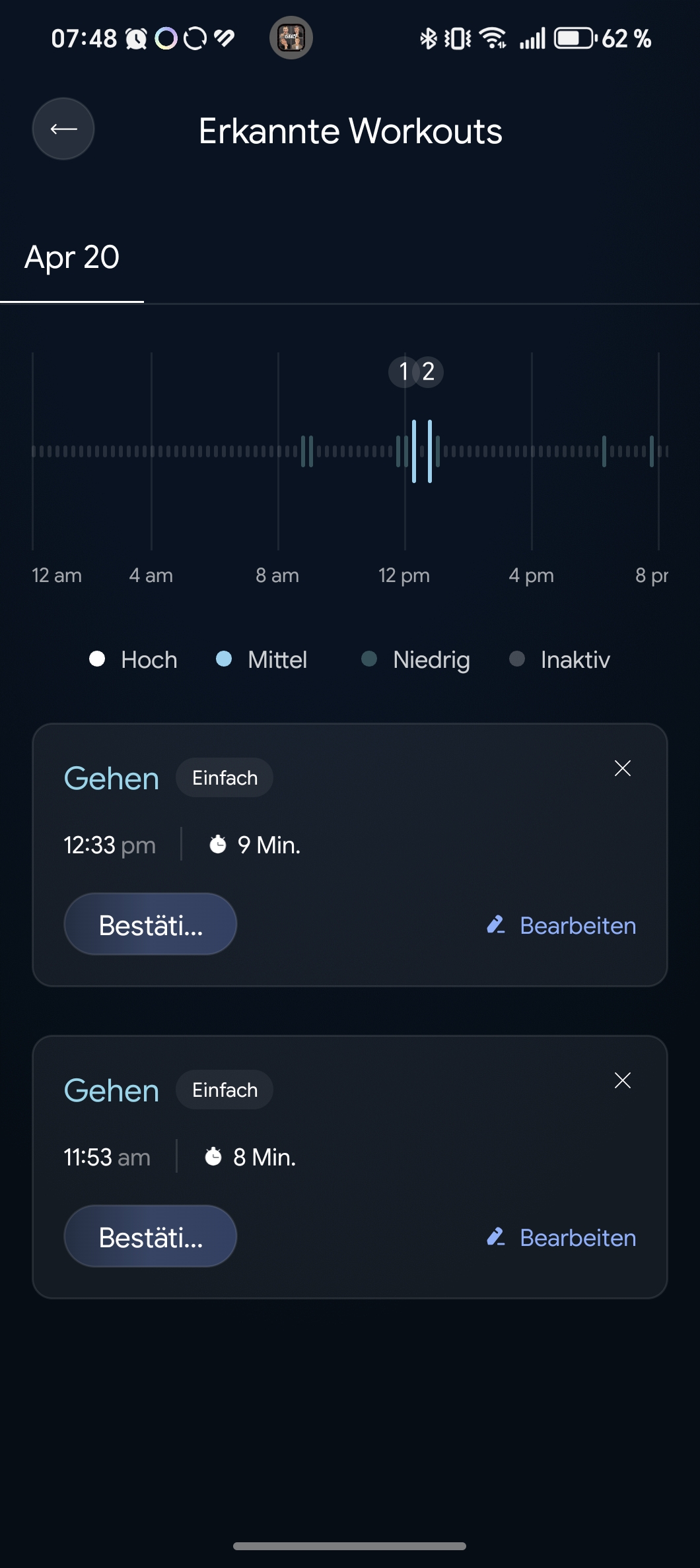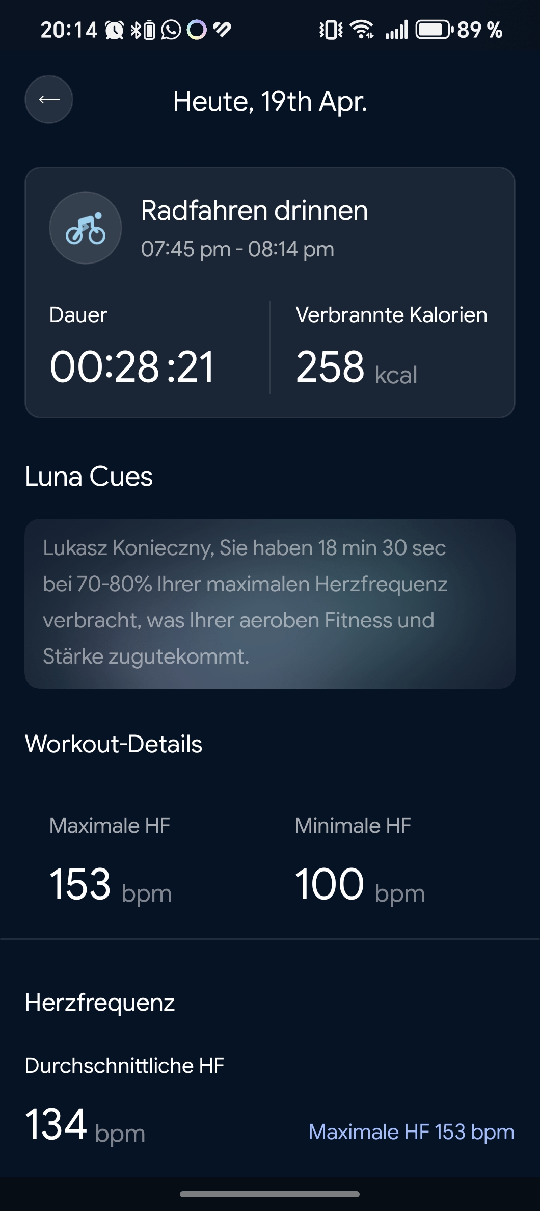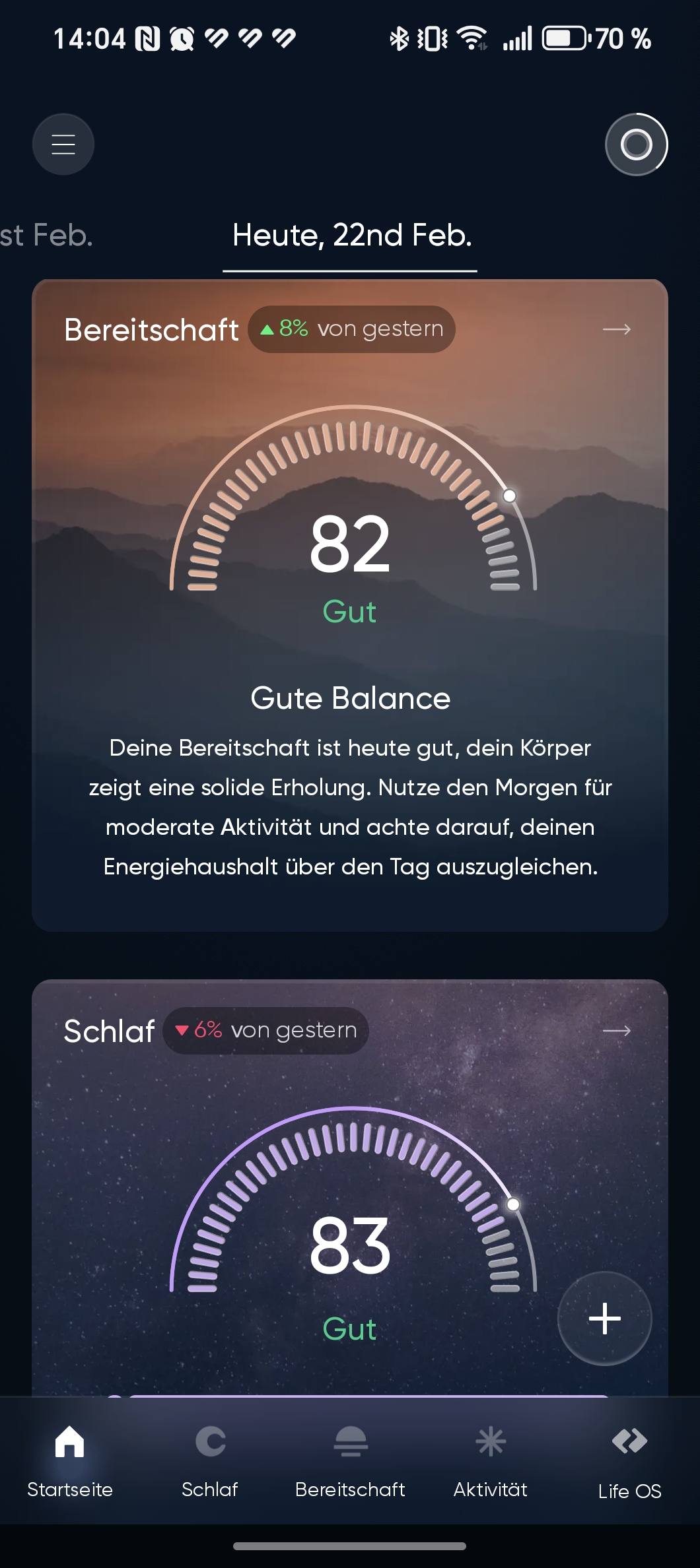 Rechts oben wird der Akkustand angezeigt, rechts unten lassen sich über das Plus-Symbol Aktivitäten oder Herzfrequenzmessungen starten. Hinter dem Burger-Menü oben links verbergen sich Einstellungen und Detailberichte.