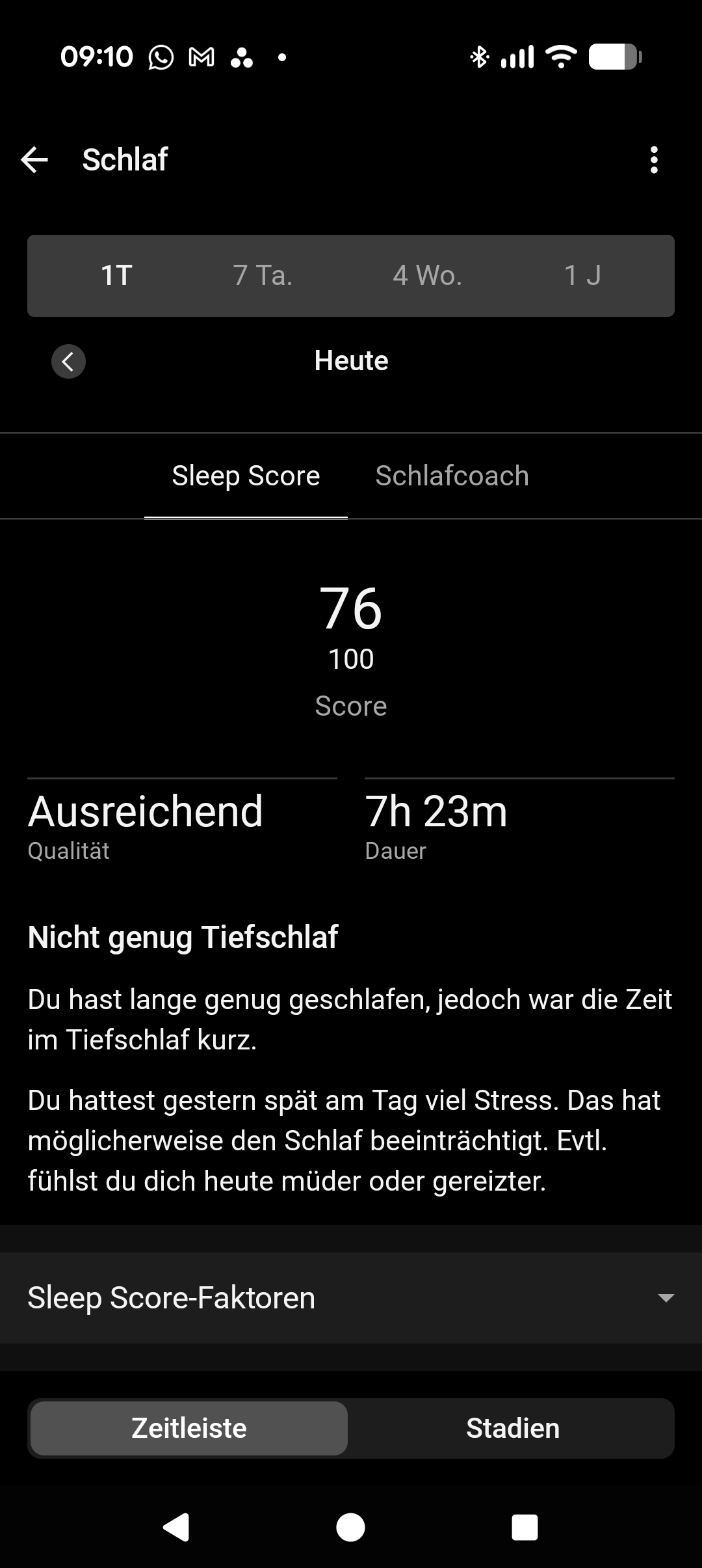 Zur Unterstützung einer besseren Schlafhygiene steht auch bei der Forerunner 570 der Schlafcoach von Garmin zur Verfügung. Dieser liefert sowohl in der Connect-App als auch direkt auf der Uhr Hinweise zur Schlafoptimierung. Zusätzlich empfiehlt der Schlafcoach auf Basis des bisherigen Schlafs und der aktuellen Trainingsbelastung eine passende Schlafdauer für die folgende Nacht. Im Test funktionierten sowohl das Schlaftracking als auch der Schlafcoach zuverlässig und entsprachen weitgehend unserem subjektiven Empfinden.