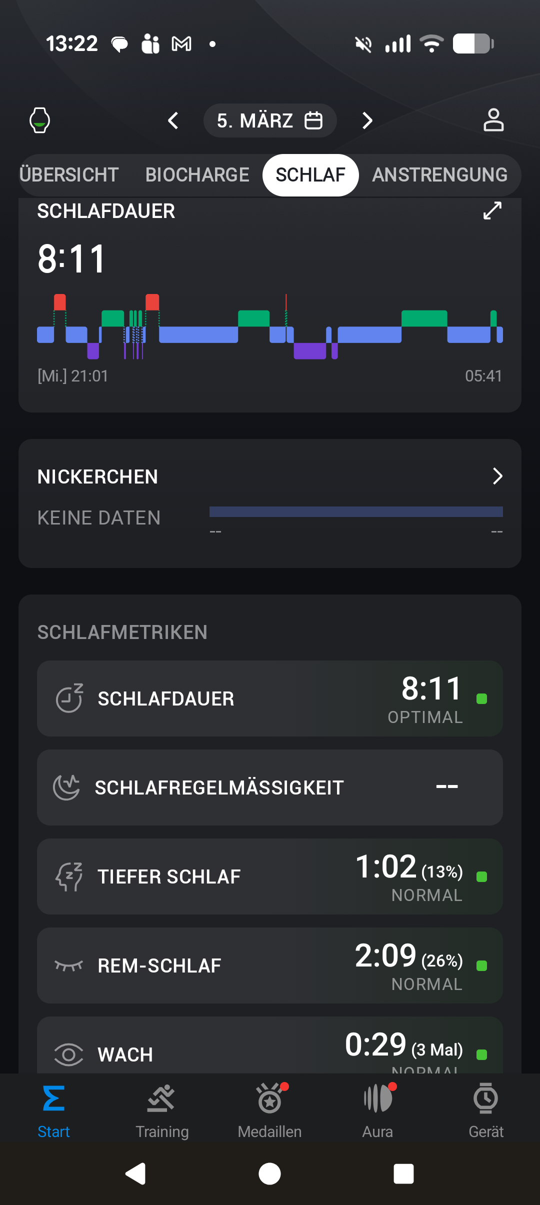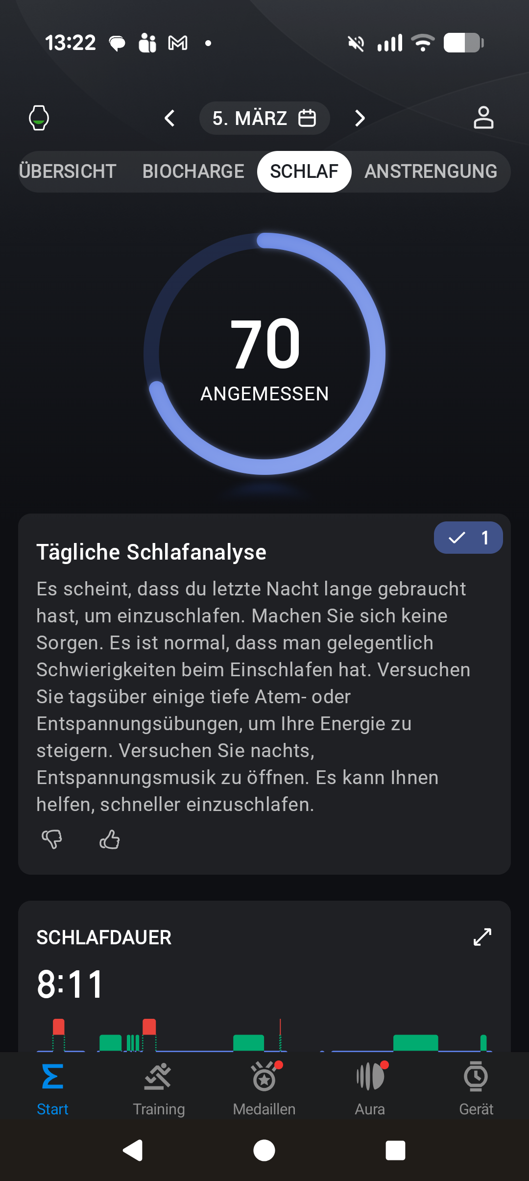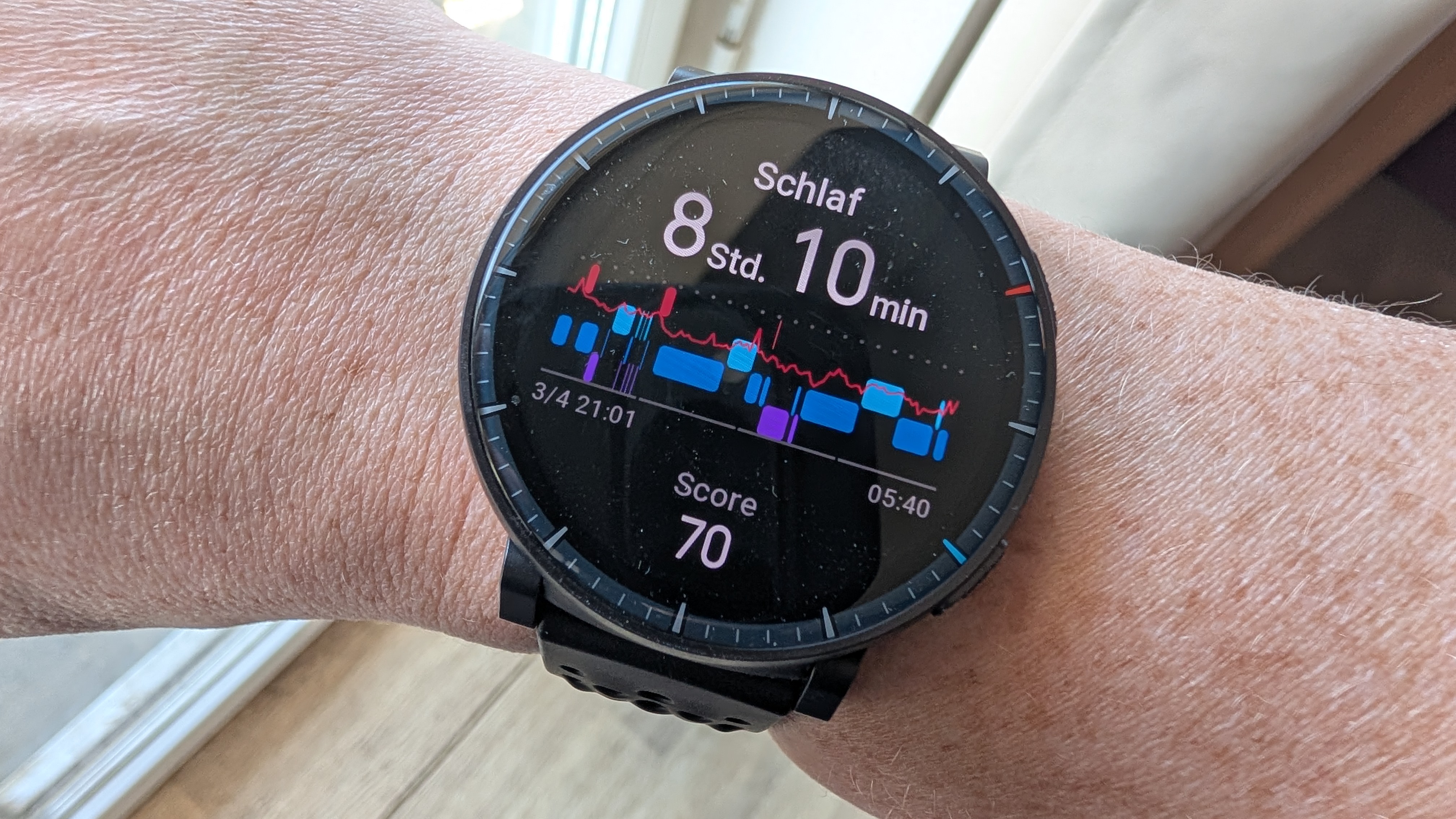 Die Vertix 2 verfügt selbstverständlich über eine integrierte Trackingfunktion für das Schlafverhalten seiner Nutzer, allerdings sollte man hier keine großen Überraschungen oder Innovationen erwarten. Einschlaf- und Aufwachzeitpunkt zeichnet die Uhr ebenso auf wie die Dauer der einzelnen Schlafphasen. Die Ergebnisse eignen sich, um langfristige Trends auszumachen, und sind in etwa mit den Messungen unseres Kontrollgeräts (Garmin Fenix 6) vergleichbar.