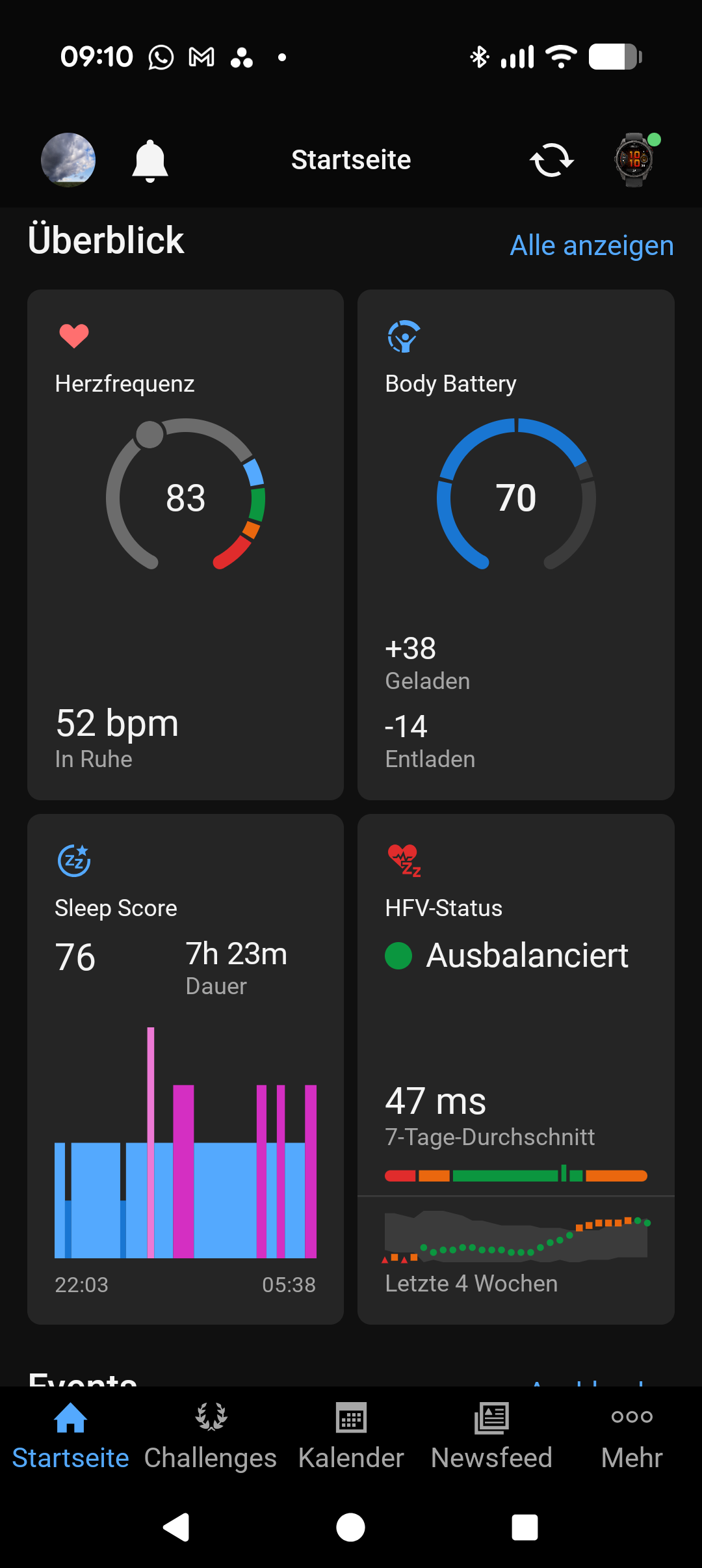 Das etwas eigenwillige Design der Garmin Connect App erfordert zunächst etwas Eingewöhnung, vorrangig für Nutzer, die von anderen Smartwatch-Plattformen wechseln. Die App kombiniert ein Kachel-Prinzip mit scrollbaren Diagrammansichten. Die meisten Elemente der Startseite lassen sich individuell anpassen und neu anordnen, die Bedienung wirkt dabei jedoch stellenweise etwas umständlich, da sich gesuchte Funktionen nicht immer sofort finden lassen. Mit etwas Einarbeitungszeit gewöhnt man sich jedoch schnell an Struktur und Design. Ein klarer Vorteil gegenüber vielen Konkurrenzlösungen ist die große Menge an erfassten und aufbereiteten Daten, die Garmin Connect bereitstellt.