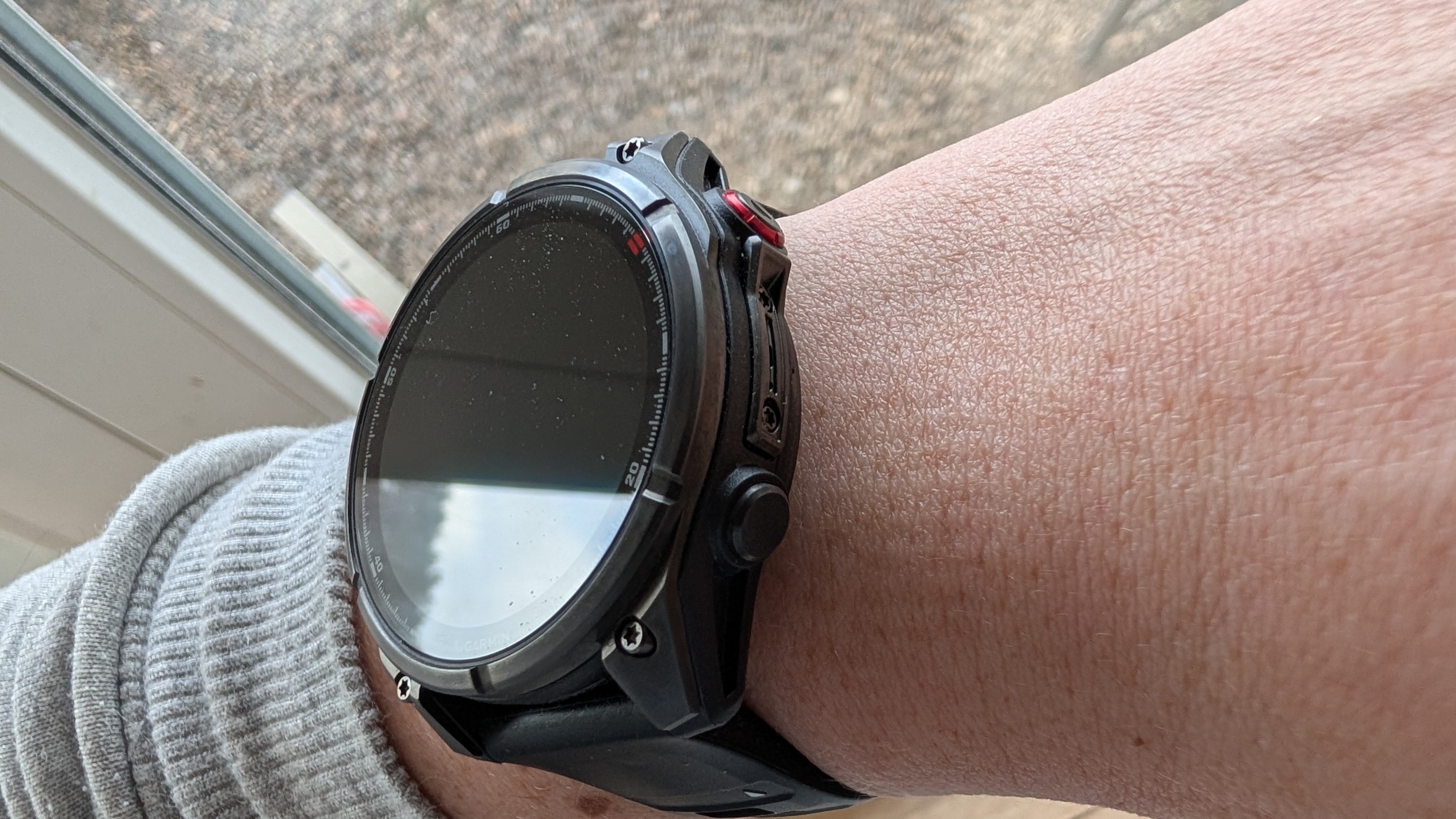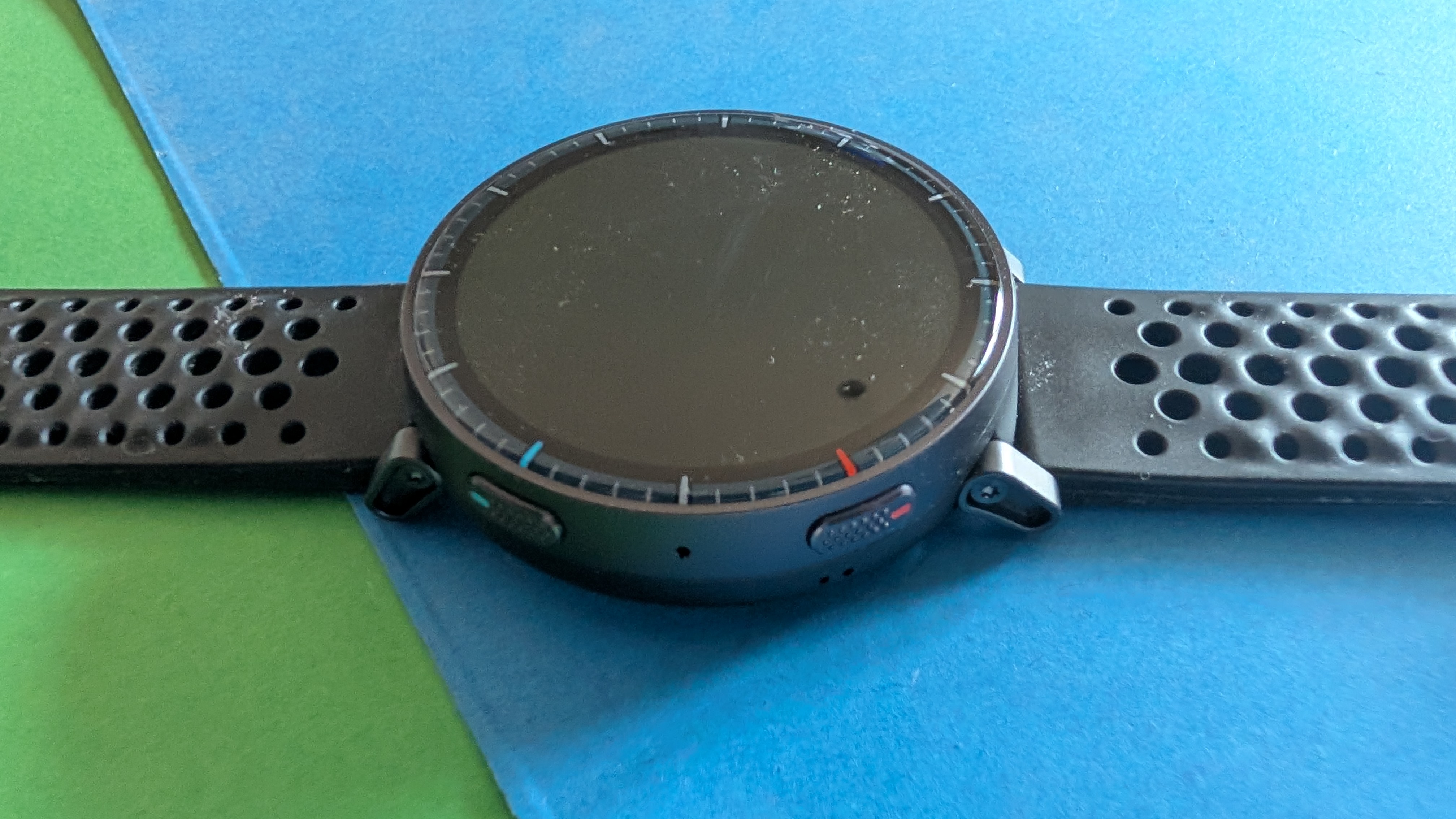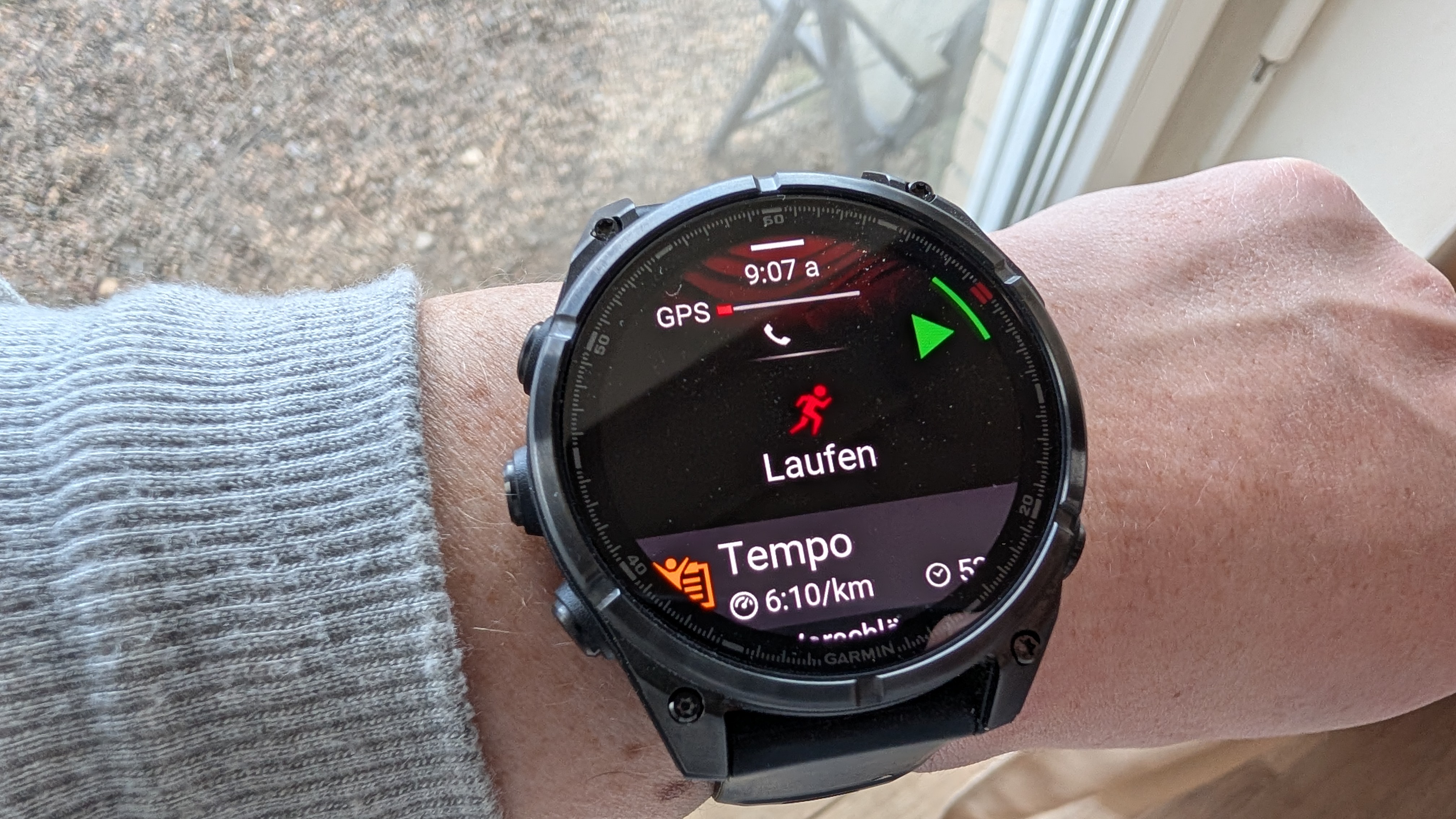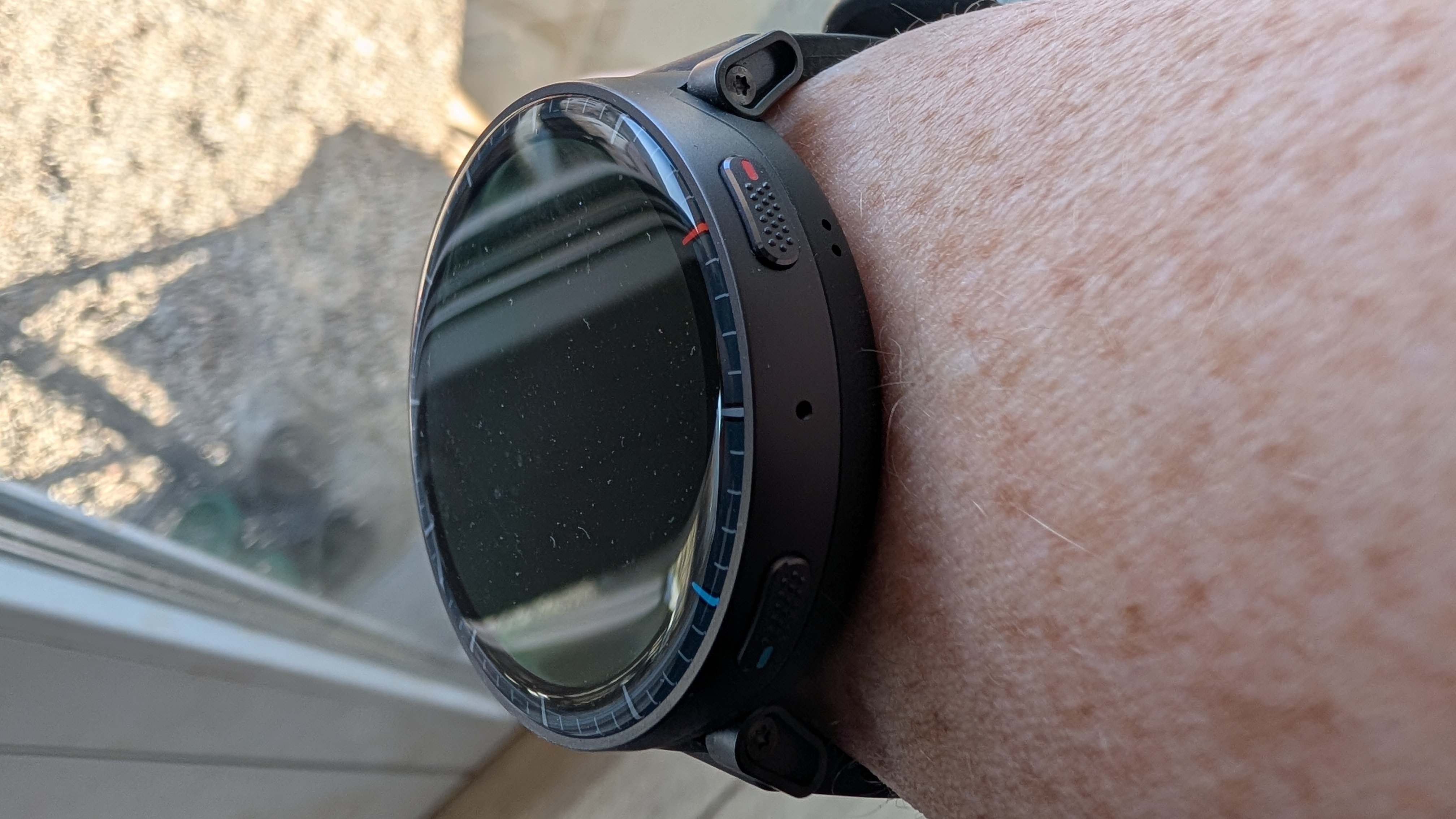 Dieser Fehler tritt übrigens auch auf, wenn man die Tastensperre im normalen Smartwatch–Gebrauch aktiviert hat: Denn erhalten wir eine Benachrichtigung, wird das Display automatisch entsperrt. Knickt man dann das Handgelenk ab, springt die Uhr ins Traingsmenü und aktiviert unter Umständen automatisch die Aufzeichnung einer Trainingseinheit, obwohl wir das gar nicht wollen. In unserem Test trat dieses Problem mehrmals täglich auf. Der Grund dafür liegt in dem wuchtigen Gehäuse der Uhr und der Position der Drehkrone. Bereits ein Abknicken des Handgelenks im 45-Grad-Winkel reichte, um die Krone zu aktivieren. Zwar könnte man die Uhr weiter oben am Unterarm positionieren, wäre dann aber für eine brauchbare Pulsmessung definitiv auf einen Brustgurt angewiesen.